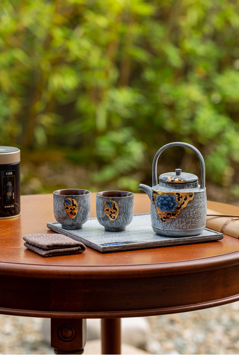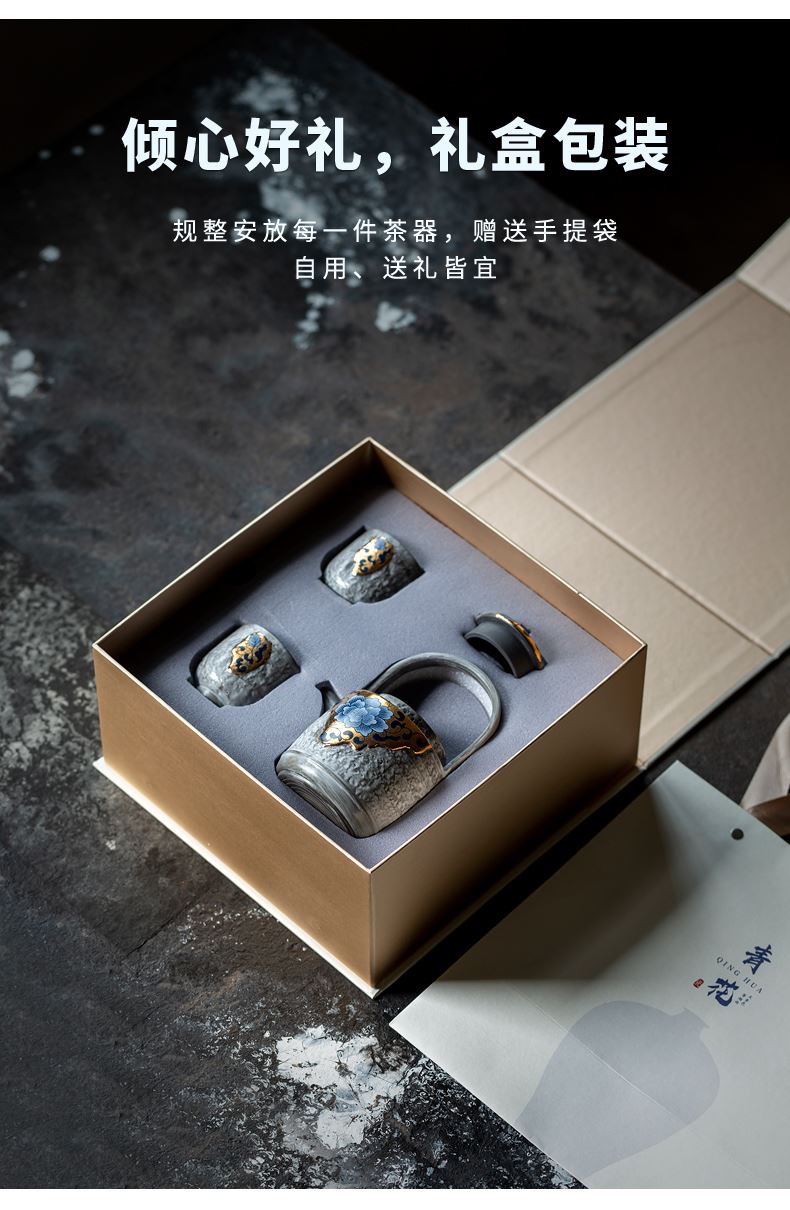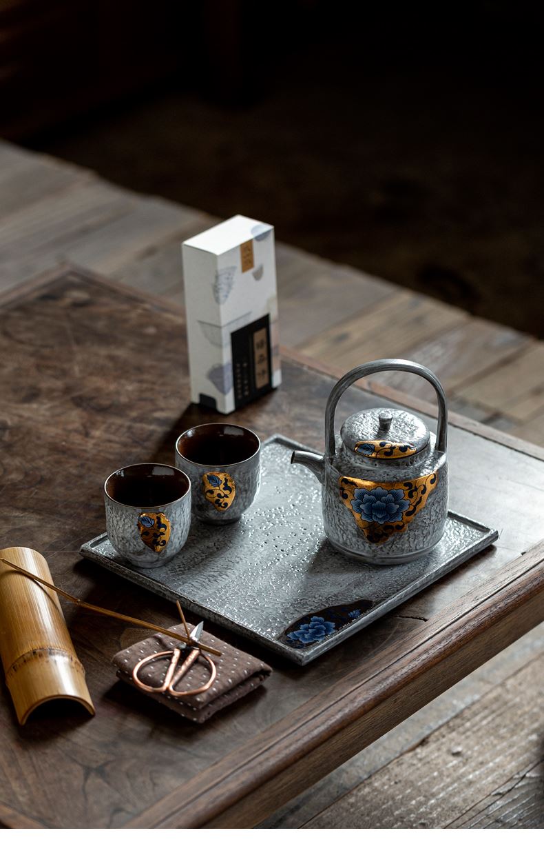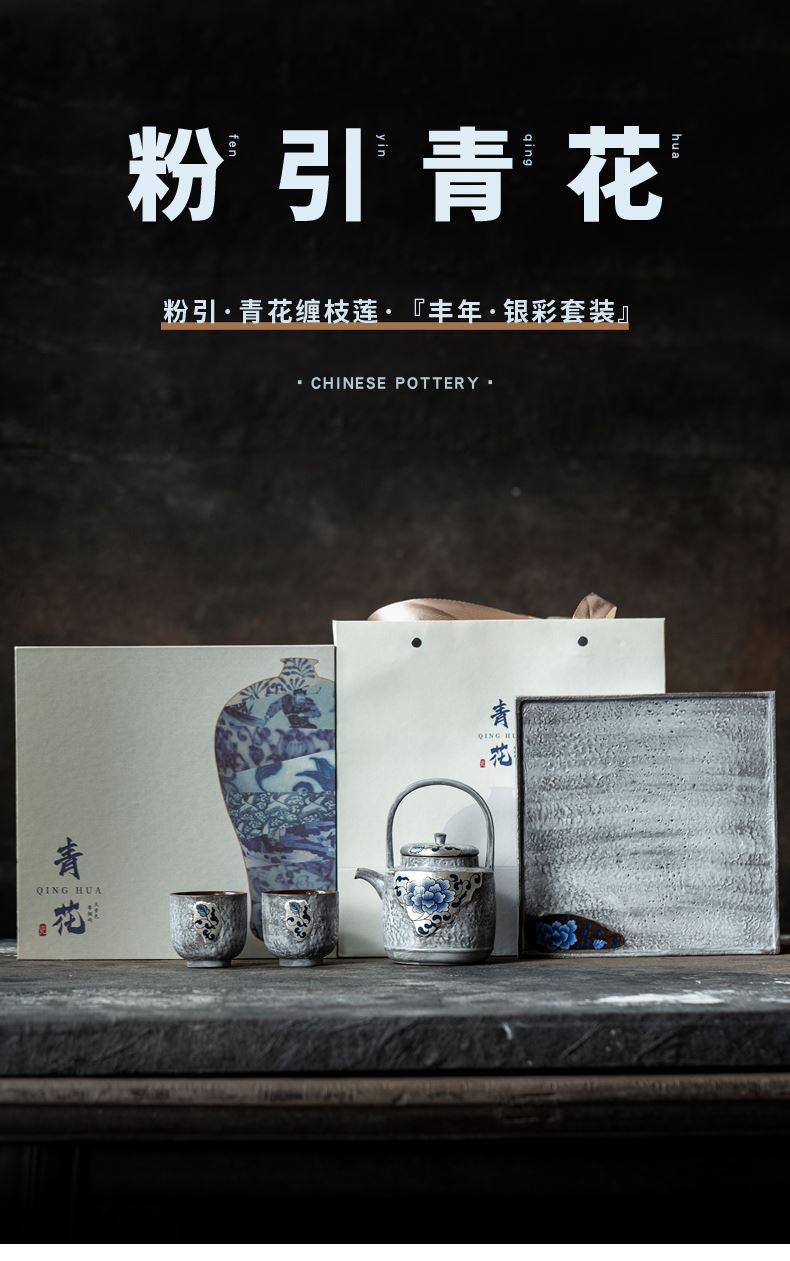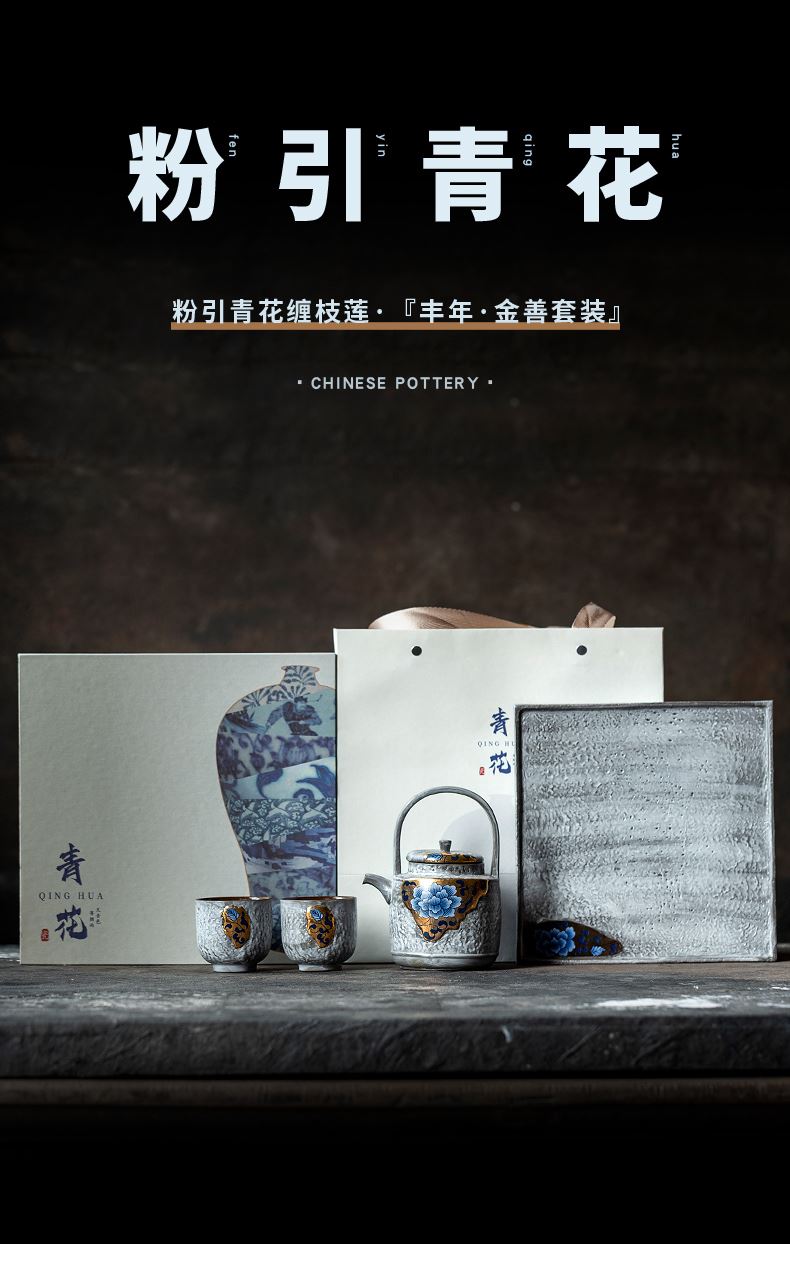 尾桥下窑粉引青花鎏金银提梁壶丰年金善茶具套装茶室会所节日礼品