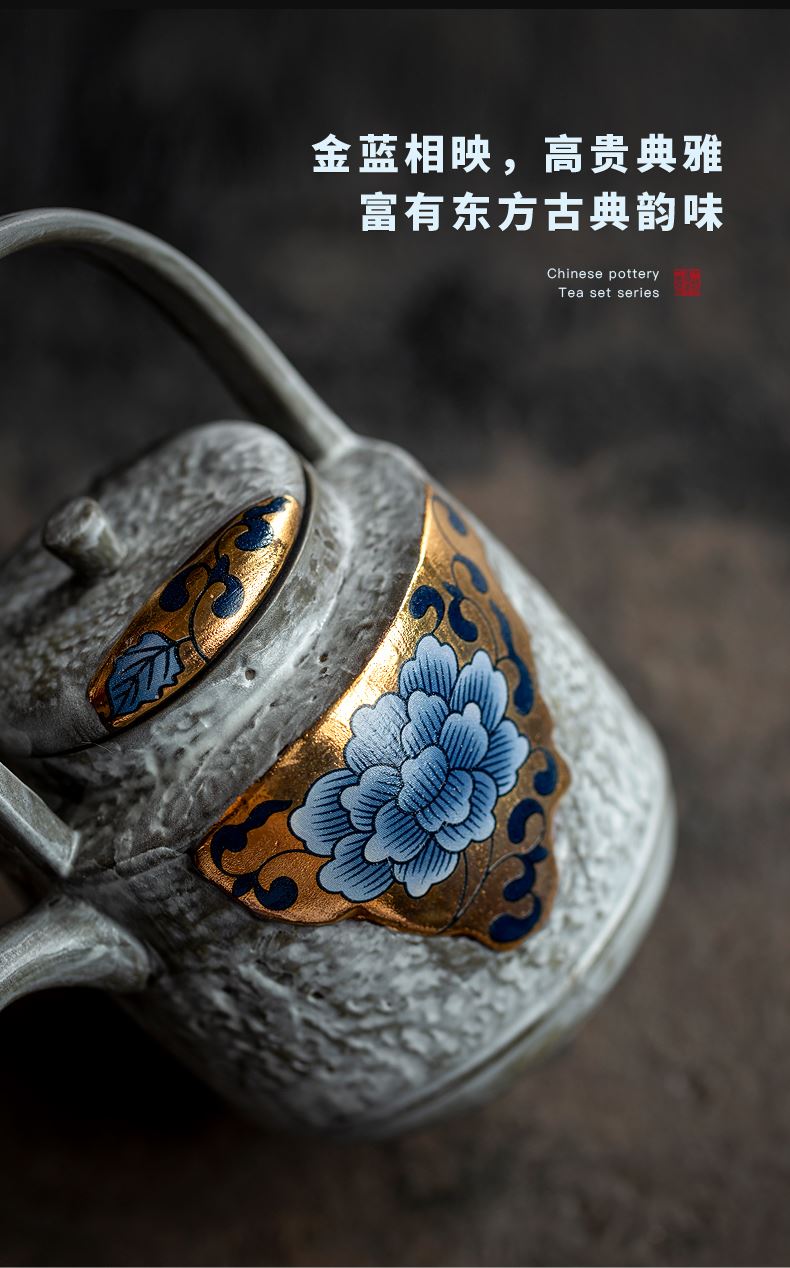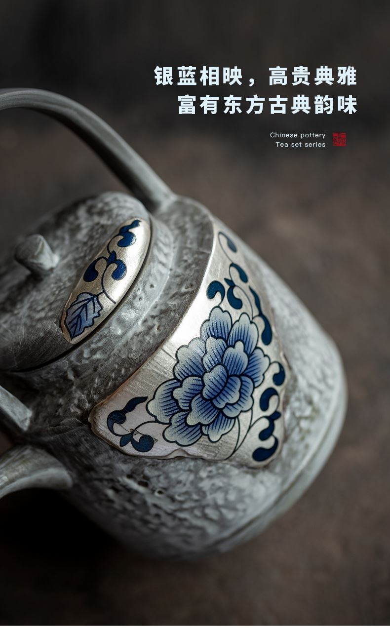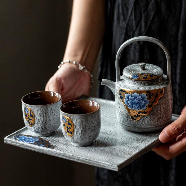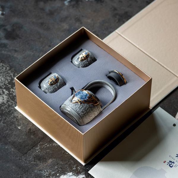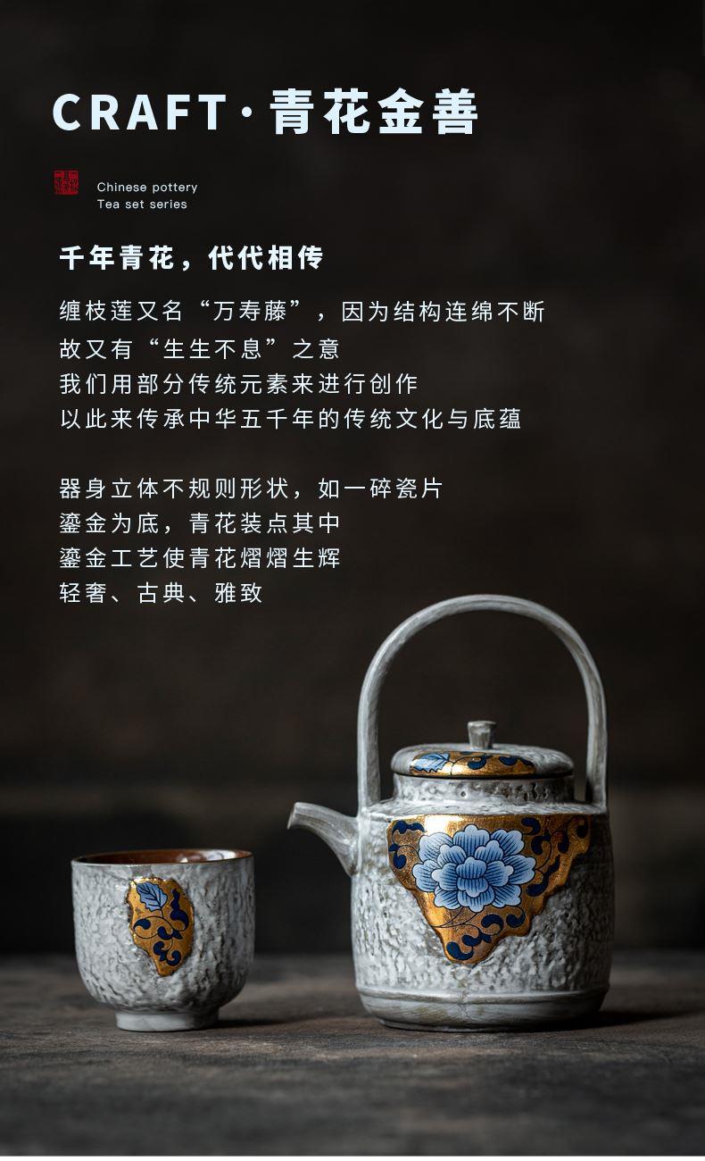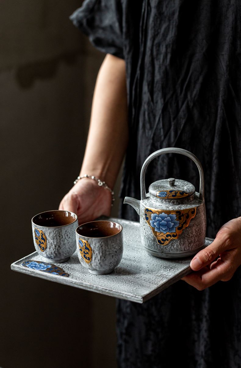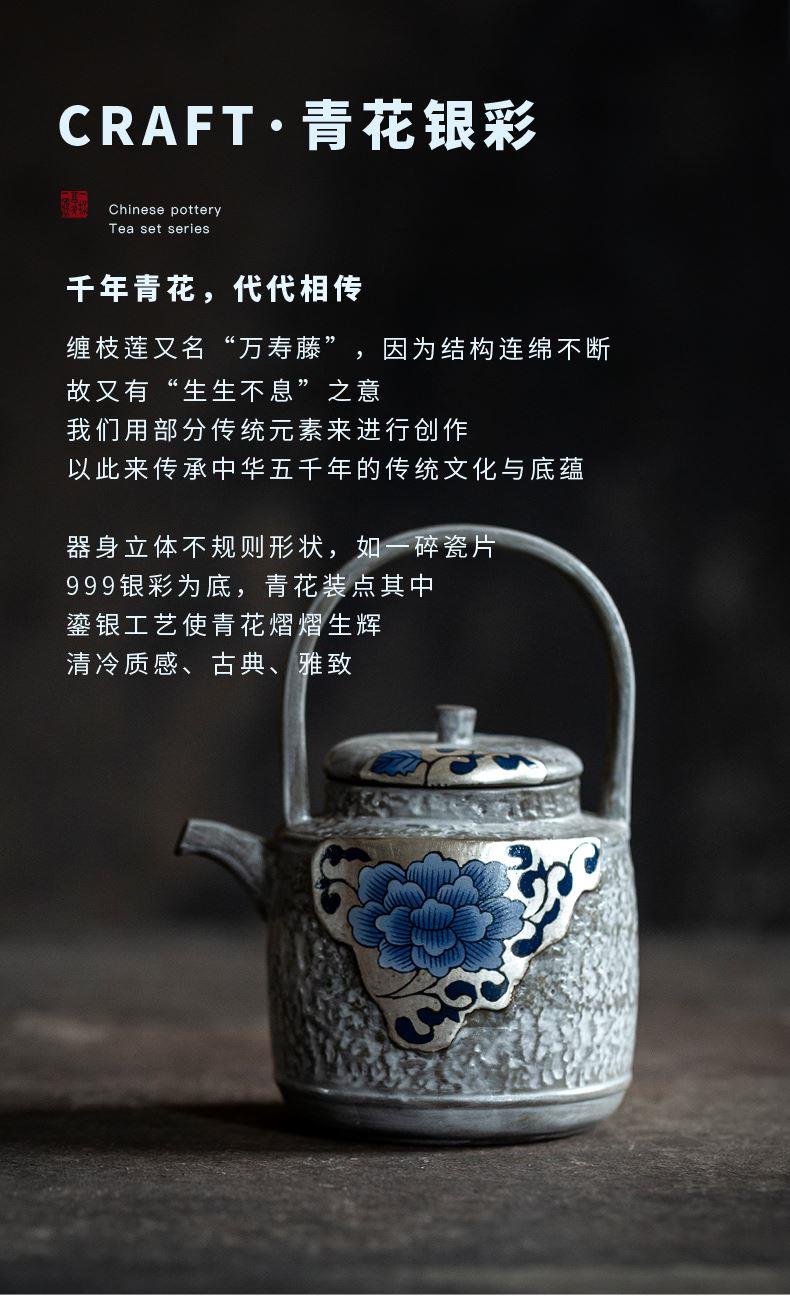 尾桥下窑粉引青花鎏金银提梁壶丰年金善茶具套装茶室会所节日礼品