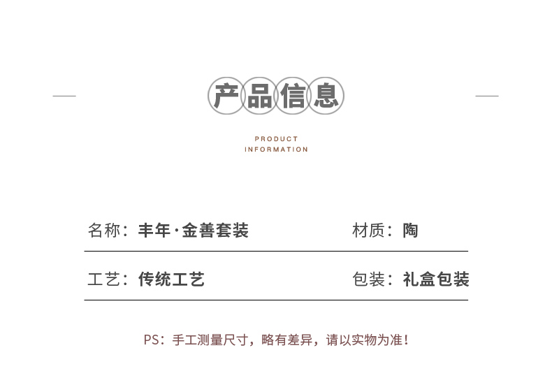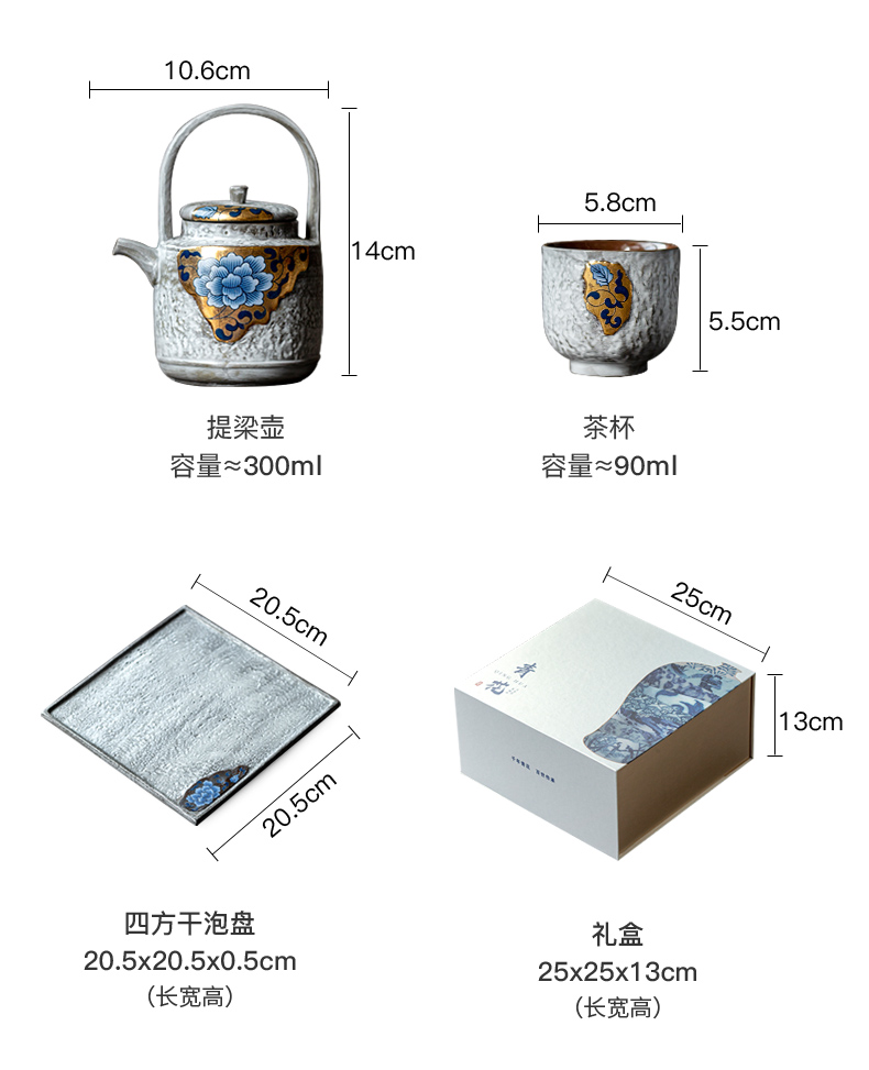 配置:提梁壶*1,茶杯*2,干泡盘*1. 颜色:鎏金/鎏银 尺寸:提梁壶10.6*14cm 容量300ml, 茶杯5.8*5.5cm 容量90ml, 干泡盘20.5*20.5*0.5cm, 礼盒:25*25*13cm。
