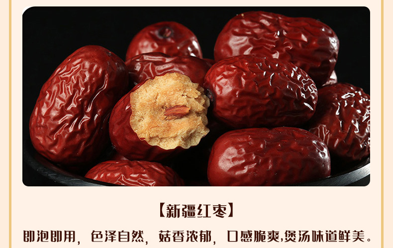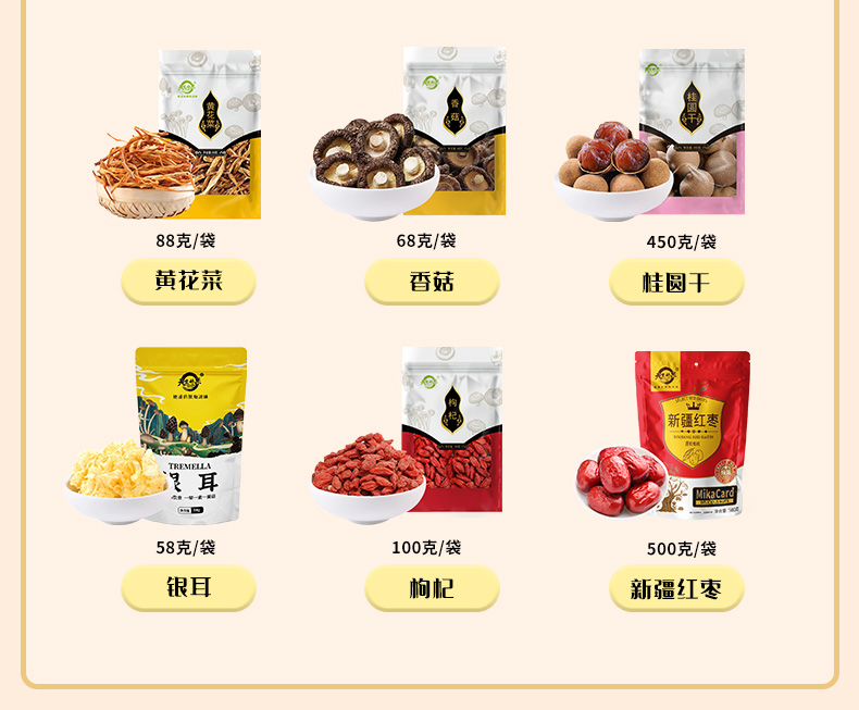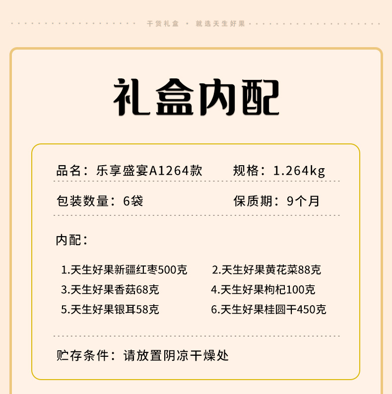 彩盒尺寸:400*180*300mm 产品规格:1244克(6袋装) 内配: 1.天生好果新疆红枣500克 2.天生好果果黄花菜88克 3.天生好果香菇68克 4.天生好果枸杞100克 5.天生好果银耳58克 6.天生好果桂圆干 450克