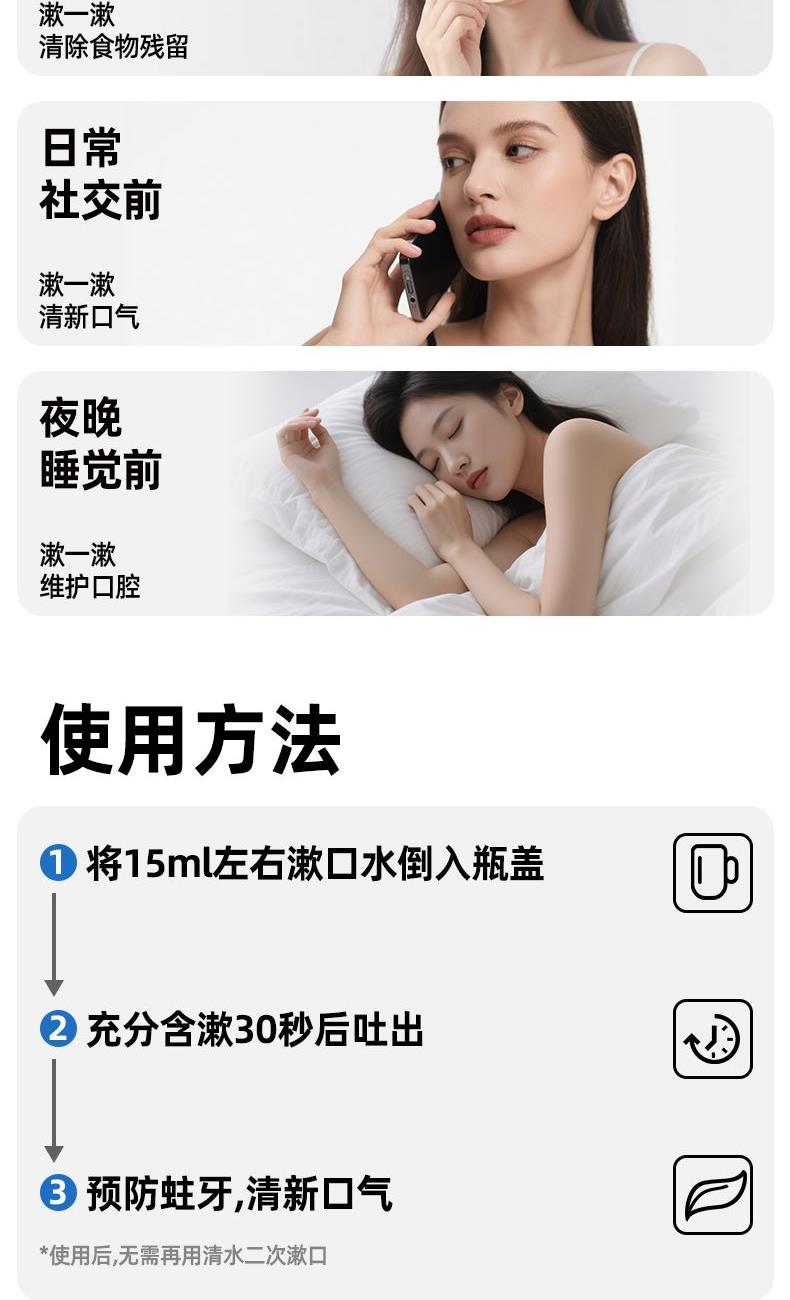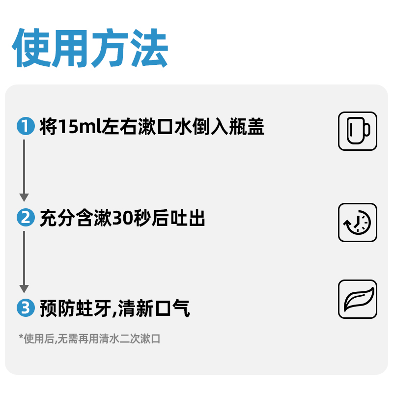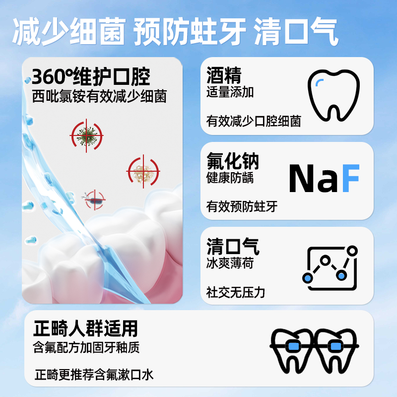 容量:500ml 保质期:5年 1.含氟防蛀减菌,冰爽薄荷去口气 2.氟化钠可增强牙齿抗龋齿能力减少致龋细菌的活性 3.西吡氯铵强效减菌,减少有害菌群,减少牙菌斑形成,改善口腔异味 4.200ppm:氟化钠(0.02%,以氟计)