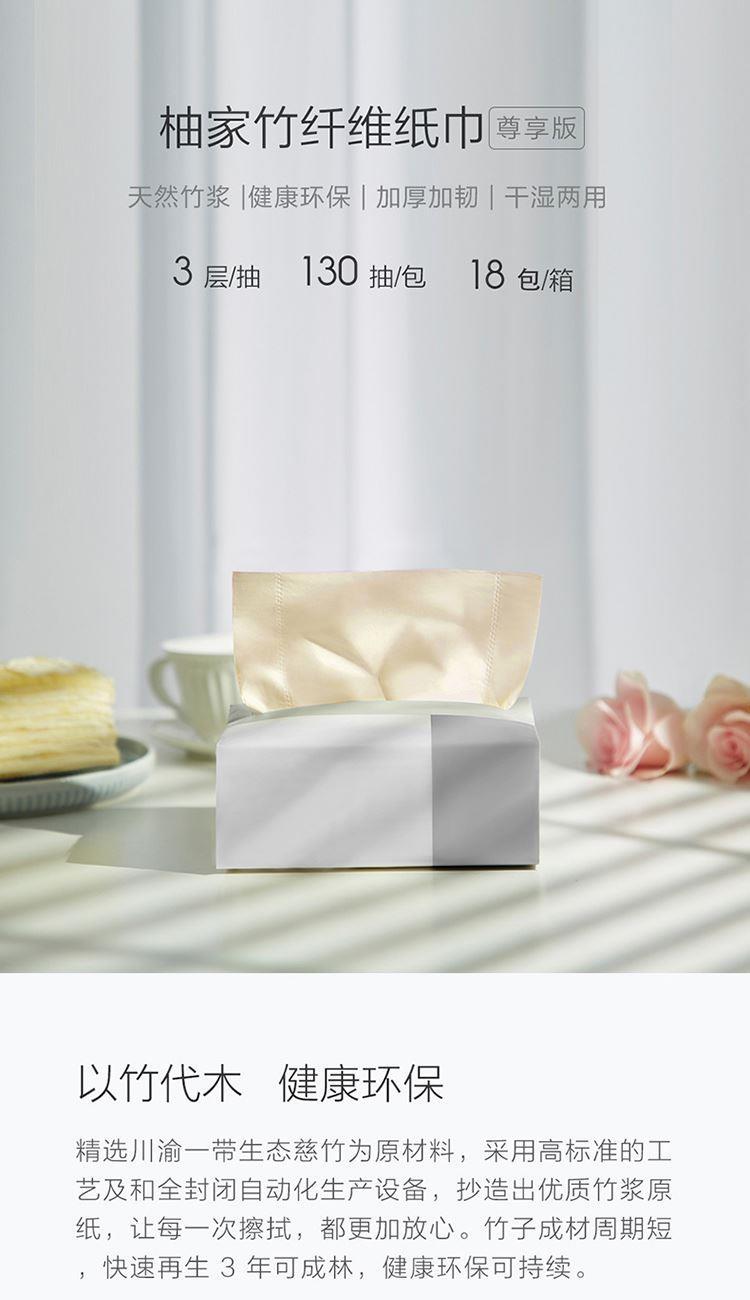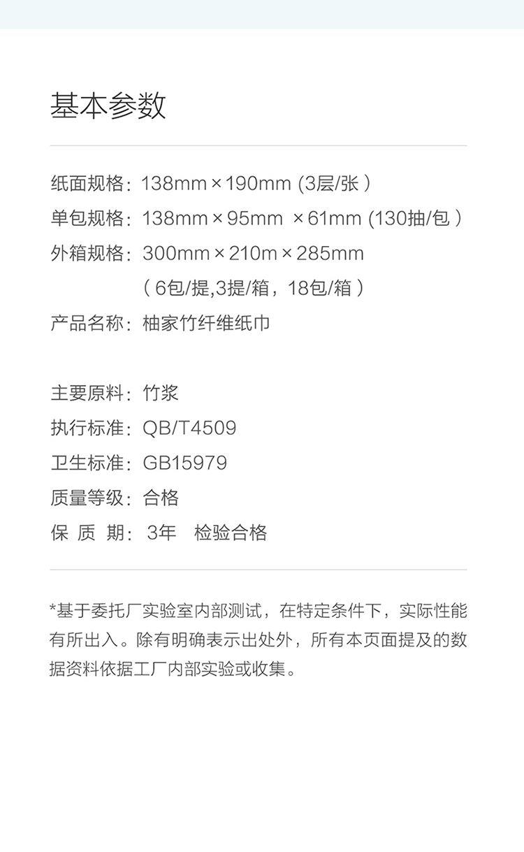纸面规格:138×190mm(3层/张) 单包规格:135×95 ×65mm (130抽/包) 外箱尺寸:300×210×285mm(6包/提) 主要原料:原生竹浆 保 质 期:3年