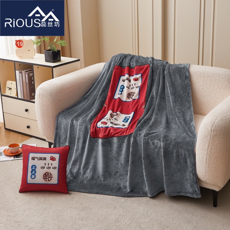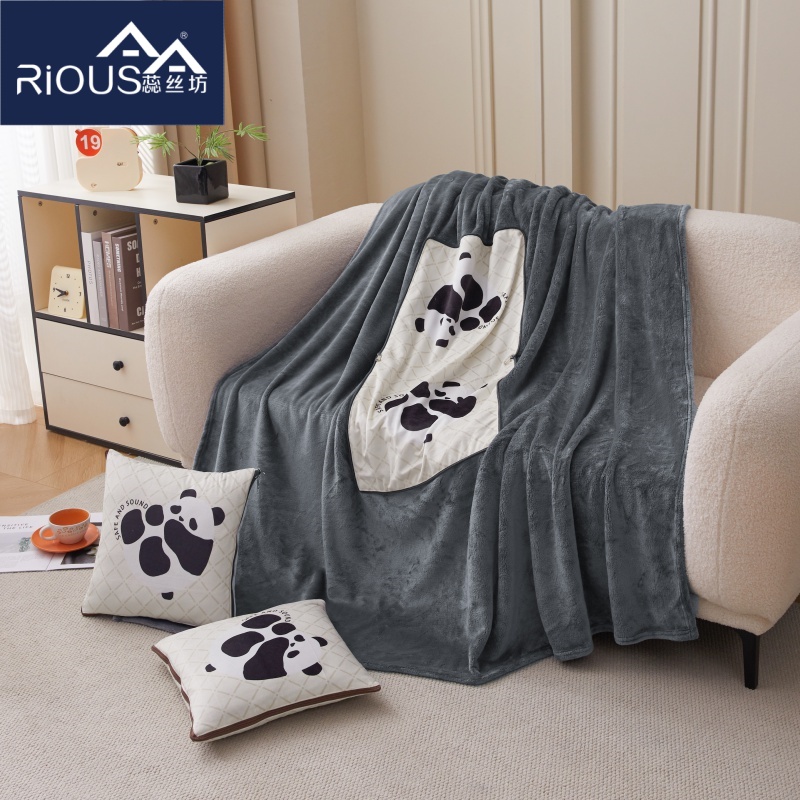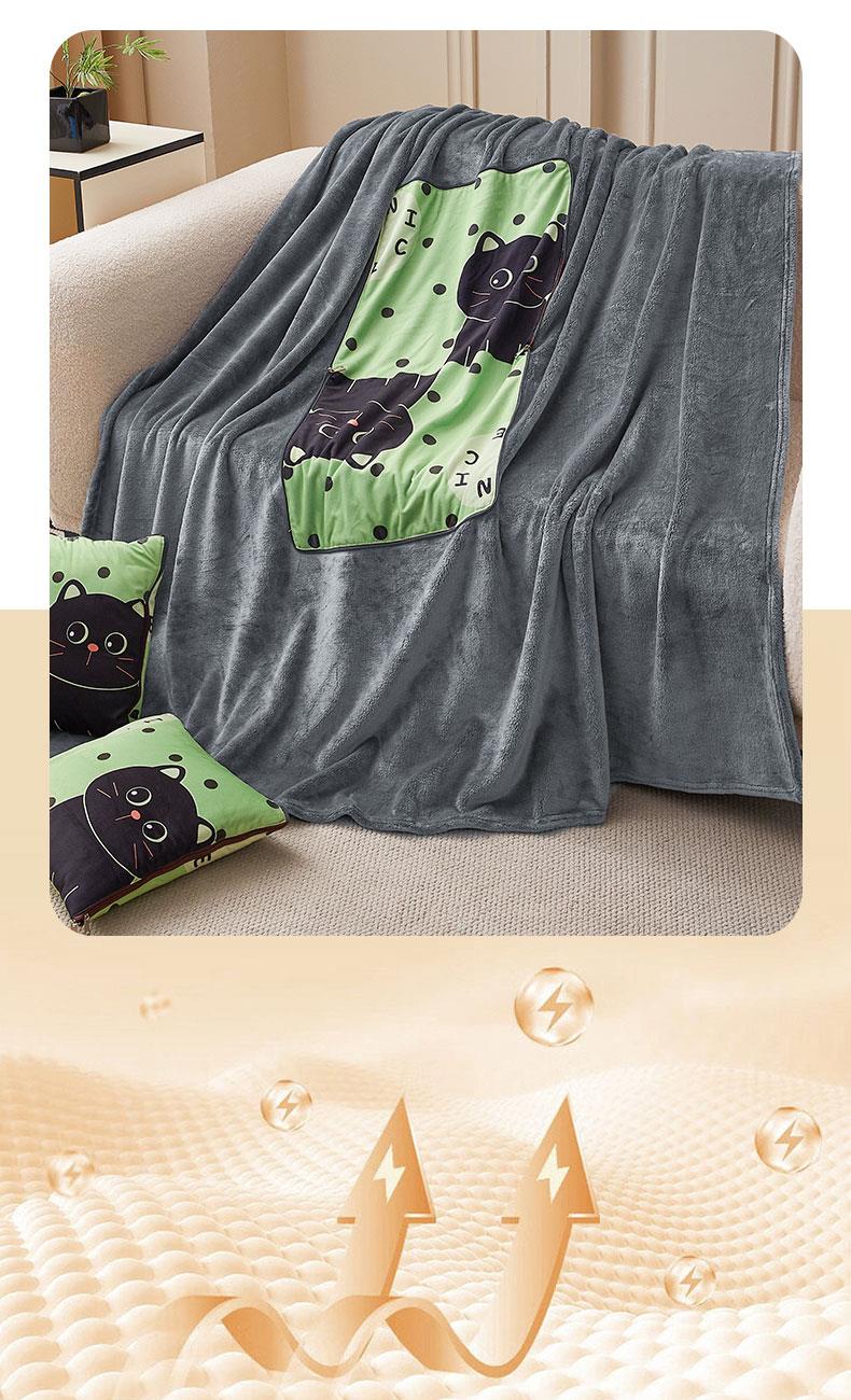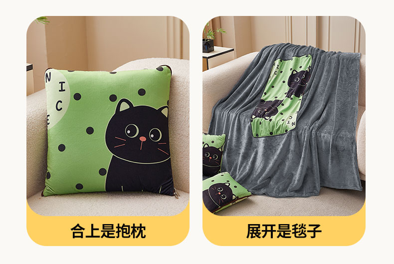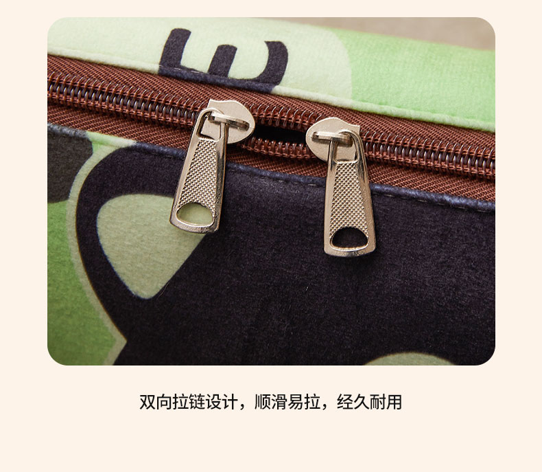 花色:绿色猫咪、LOVE熊、爱心熊猫、暴富、嘟嘟熊、 福气满满、萌狗、趴趴熊、三个朋友、眼镜鸭、竹叶熊猫 规格:折叠37*37cm展开120*160cm 面料:水晶绒+双面法莱绒(聚酯纤维) 双面高克重法莱绒面料,绒毛细密,一触即暖;印花部分水晶绒面料,保暖透气不闷汗。植入导电丝,减少干燥天气带来的静电烦恼;新一代活性印染,色牢度高,不易褪色,不惧机洗水洗;细密卷边工艺,针脚紧密,耐磨耐用;双向拉链设计,顺滑易拉,经久耐用。