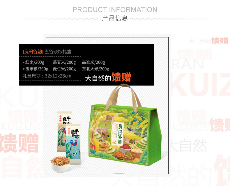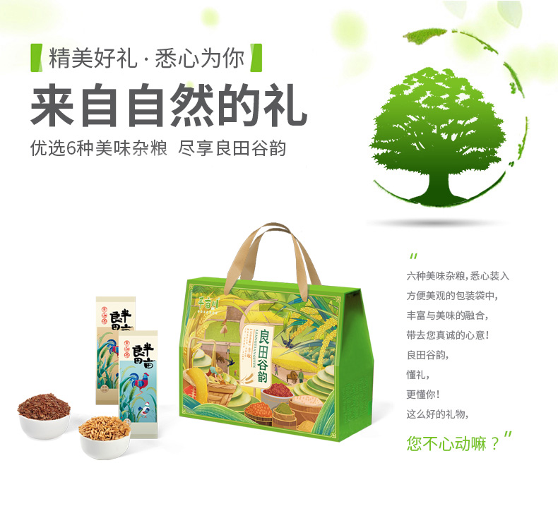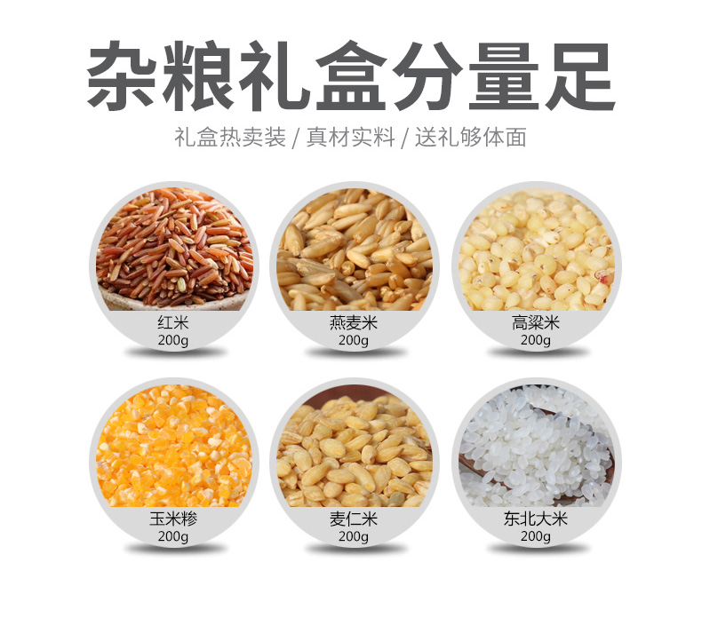 产品配置: 精选红米200g 精选燕麦米200g 精选高粱米200g 精选玉米糁200g 精选麦仁米200g 精选东北大米200g 净含量:1.2Kg 礼盒尺寸:34*11*28cm 六款谷物,一盒囊括。燕麦清香,玉米糁甜润,粗粮细粮巧妙搭配,满足味蕾,吃进健康。