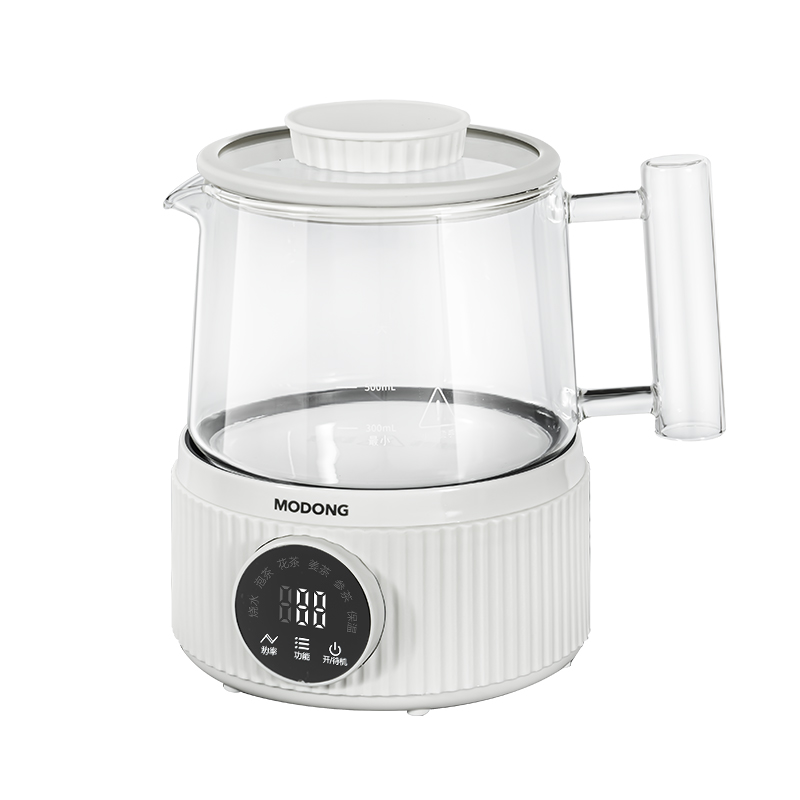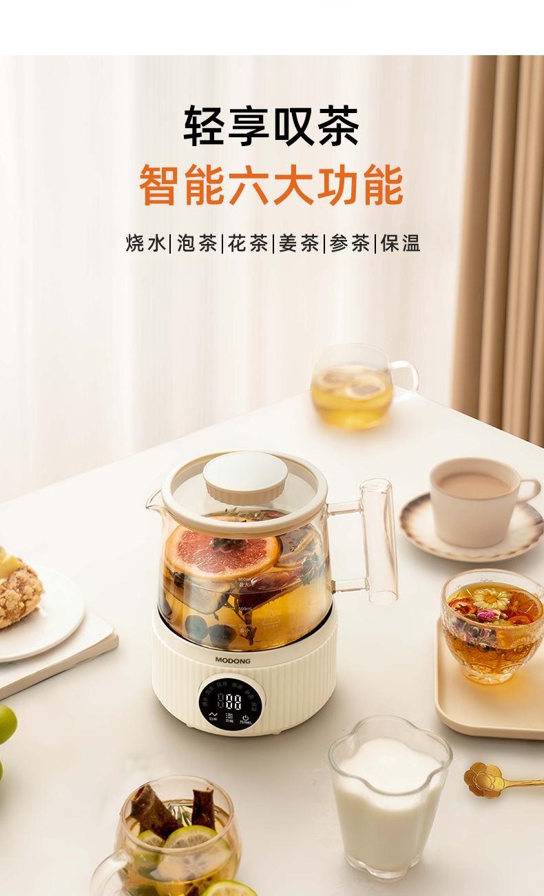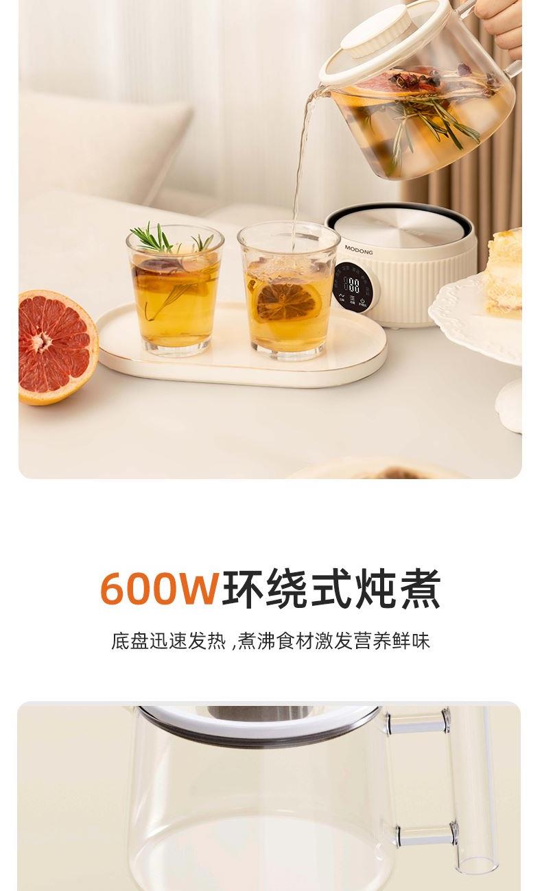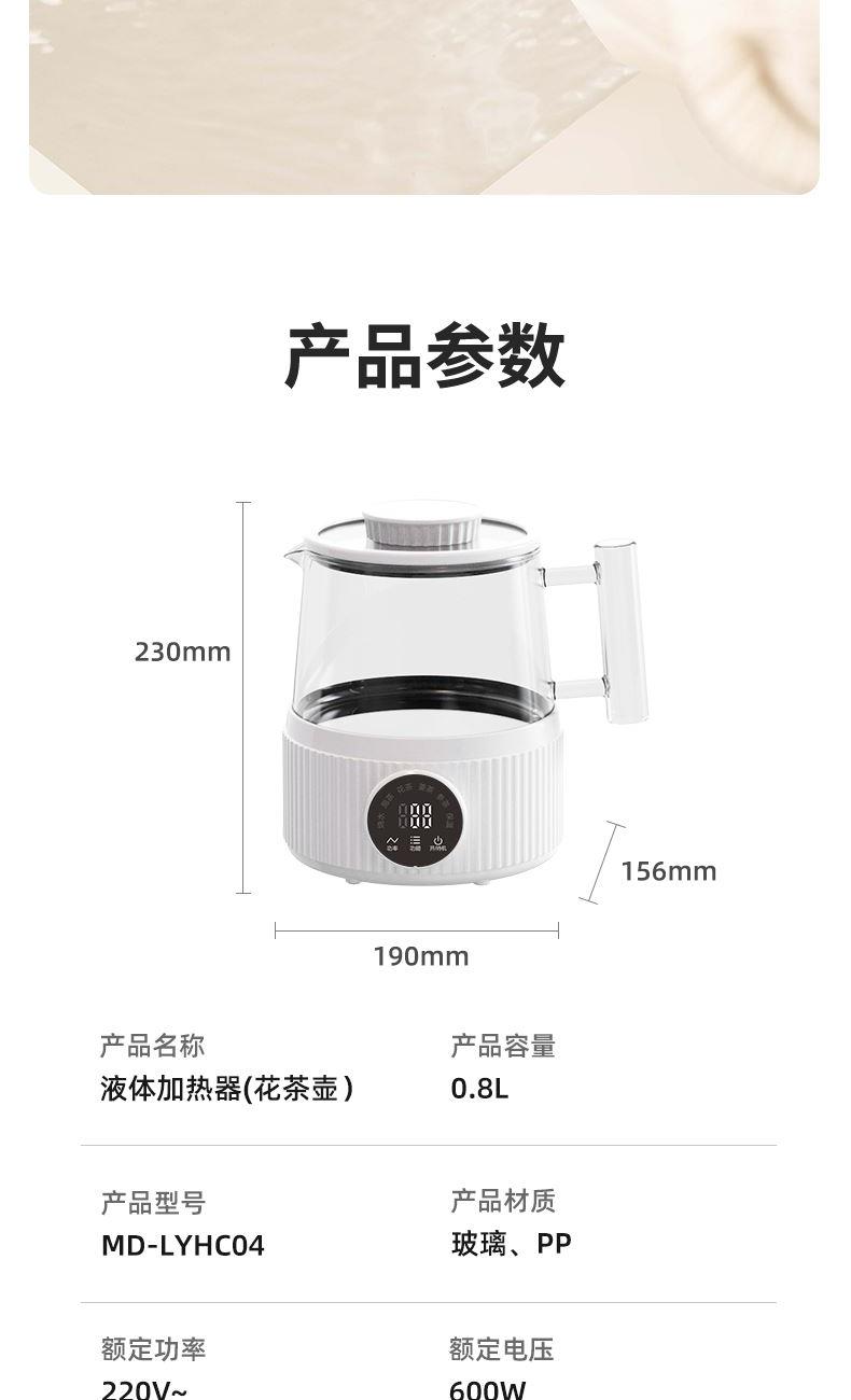 产品净重:1.18KG 产品毛重:1.54KG 额定功率:600W 额定电压:220V~ 容量:0.8L 内含:主机x1、800ML玻璃花茶壶杯x1、说明书x1 1.全身玻璃,防烫把手,全身水洗不藏垢, 2.大容量0.8L,100-600W多功率可选 3.微电脑灵敏触选,轻松烹煮花样茶饮 4.持久保温4H,温度可调,有提壶记忆功能 5.三重安全防护,防干烧。热熔点保护、温控器保护