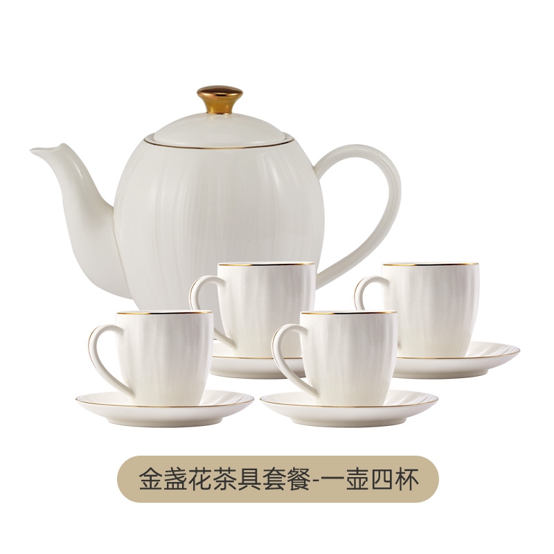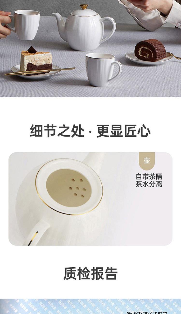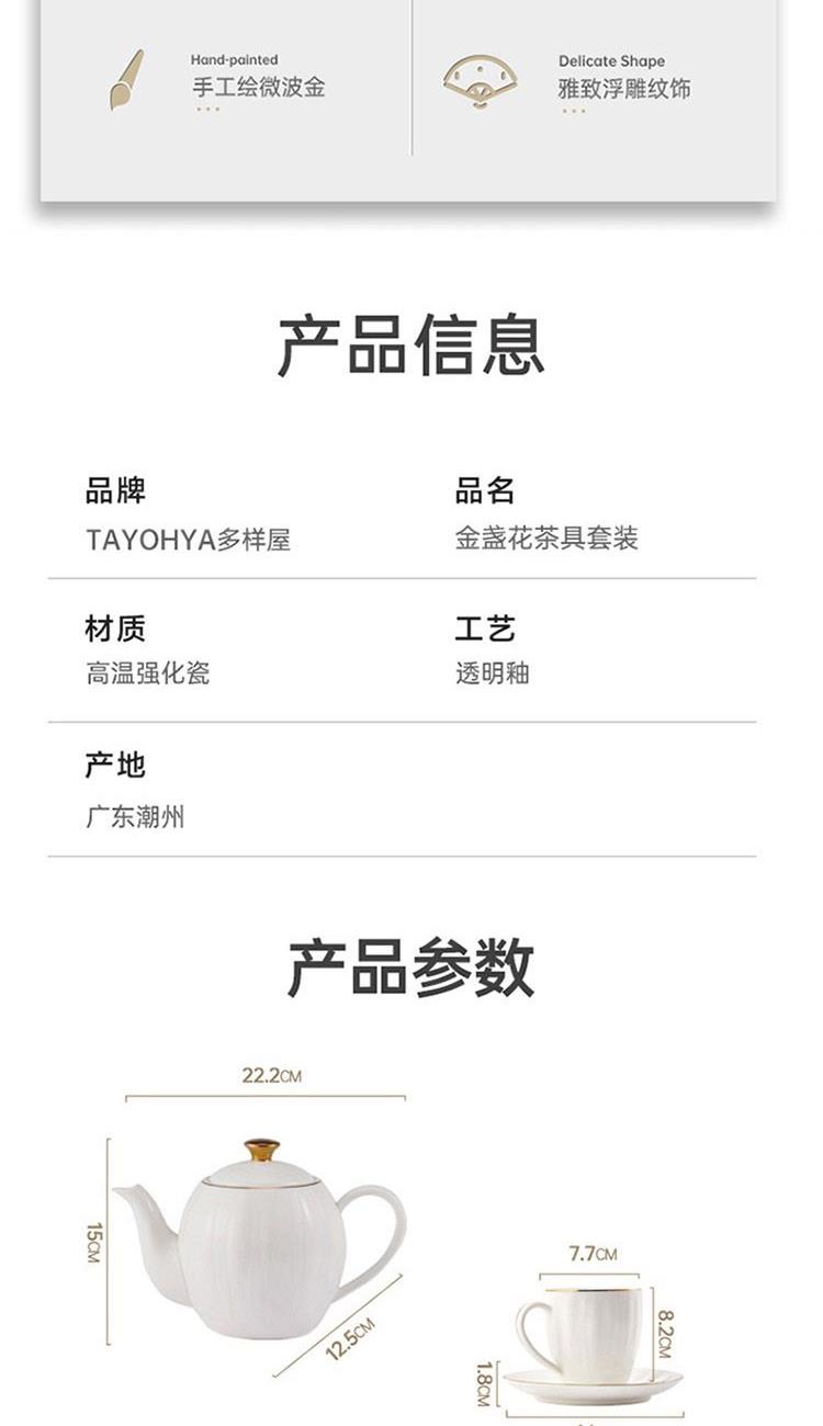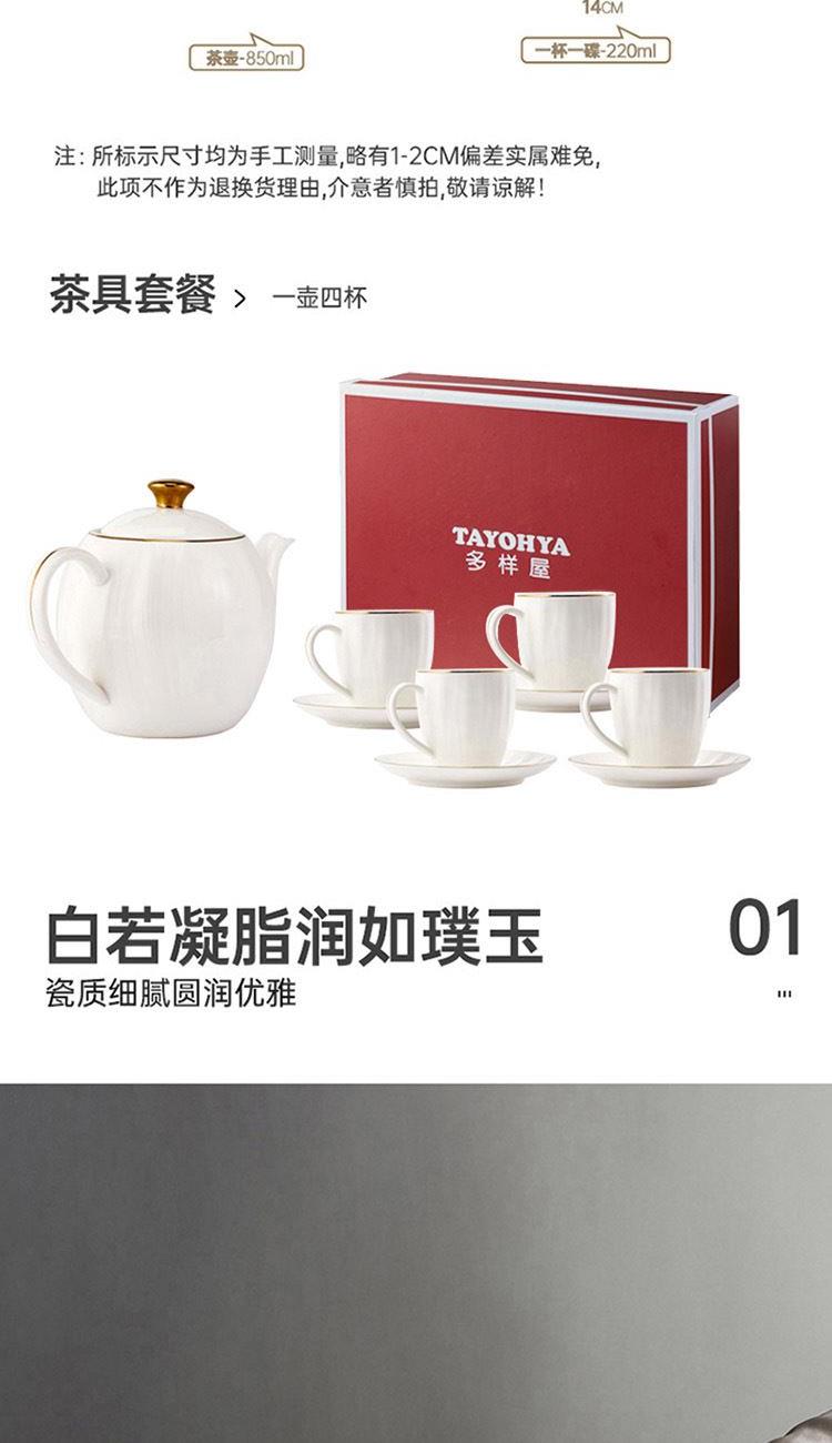 货号:TA040302027ZZ 材质:高温强化瓷,工艺:透明釉 规格:壶*1只850ml,杯*4只220ml,碟*4只 高温匠心四次烧制,瓷坚耐磨,瓷面不易刮花;手工绘金边,可微波可蒸烤的金边餐具;色彩亮丽,釉中彩工艺,你的安心我们来保障;釉面光滑,清洗方便。