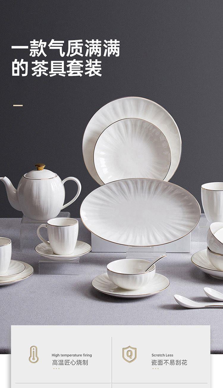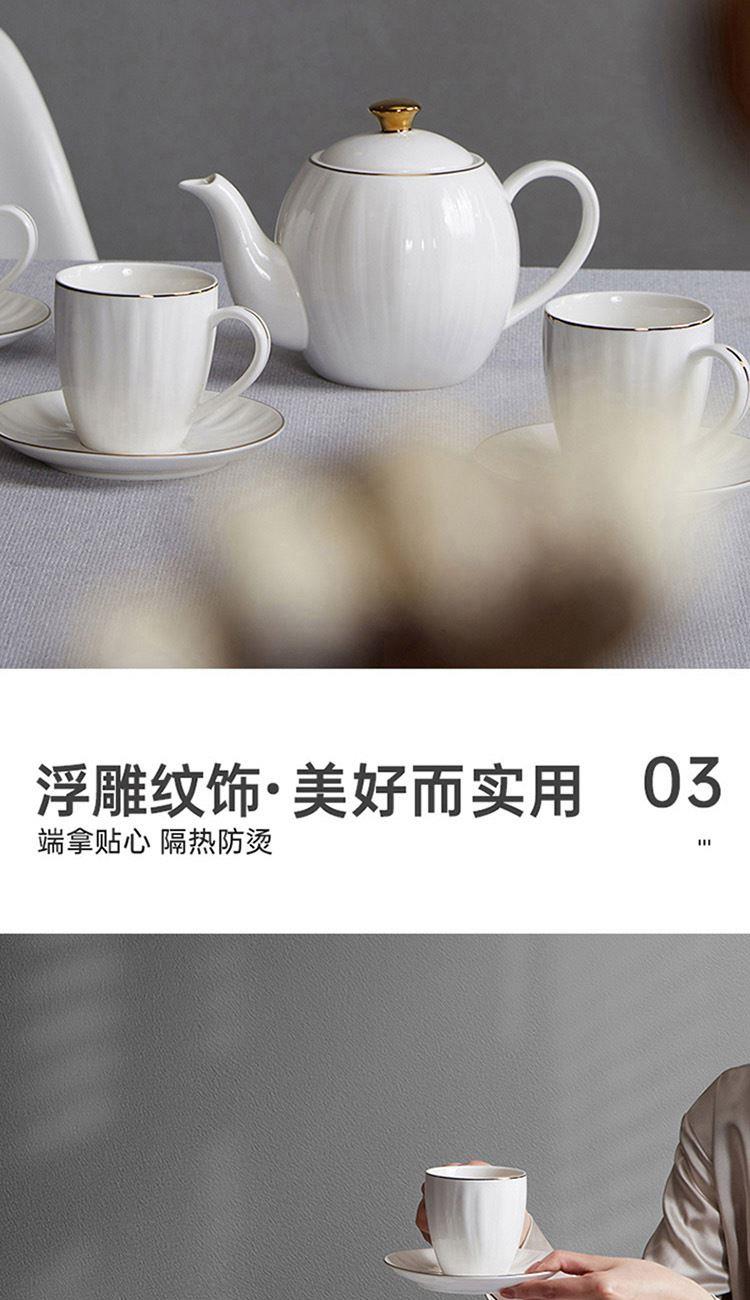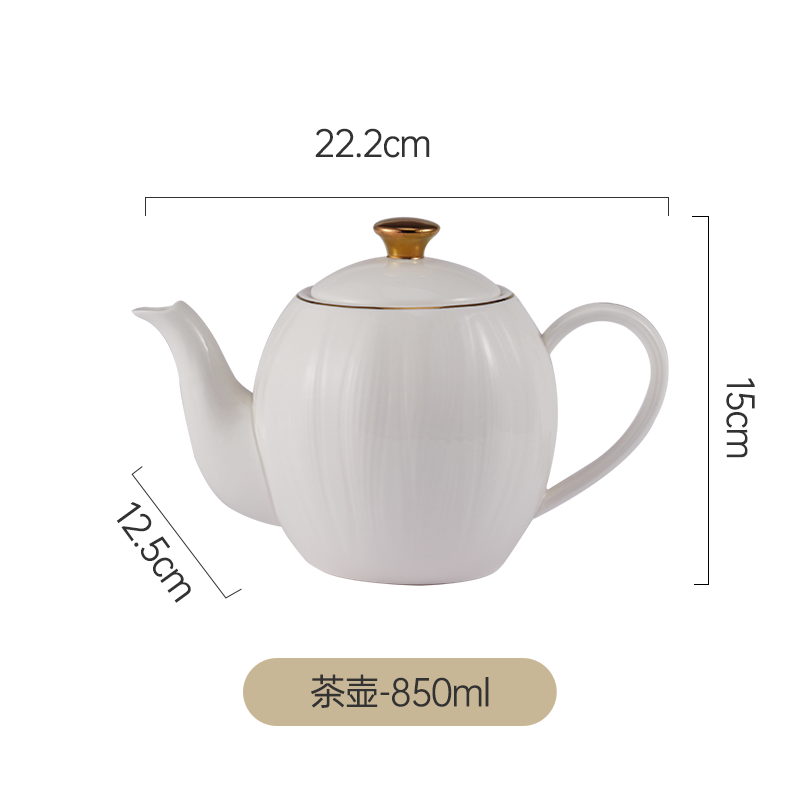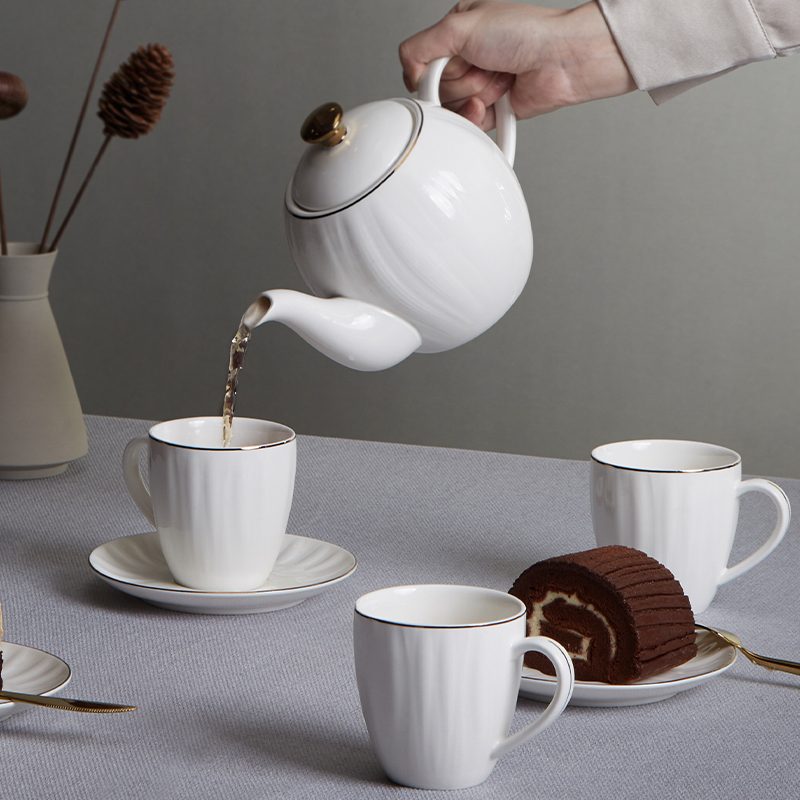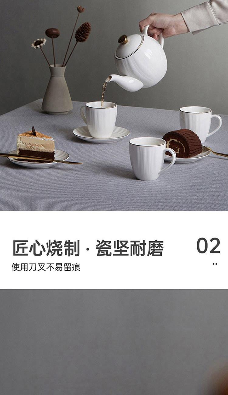 货号:TA040302027ZZ 材质:高温强化瓷,工艺:透明釉 规格:壶*1只850ml,杯*4只220ml,碟*4只 高温匠心四次烧制,瓷坚耐磨,瓷面不易刮花;手工绘金边,可微波可蒸烤的金边餐具;色彩亮丽,釉中彩工艺,你的安心我们来保障;釉面光滑,清洗方便。