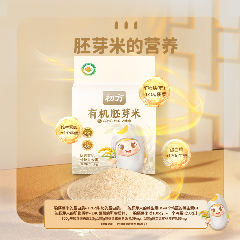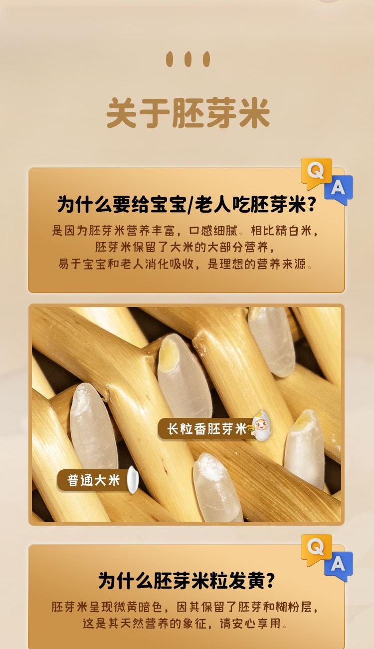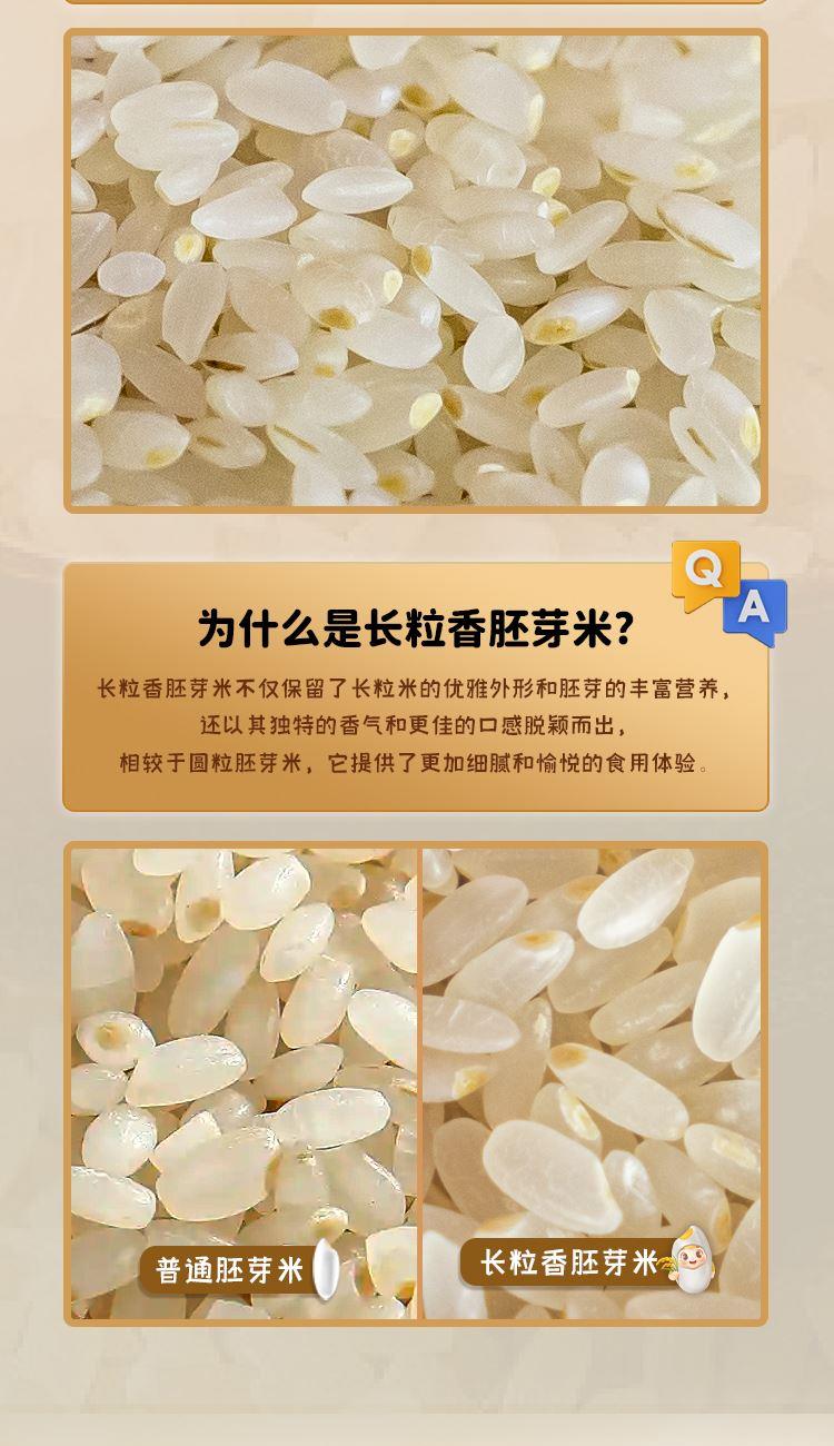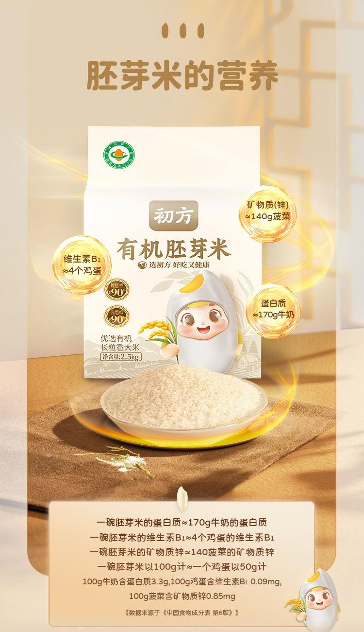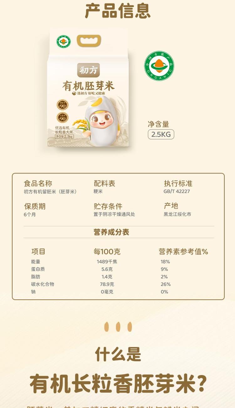①产地:庆安县 ②包装规格:2.5kg ③保质期:6个月 ④贮存条件:常温保存 ⑤产品卖点: 口感:优先长粒香大米比市面上的普通胚芽更香,口感更好,由于保留了胚芽和部分糠层,口感比精白米略粗糙,但更有嚼劲。(初方长粒香胚芽米 蒸饭 煮粥 宝宝辅食口感上佳) 颜色偏黄:胚芽部分使米粒呈现淡黄色。 保质期较短,需尽快食用或冷藏保存。 双有机认证 SGS检测机构 704项无农残 高于检测标准2倍