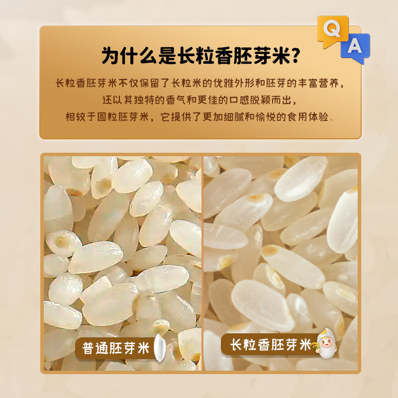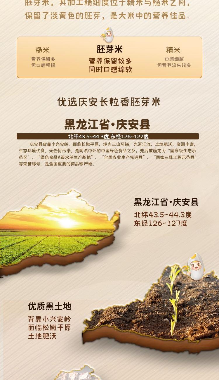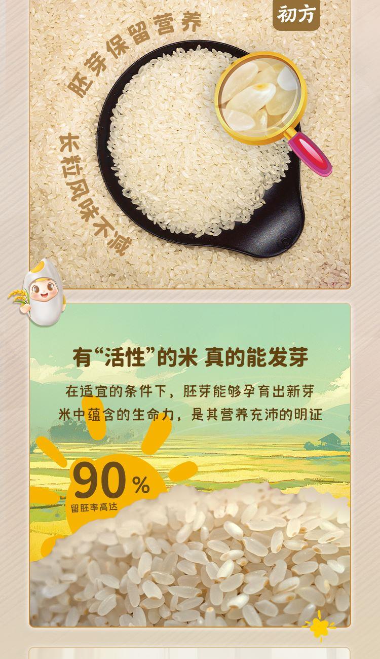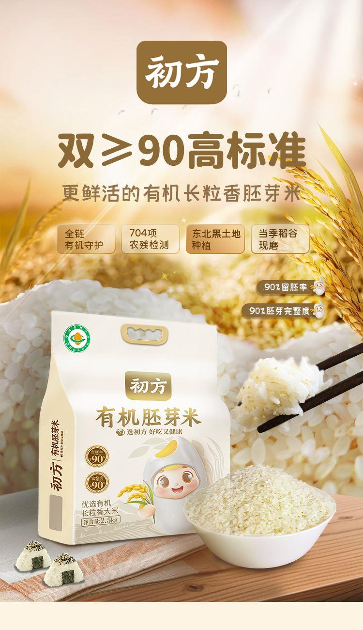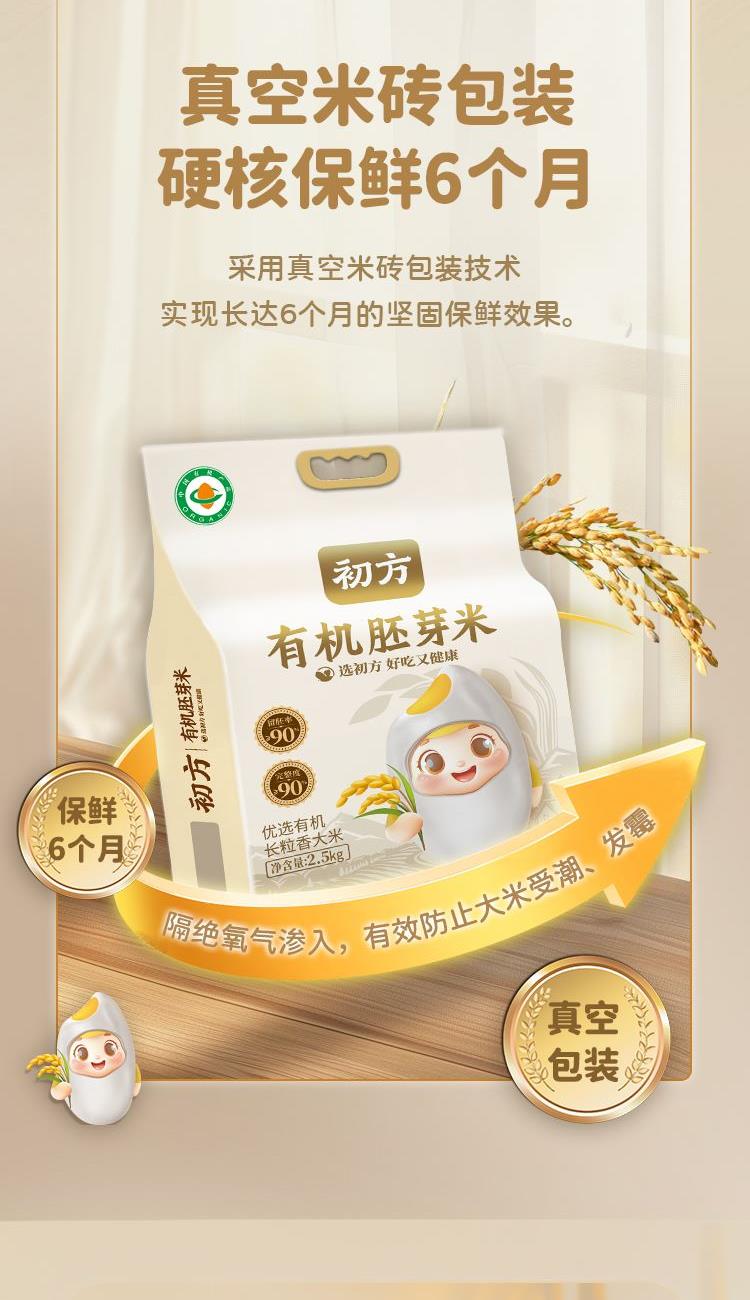 ①产地:庆安县 ②包装规格:2.5kg ③保质期:6个月 ④贮存条件:常温保存 ⑤产品卖点: 口感:优先长粒香大米比市面上的普通胚芽更香,口感更好,由于保留了胚芽和部分糠层,口感比精白米略粗糙,但更有嚼劲。(初方长粒香胚芽米 蒸饭 煮粥 宝宝辅食口感上佳) 颜色偏黄:胚芽部分使米粒呈现淡黄色。 保质期较短,需尽快食用或冷藏保存。 双有机认证 SGS检测机构 704项无农残 高于检测标准2倍