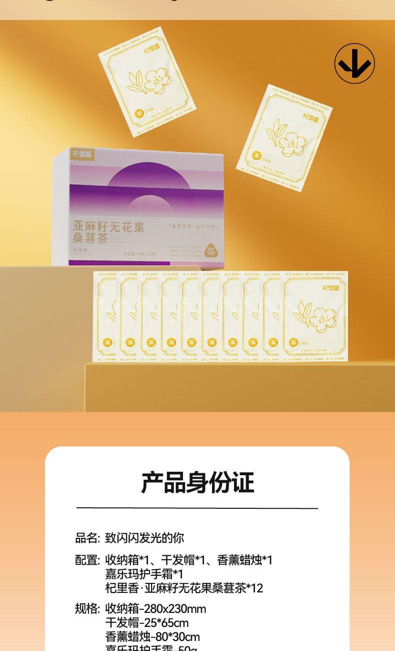 在宇宙的秩序里,每一颗星都有其轨迹与光芒 而你,无需被定义,也不必总在照亮他人 愿你在这属于自己的节日里,拥抱那份「我即光芒」的笃定 不只为今天,更为每一个你选择闪闪发光的昼夜 内配: 配置一:收纳箱x1 配置二:干发帽x 1 配置三:香薰蜡烛x1 配置四:嘉乐玛护手霜x1 配置五:杞里香·亚麻籽无花果桑葚茶x12