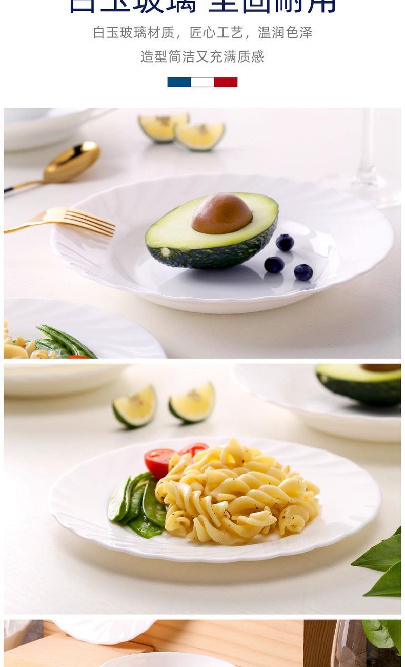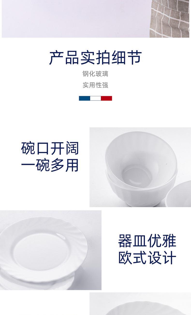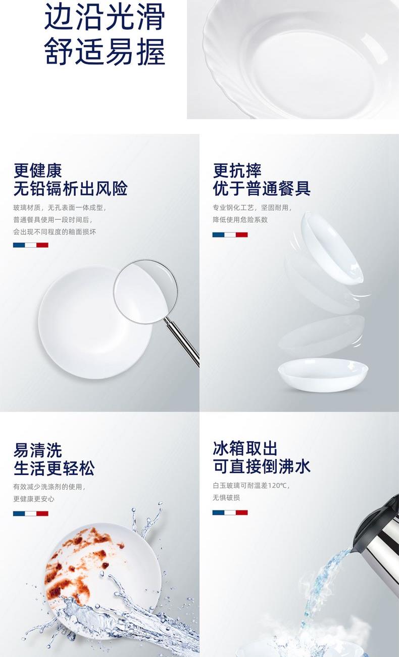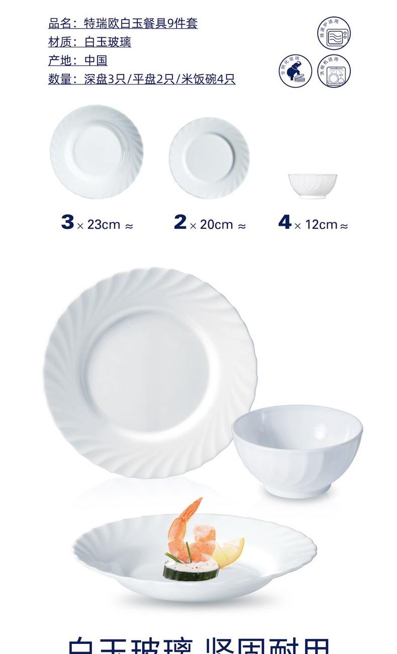 套件组成:饭碗12cm*4+深盘23cm*3+平盘20cm*2 材质:白玉玻璃 工艺:钢化工艺 包装:彩盒 外箱尺寸:496*331*273mm 毛重:2.9kg/12.4kg 特点: 1.无铅玻璃材质,环保、健康 2.全钢化工艺,抗震耐刮擦,耐温差120°C,微波炉、洗碗机、皆适用 3.无孔表面,易冲无残留,减少细菌产生 4.法式设计, 质薄轻巧,方便收纳,节省空间