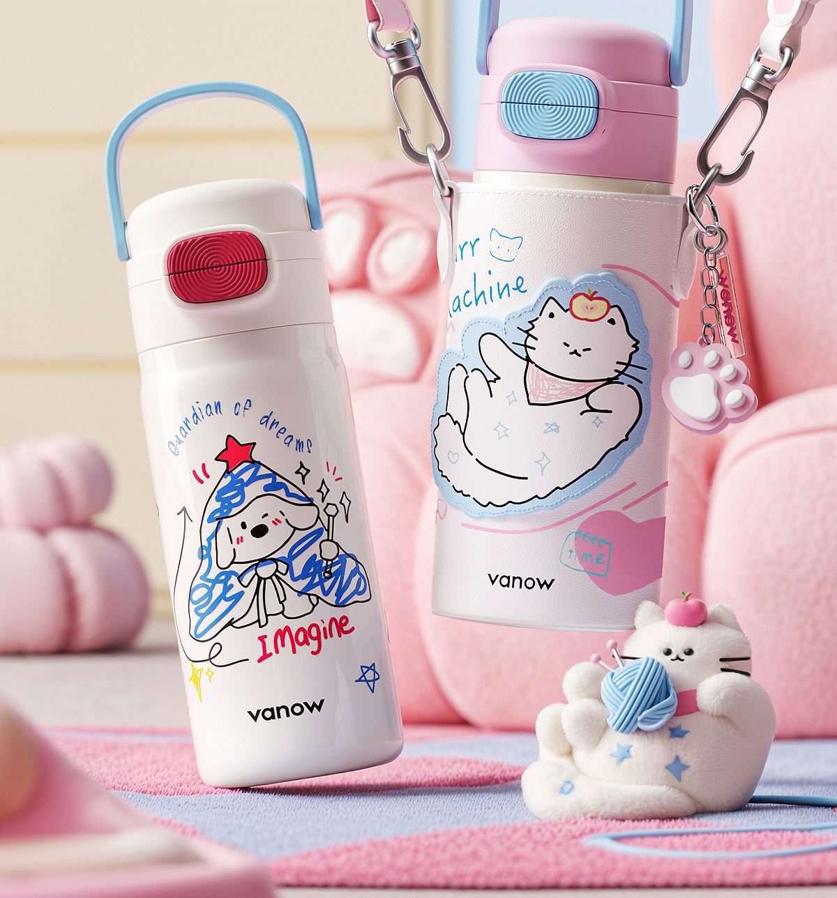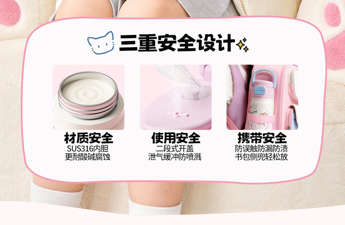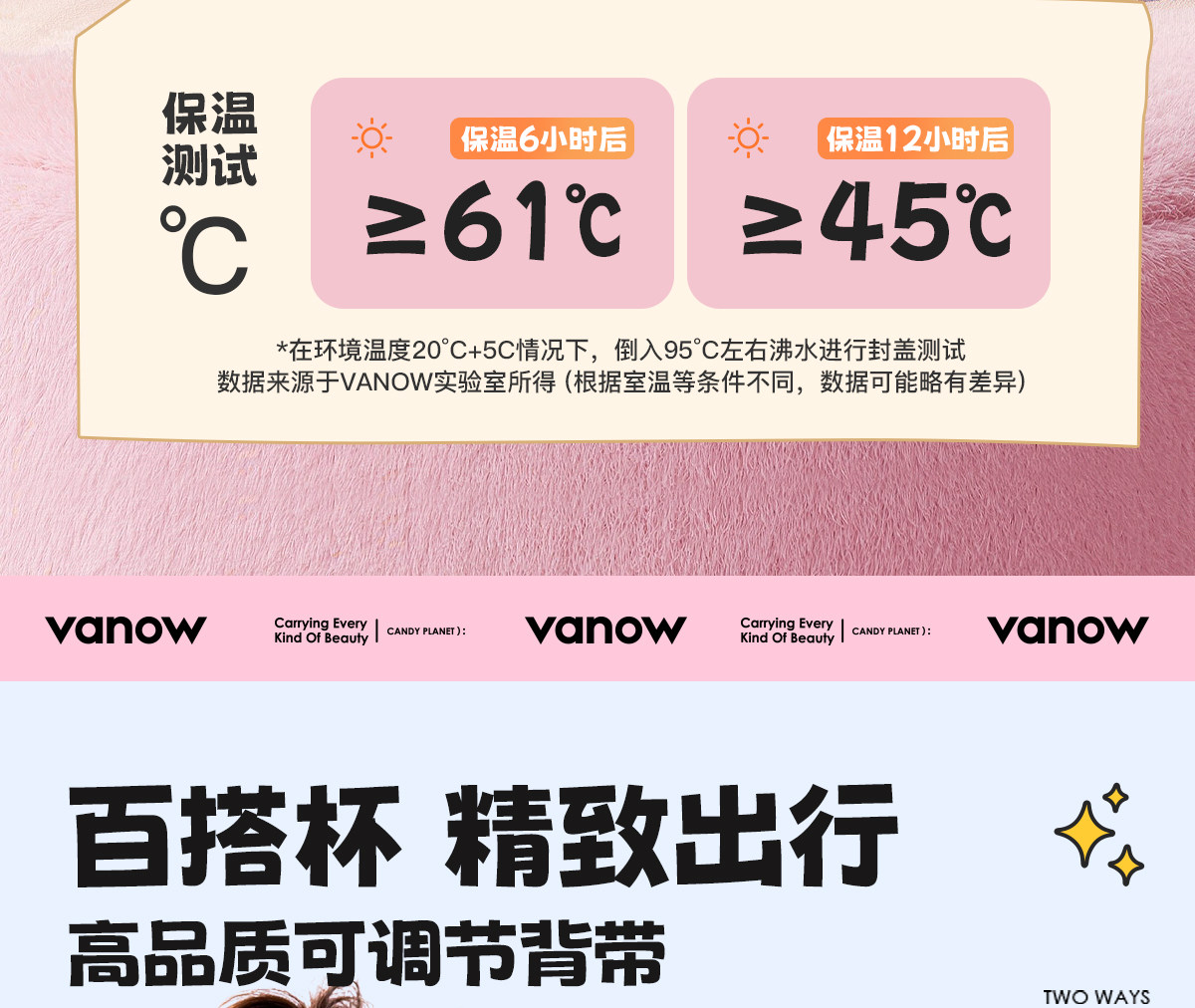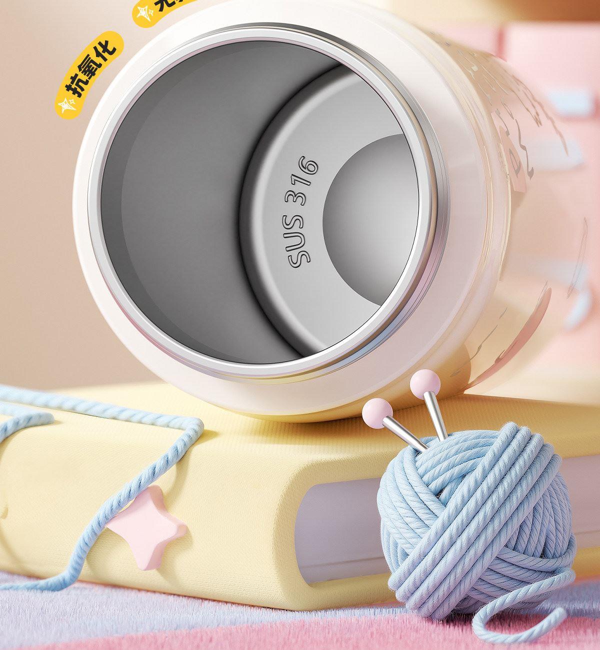 型号:VO-MQ46HL 颜色:黑色发夹狗,粉色猫咪,蓝色涂鸦狗 容量:460ml 尺寸:198*69mm 材质:316不锈钢内胆/硅橡胶/pp 产品卖点:1.科技锁温,长效保湿设计 2.百搭杯,精致出行,高品质可调节背带 3.一盖双印,随意切换 4.全身可拆,清洗无死角