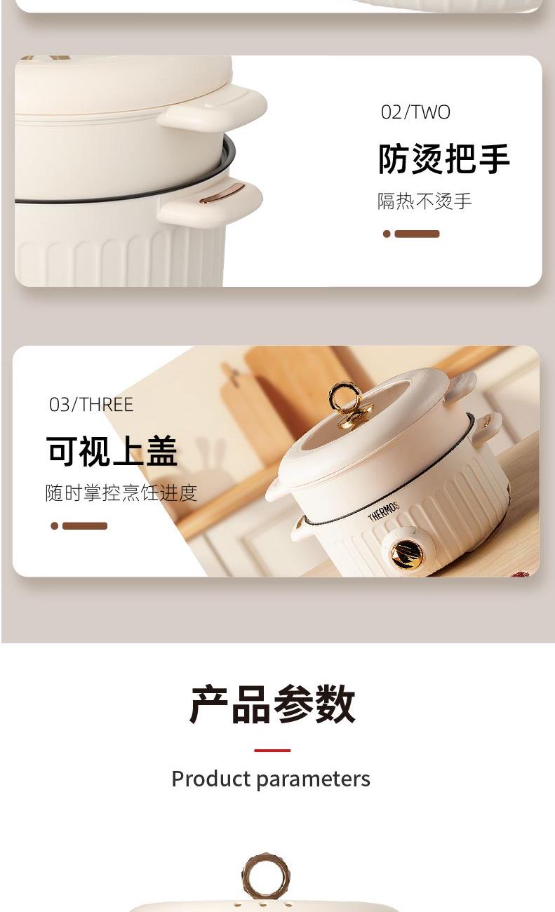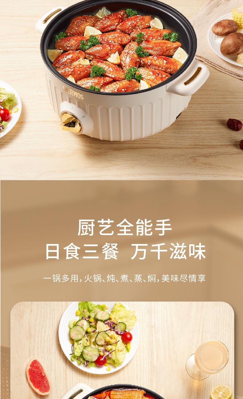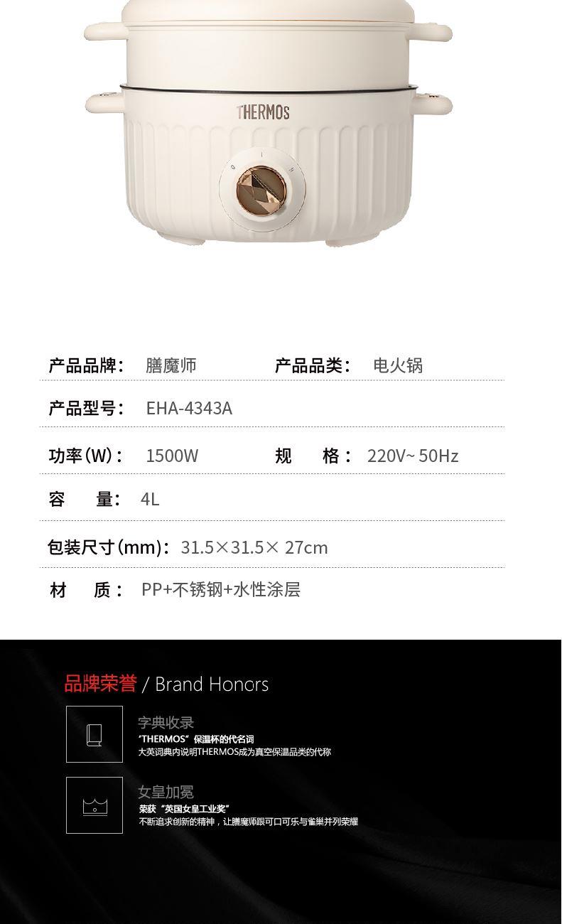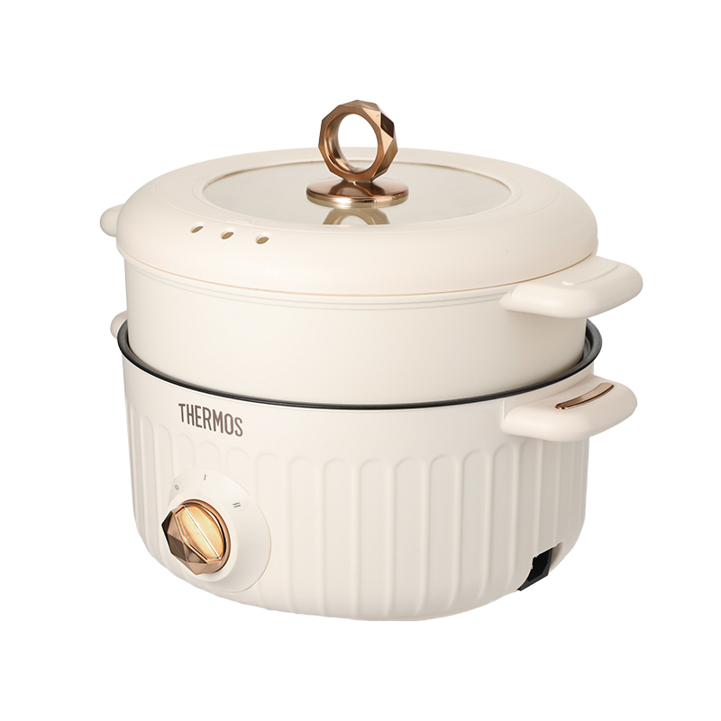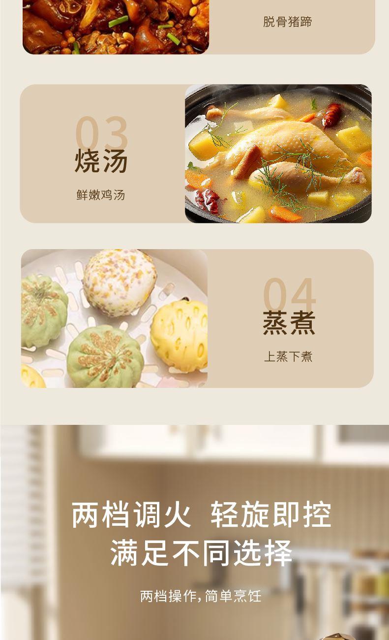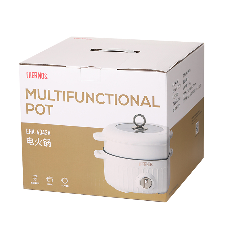 产品材质 :PP+不锈钢 产品参数 :功率:220V~50Hz 1500W 容量:4L 产品尺寸 :33×28.5×24.2cm 产品净重 :1.74Kg 含彩盒重量:2.23Kg 包装尺寸 :彩盒 :315*315*280 产品介绍: 1.造型时尚、精致美观 2.一锅多用,火锅、炖、煮、蒸、焖,美味尽情享 3.大容量、家人朋友聚餐都能满足 4.两档操作,简单烹饪 5.防干烧、防超温、双重安全保护装置,使用安全更省心