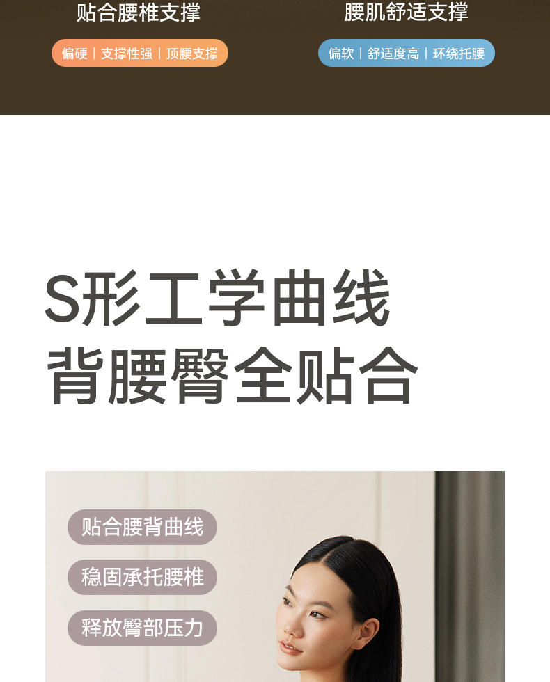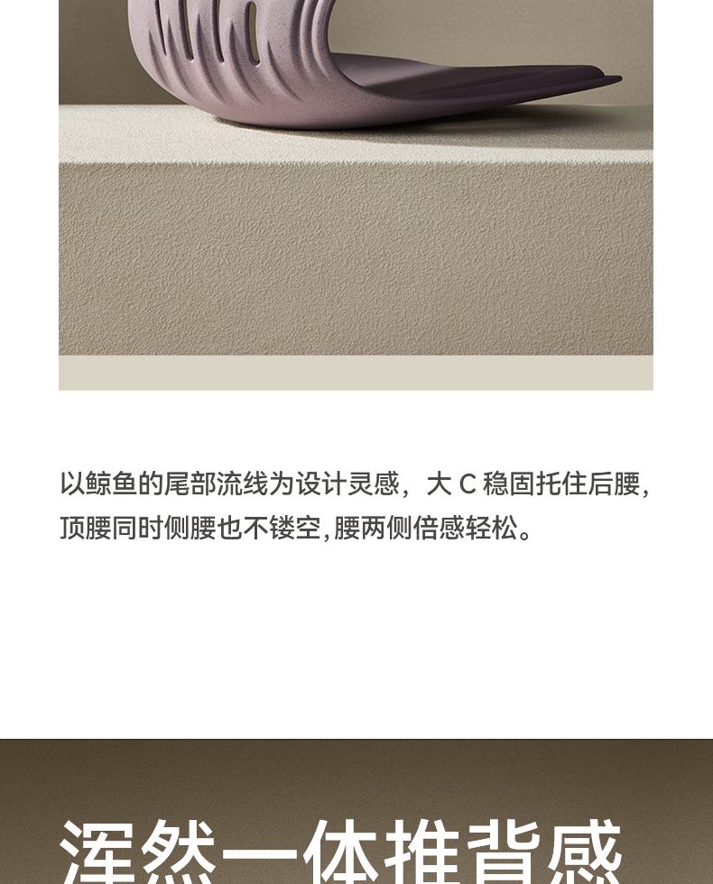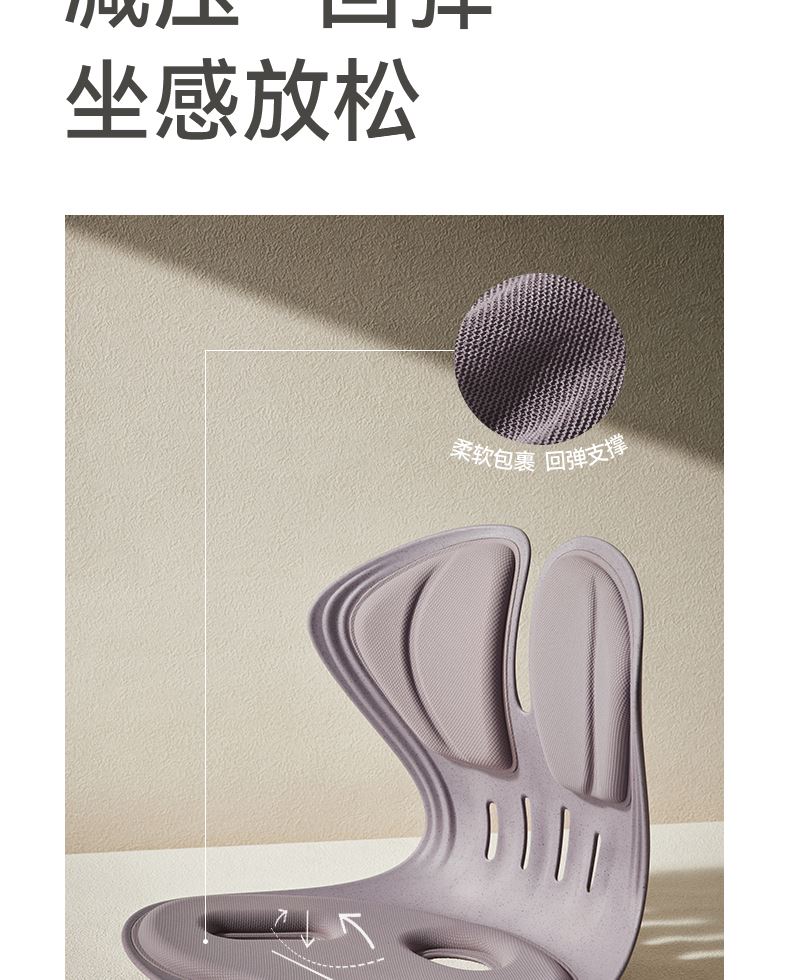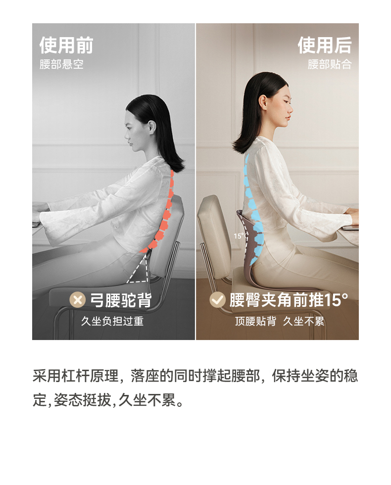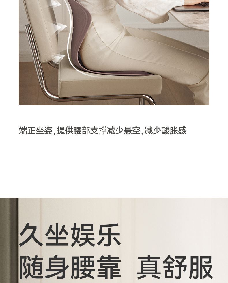 解决普通座椅的腰背悬空问题贴合支撑腰背,释放腰部压力久坐不累腰 人体工学设计,贴合 S型腰背曲线,释放久坐压力