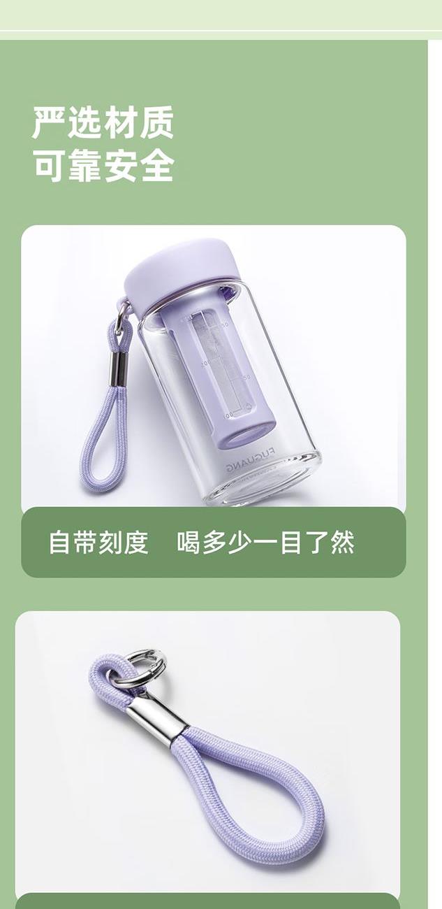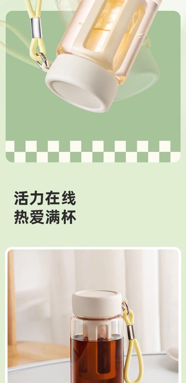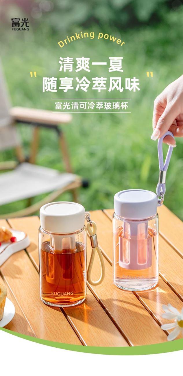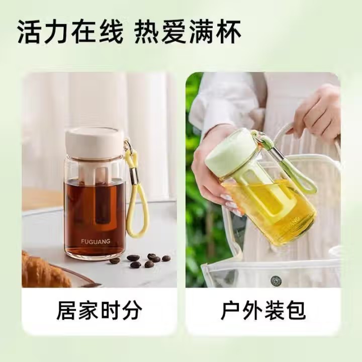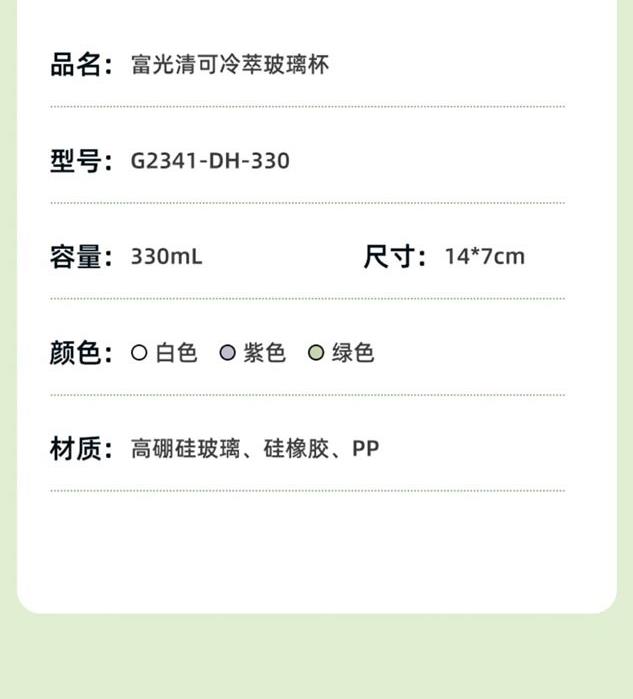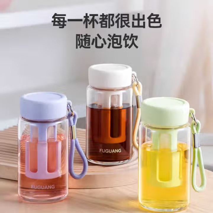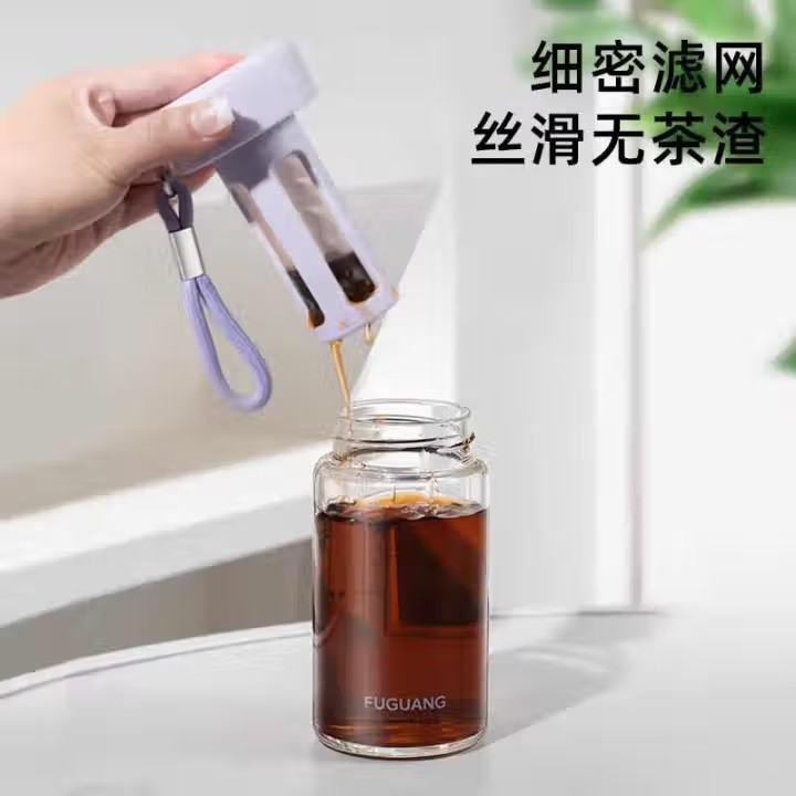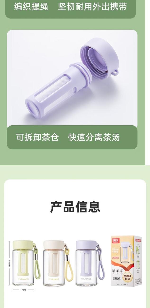 颜色:白色 紫色 绿色 容量:330ml 尺寸:70*140mm 材质:高硼硅玻璃材质,硅胶提环,食品级PP杯盖。 可分离式茶仓,快速分离茶汤。自带刻度,喝多少一目了然。 包装:单瓦盒