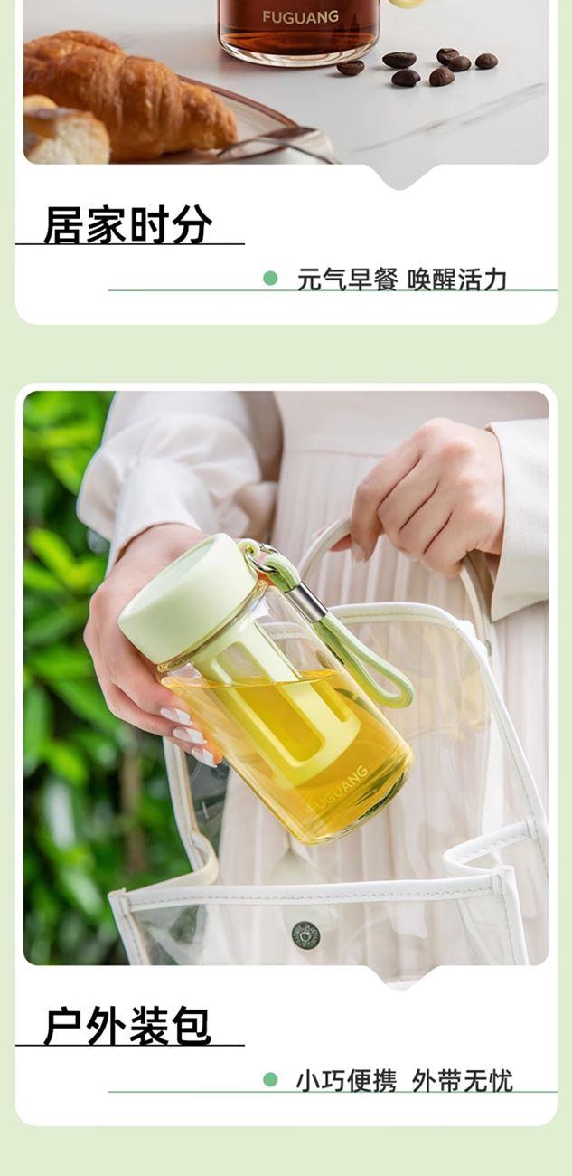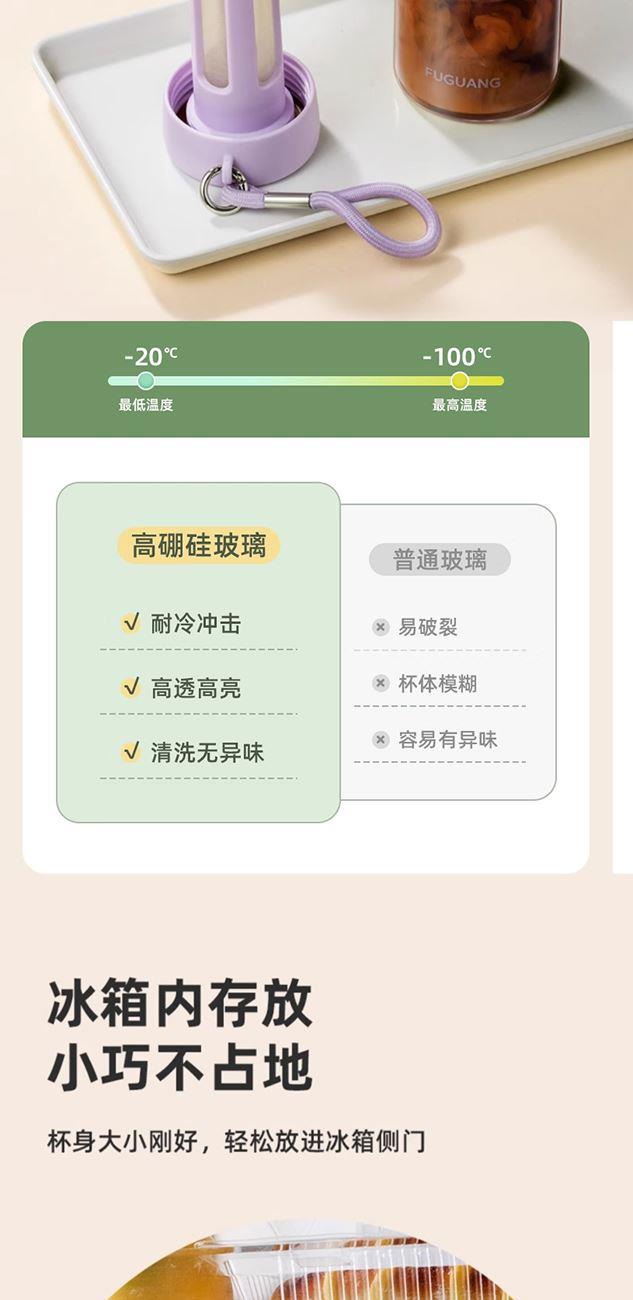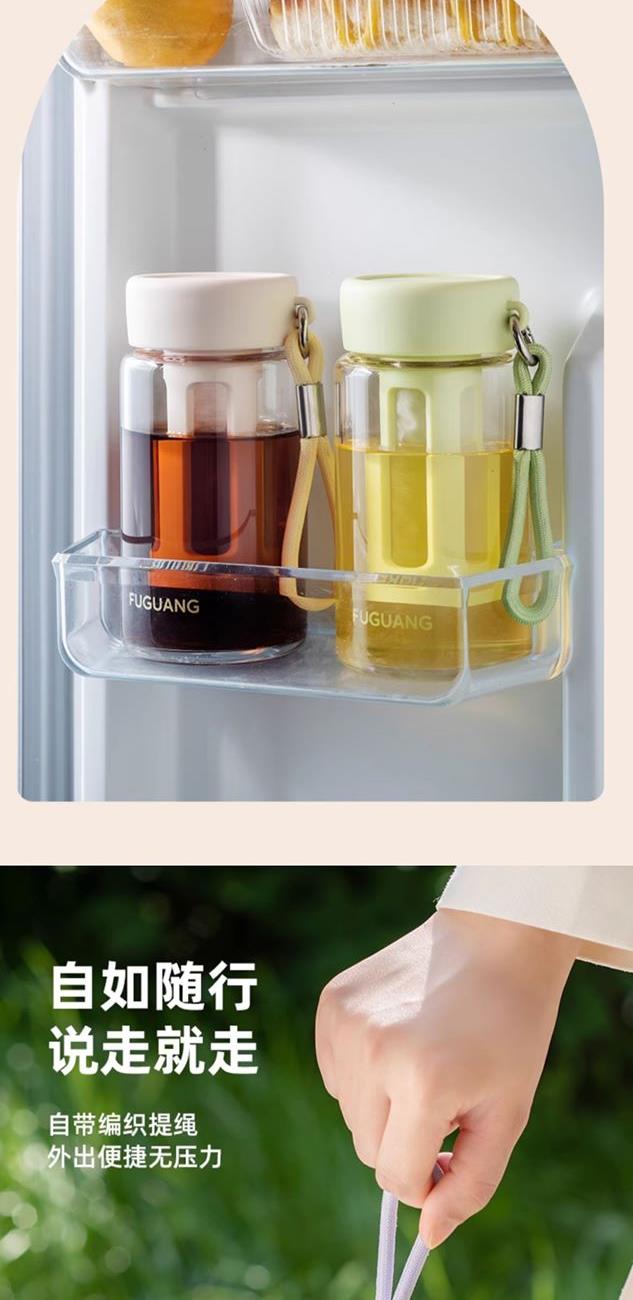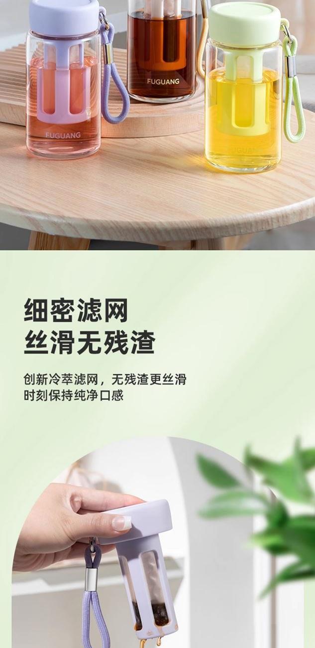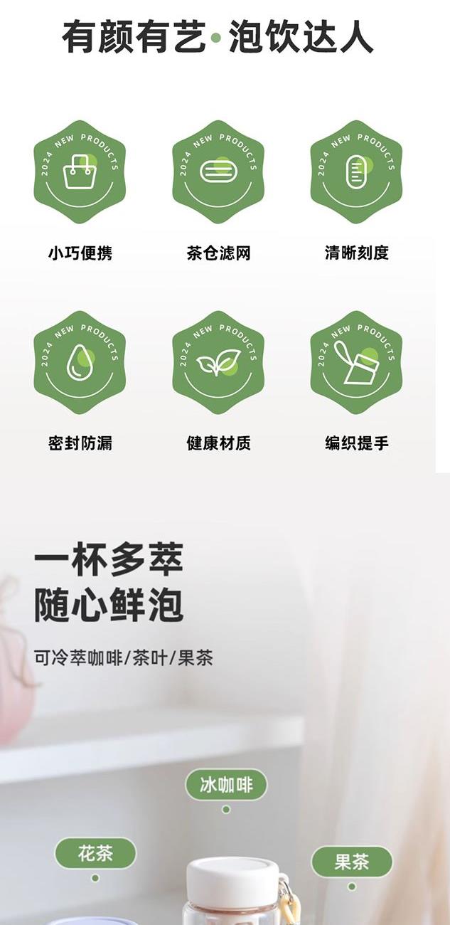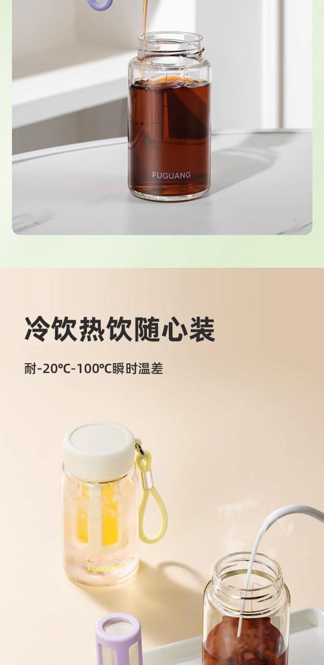 颜色:白色 紫色 绿色 容量:330ml 尺寸:70*140mm 材质:高硼硅玻璃材质,硅胶提环,食品级PP杯盖。 可分离式茶仓,快速分离茶汤。自带刻度,喝多少一目了然。 包装:单瓦盒