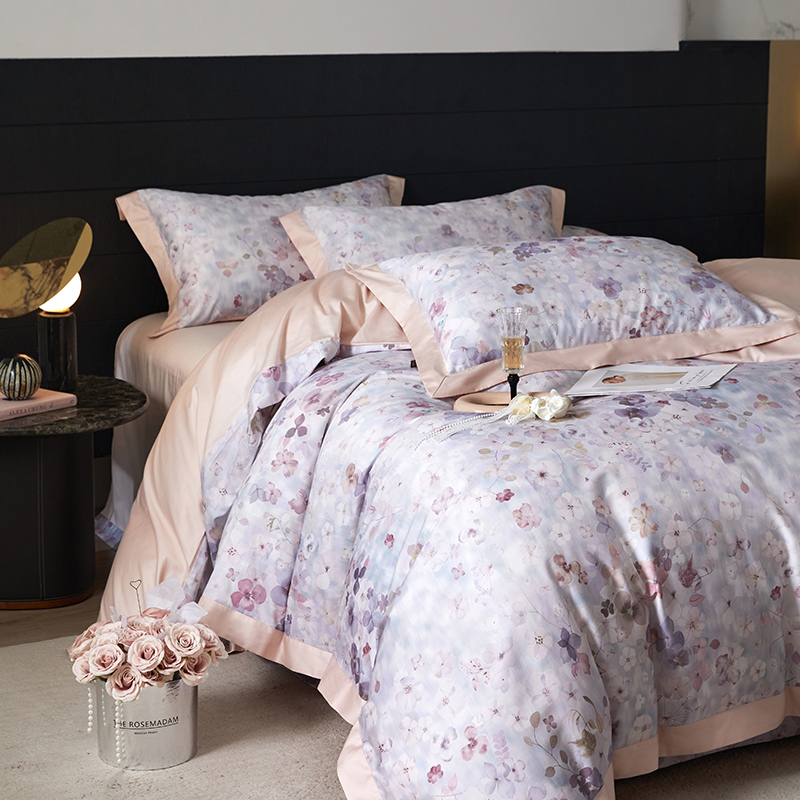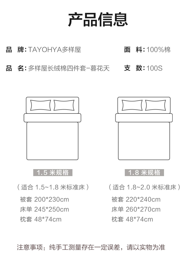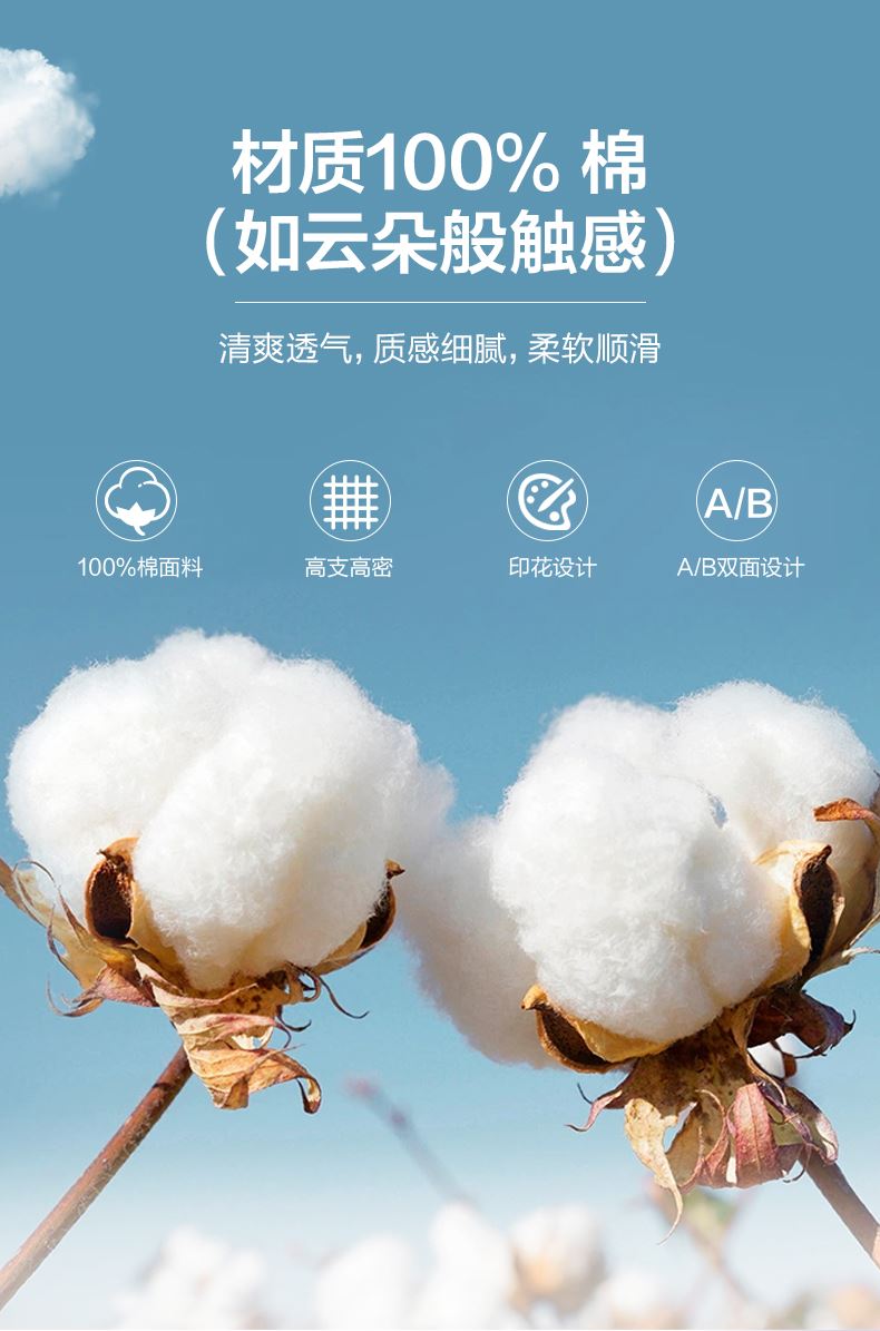 面料成分:棉 100s 工艺:印花 货号:TA080101ABPZZ 规格:被套*1:200*230cm,床单*1:245*250cm,枕套*2:48*74cm 包装:礼盒 特点:100支贡缎长绒棉,严选纱线,加之高支高密的贡缎织造工艺,使得床品手感极其柔软顺滑。 吸湿透气:长绒棉本身吸水性好,能够快速吸收并散发人体在睡眠中产生的湿气和热气,保持被窝内干爽舒适的睡眠环境。 适合追求高品质睡眠和生活享受的人群,无论是在寒冷 的冬天还是炎热的夏天,都能提供舒适的睡眠体验,为 卧室增添温馨和奢华的氛围 。