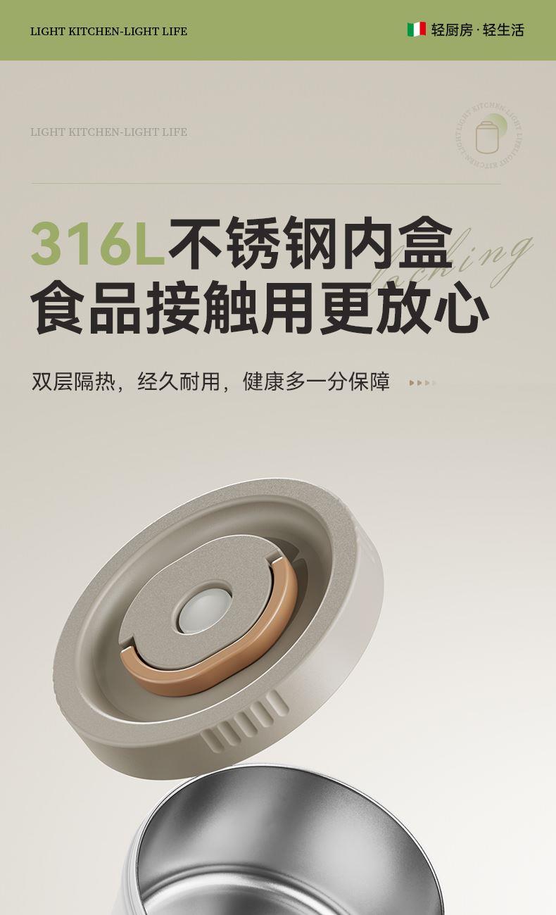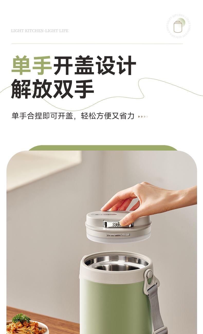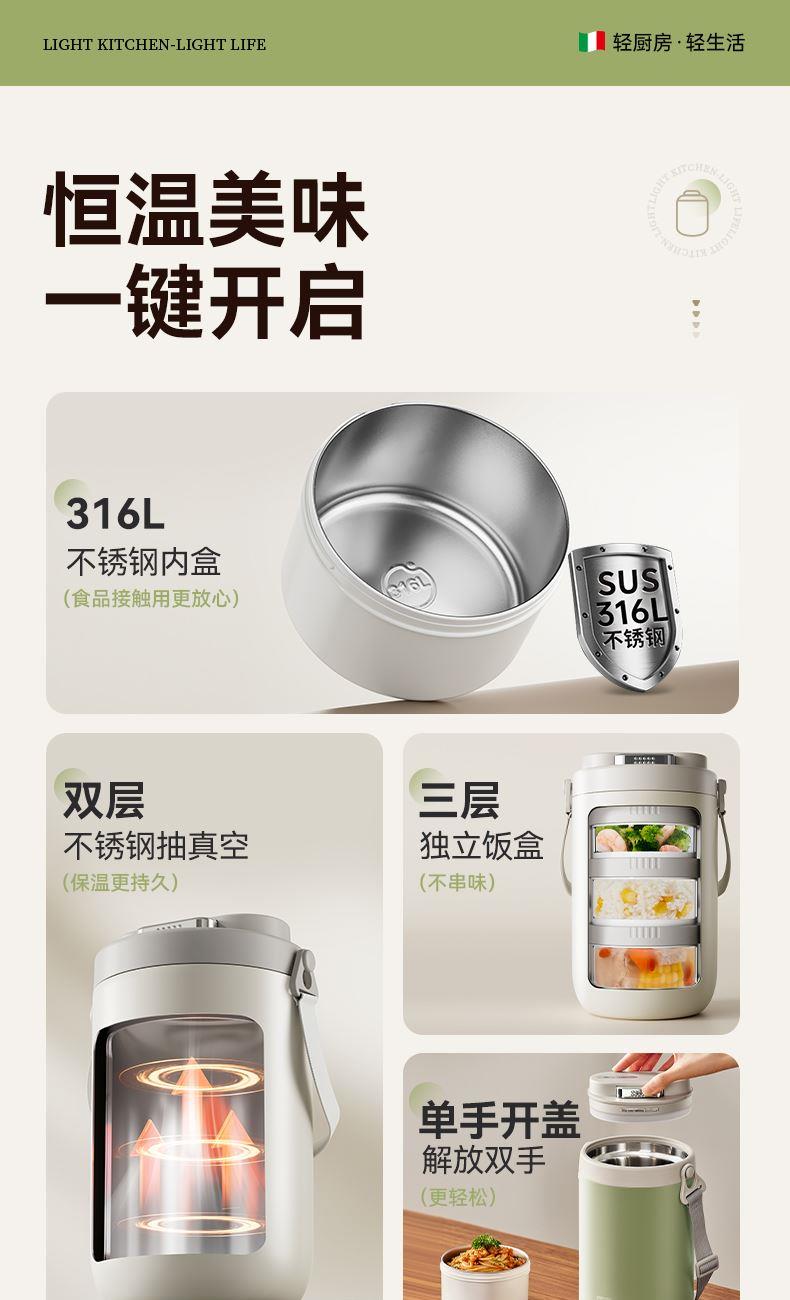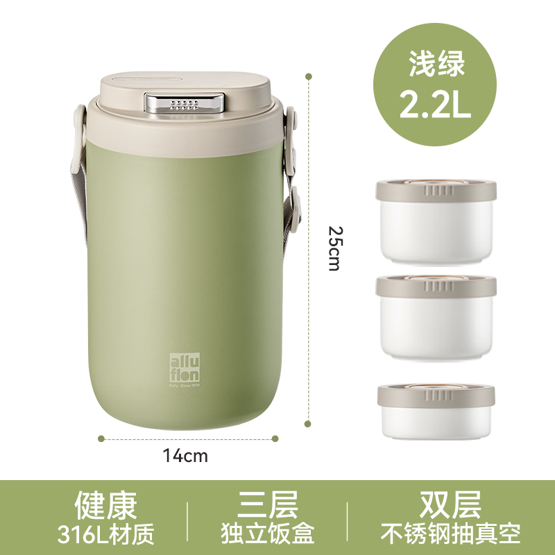 产品颜色:米白色/浅绿色 产品货号:2201032423 外箱尺寸:555*360*550mm 彩盒尺寸:162X162X255mm 1、健康316L材质,食品接触使用更放心 2、三层独立饭盒,菜饭汤分离不串味 3、双层不锈钢抽真空,保温更持久 4、内置硅胶密封圈,倒置防漏 5、单手开盖设计,方便又省力