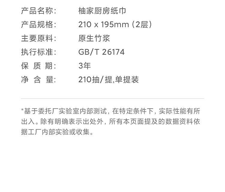 产品货号:453678 纸面规格:210*195mm(3层/抽) 单提规格:19.2*10.7*18cm (210抽/包) 产品毛重:0.366kg(单提) 主要原料:原生竹浆 保 质 期:3年