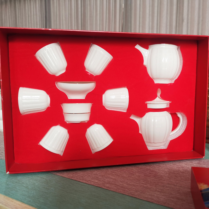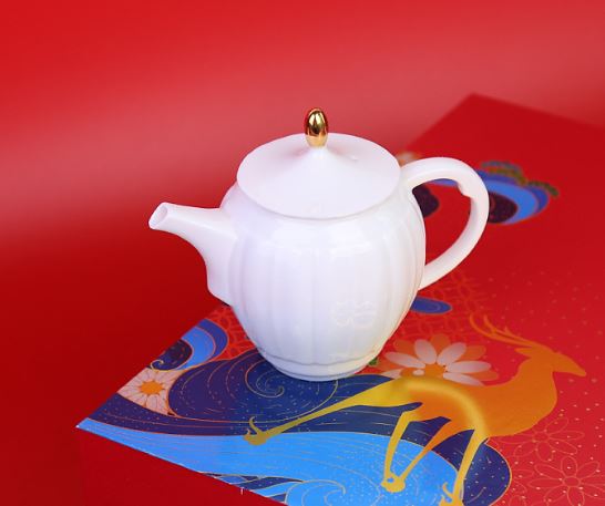 鹏翼羊脂玉瓷浮雕茶具