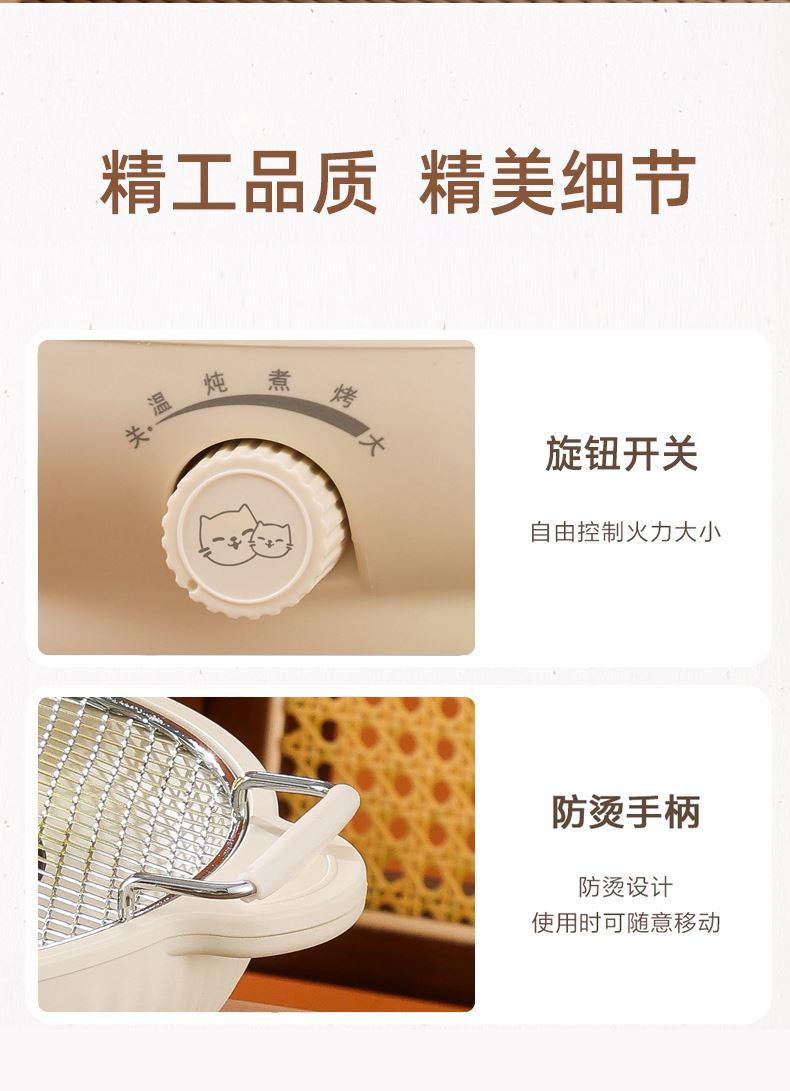 5、机身外壳采用尼龙防阻燃材质,材质更安全,带硅胶防烫提手的高密度烤网,可烤瓜子等食物,有凹槽不打滑