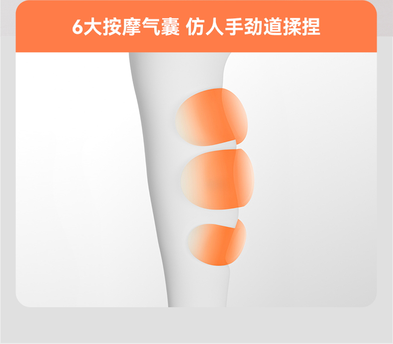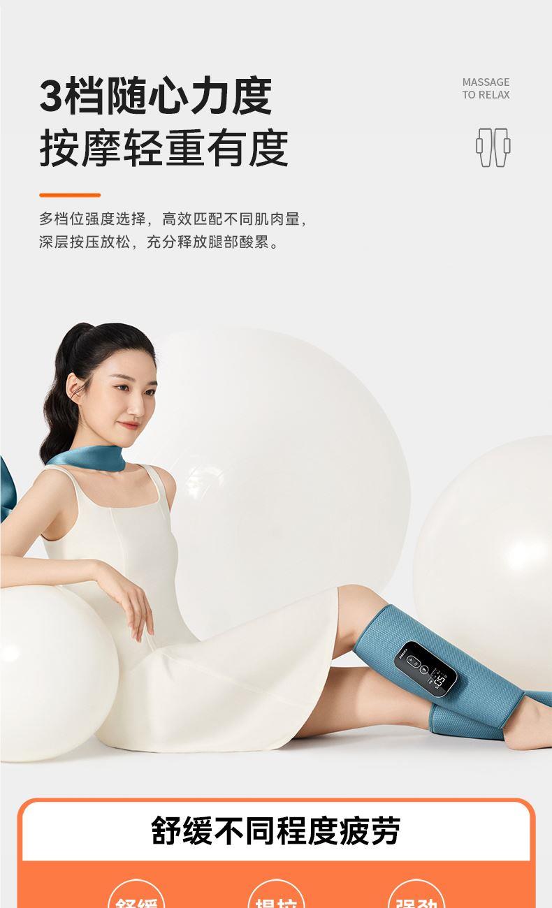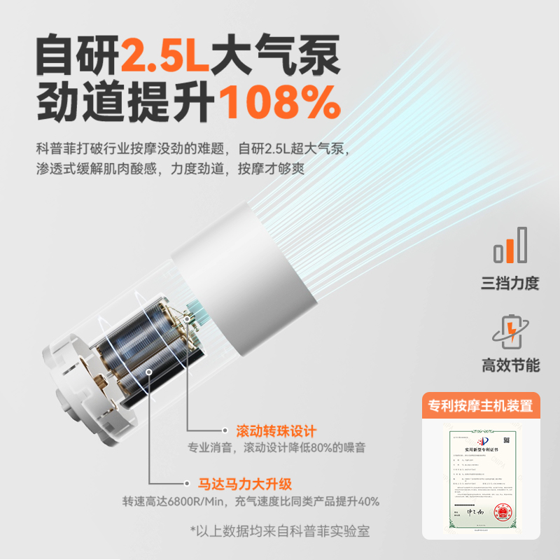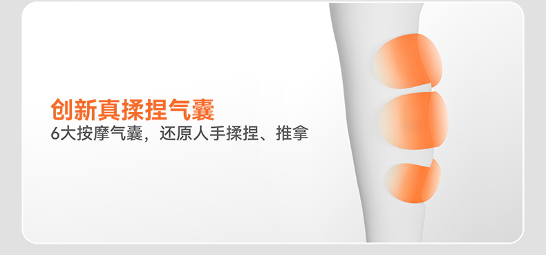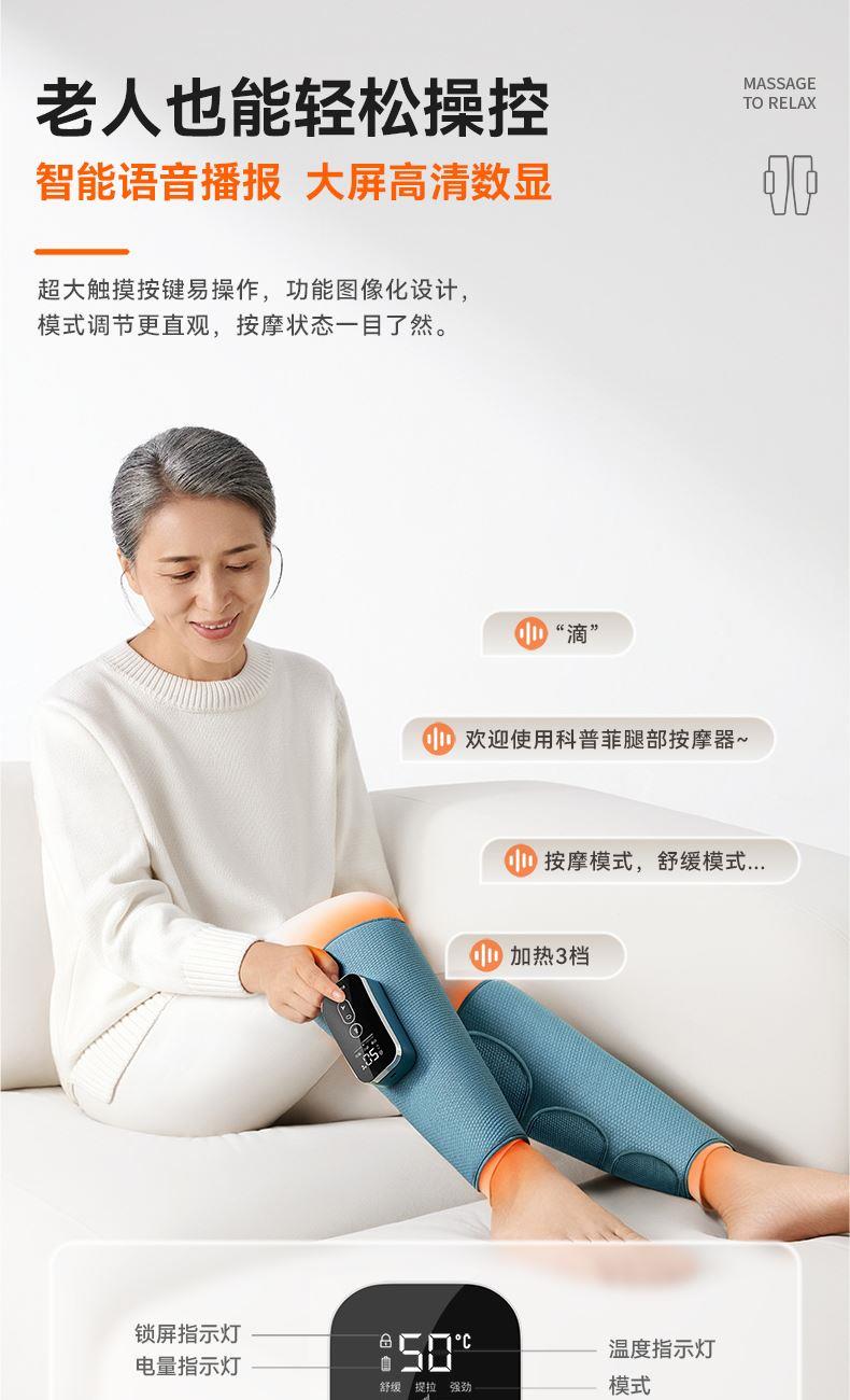【电量】--3600毫安电量可用3小时左右(比市场上同类产品电池大三分一) 【大力度】--科普菲自研大气泵,按摩力度大速度快 【多样化】---3段式气嚢,可组合多样化按摩方式 【发热面积】--石墨烯发热片,发热面积大于市面上产品的一倍