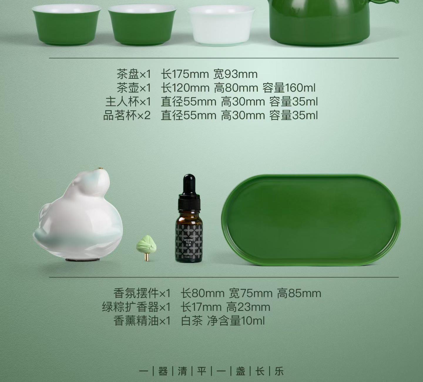 配置:茶壶*1,主人杯*1,茶杯*2,茶盘*1,摆件*1(含小绿粽扩香器),精油*1。 尺寸:茶壶12*8cm 容量160ml, 杯5.5*3cm 容量35, 茶盘17.5*9.3*1cm, 摆件8*7.5*8.5cm, 白茶精油10ml。 礼盒:42*14.5*10.5cm。