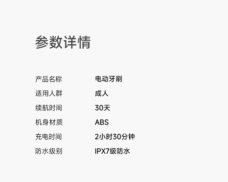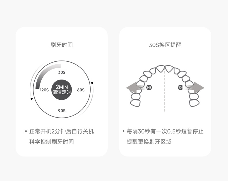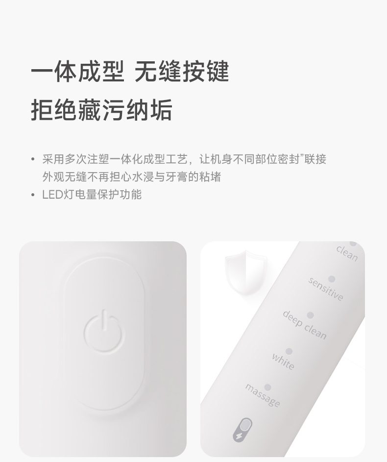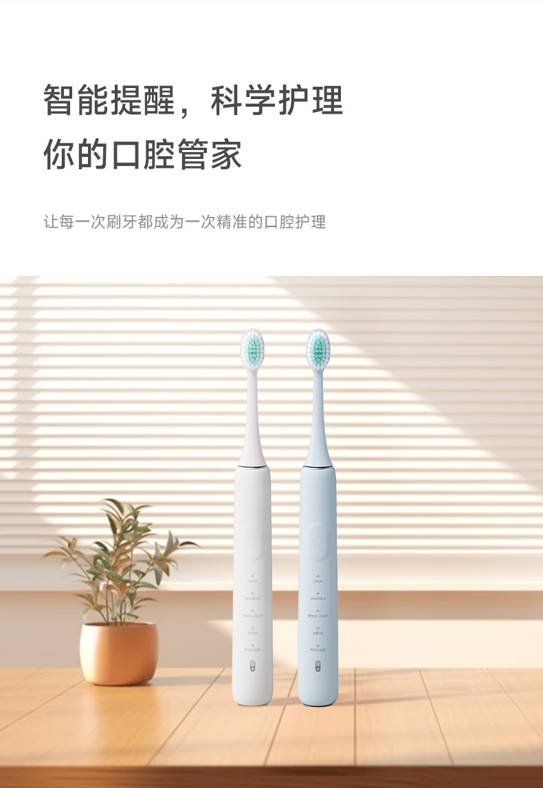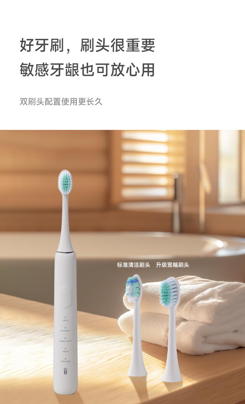 产品型号:CBH-J110 防水等级:ipx7 配备:常规刷头+双尖软毛宽刷头 • 动力强劲,高效洁齿 • 高频震动磁悬浮马达,刷得干净 • 无锈无金属刷头,清洁卫生高效 • 常规刷头、软毛宽头刷头搭配使用,应对不同需求