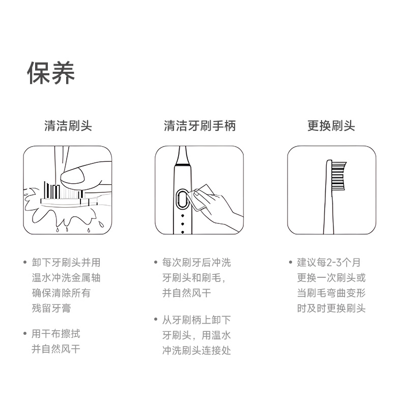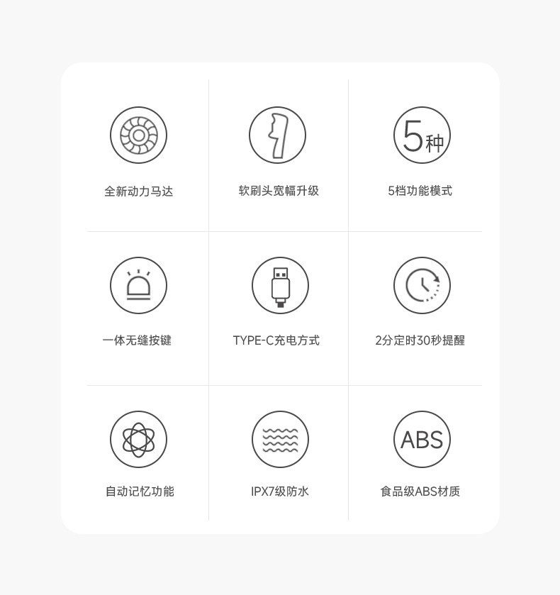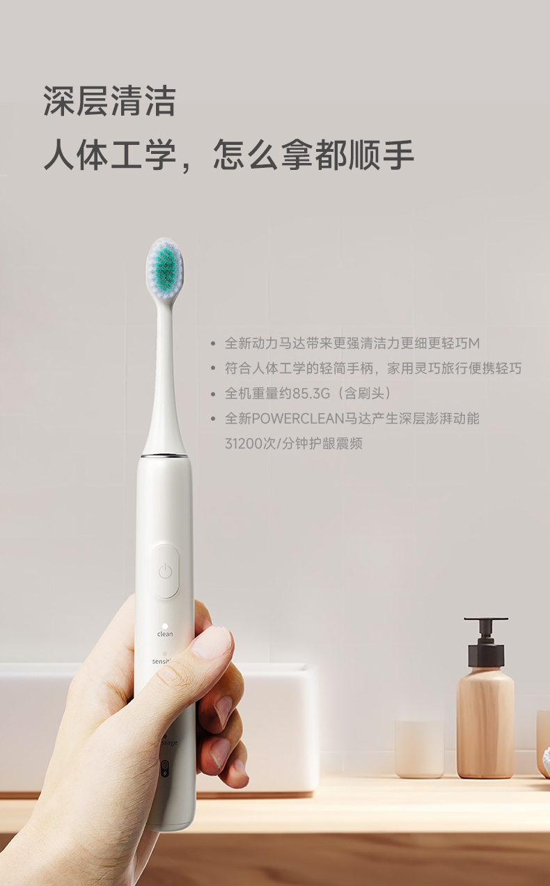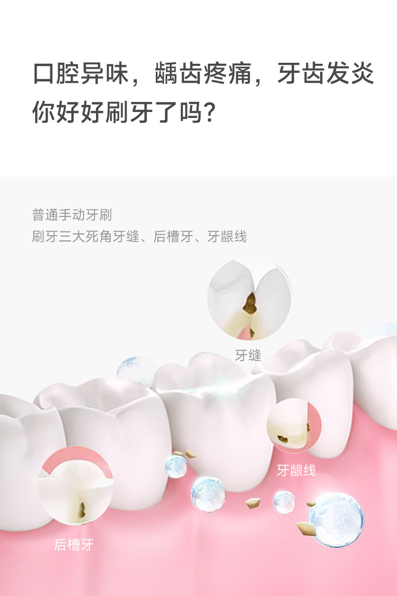 产品型号:CBH-J110 防水等级:ipx7 配备:常规刷头+双尖软毛宽刷头 • 动力强劲,高效洁齿 • 高频震动磁悬浮马达,刷得干净 • 无锈无金属刷头,清洁卫生高效 • 常规刷头、软毛宽头刷头搭配使用,应对不同需求