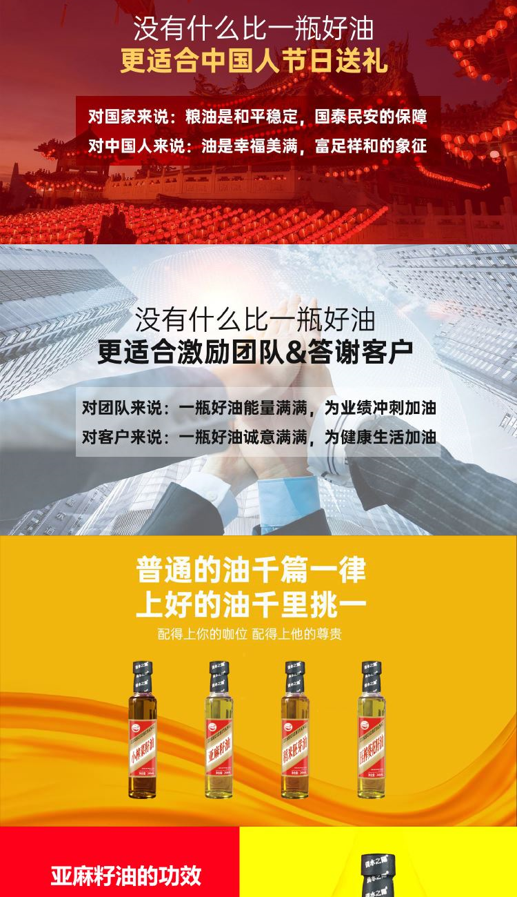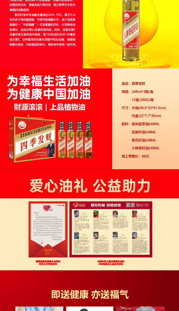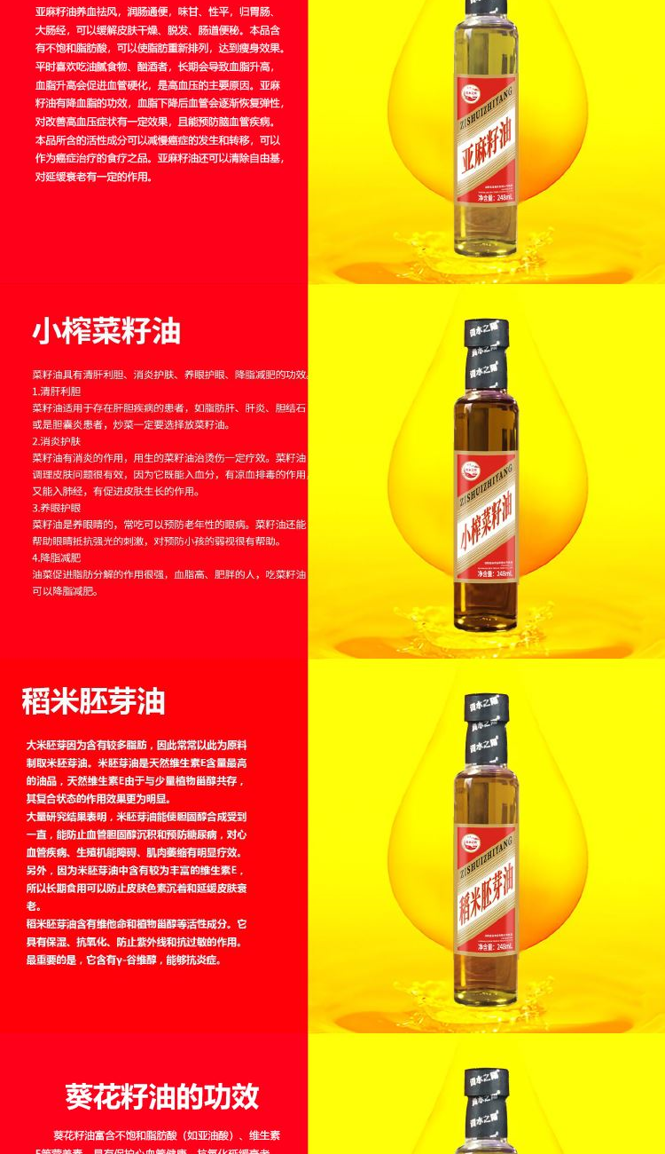 配置: 稻米胚芽油248毫升 亚麻籽油248毫升 小榨菜籽油248毫升 葵花籽油248毫升 尺寸: 外箱(49.5*33*61.5cm) 内盒(32*7.7*30cm) 规格: 12盒/26KG/箱