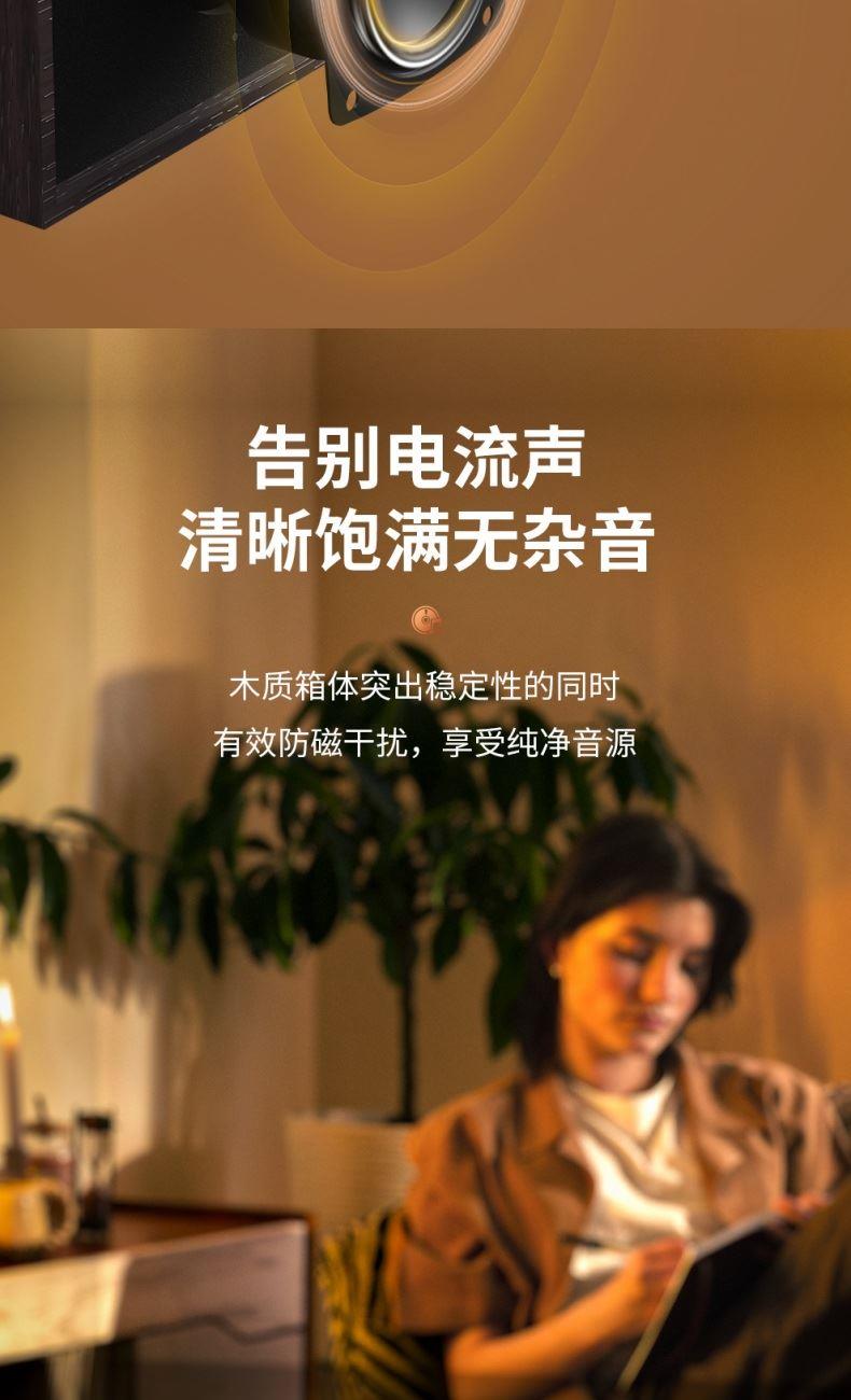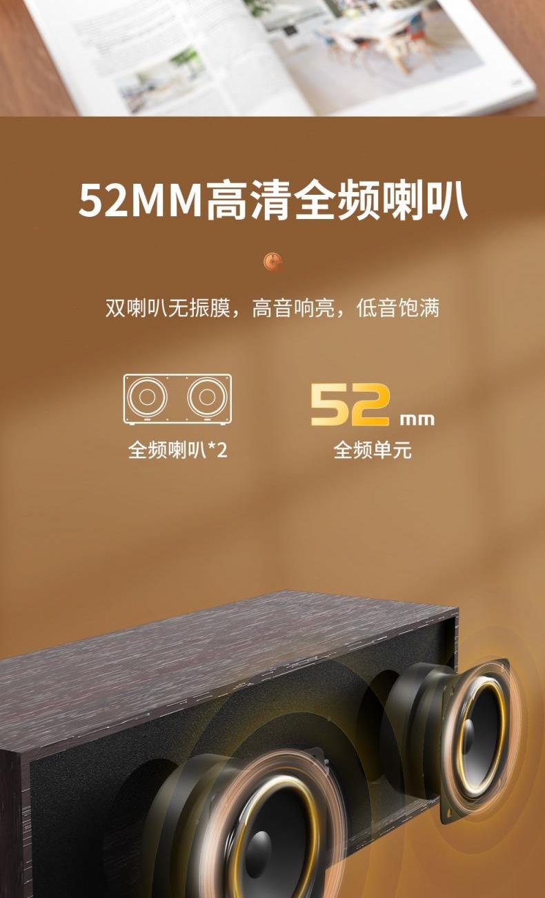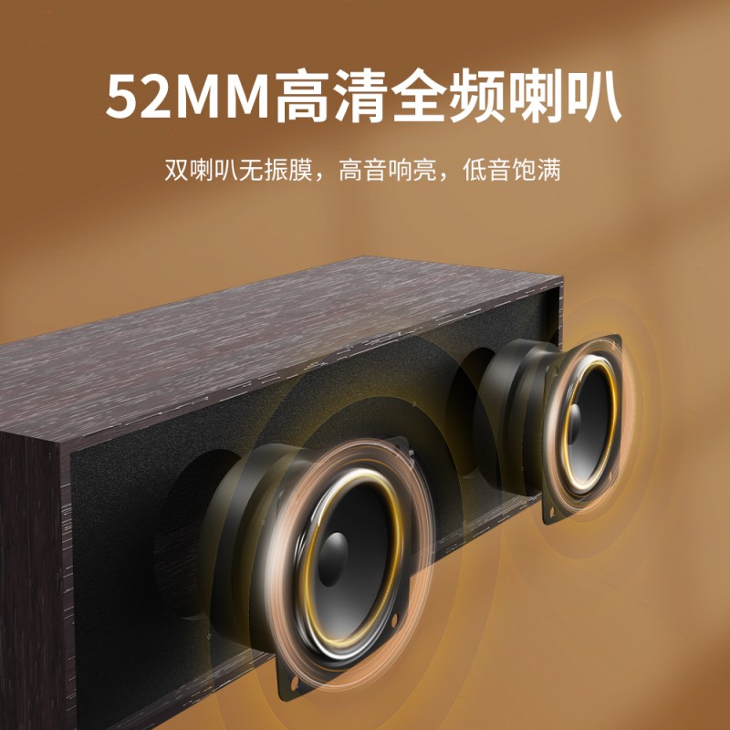 输出功率:5W 蓝牙:V5.3 喇叭尺寸:52MM*2 频响范围:60Hz-18KHz •木箱制造,告别电流音,音质更纯净 •52mm高清全频喇叭,高音响亮,低音饱满 •有线无线双连接,内置蓝牙5.3芯片,10米无线传输,快速稳定 •创新USB一线通,一线多用,打造整洁桌面