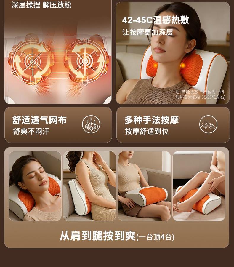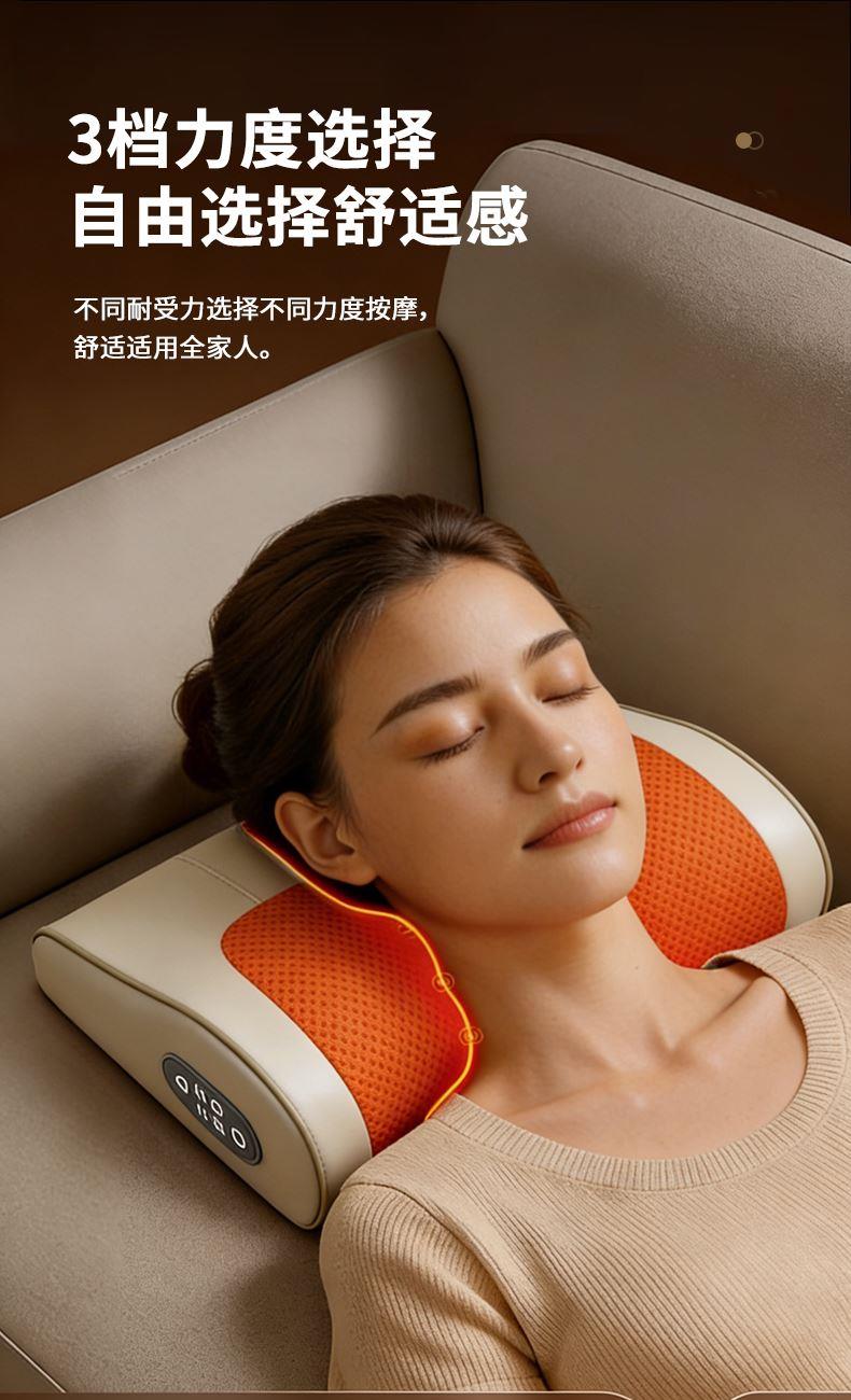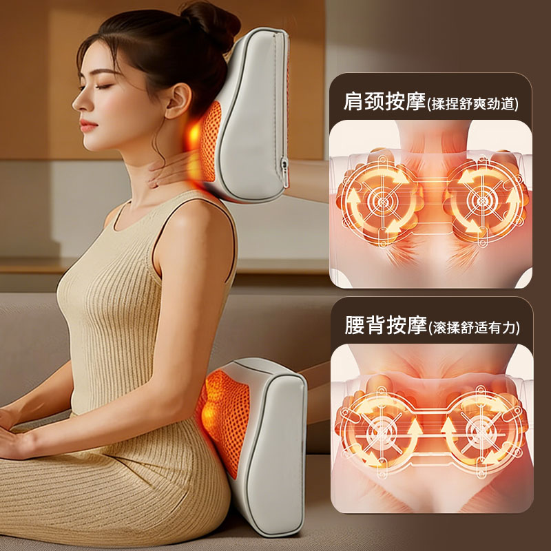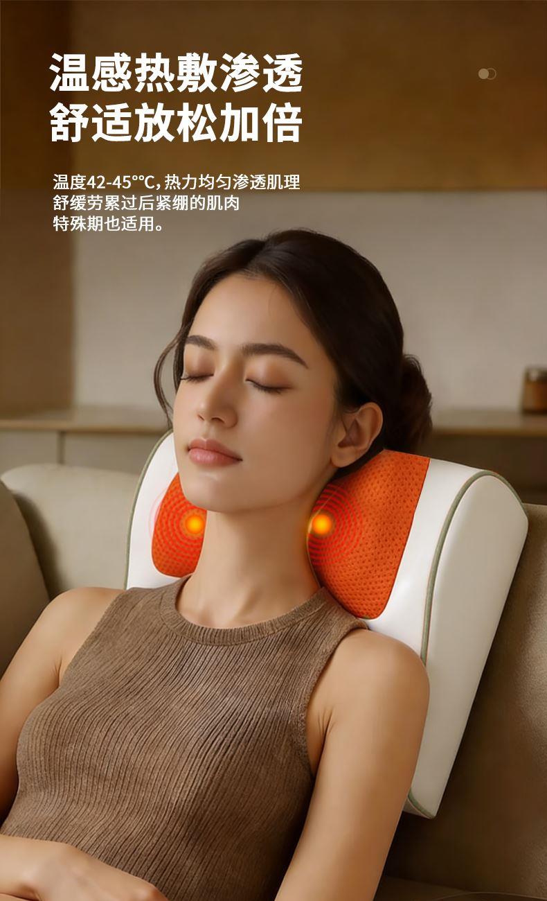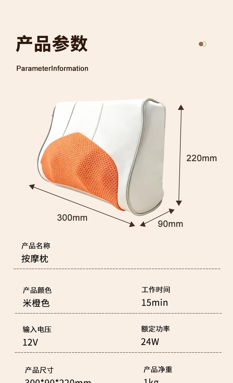 型号:WD-J01 电压:12V 24W 电池容量:1800毫安 产品尺寸:30*9*22cm 重量:1.4kg 外箱尺寸:69*50*34cm 20颗子母大小头 正反转揉捏按摩,缓解酸胀肌肉 42-45°温感热敷 三种模式,三挡力度调节 多部位使用,舒爽放松到位 方寸枕间,揉碎所有肩颈的疲惫与紧绷