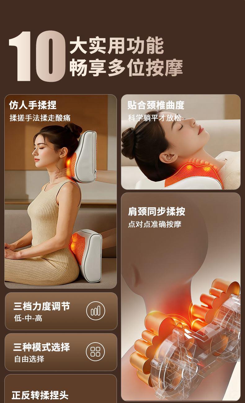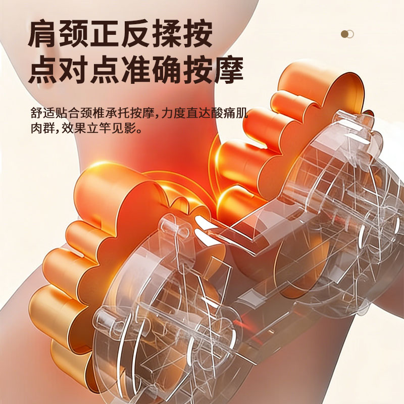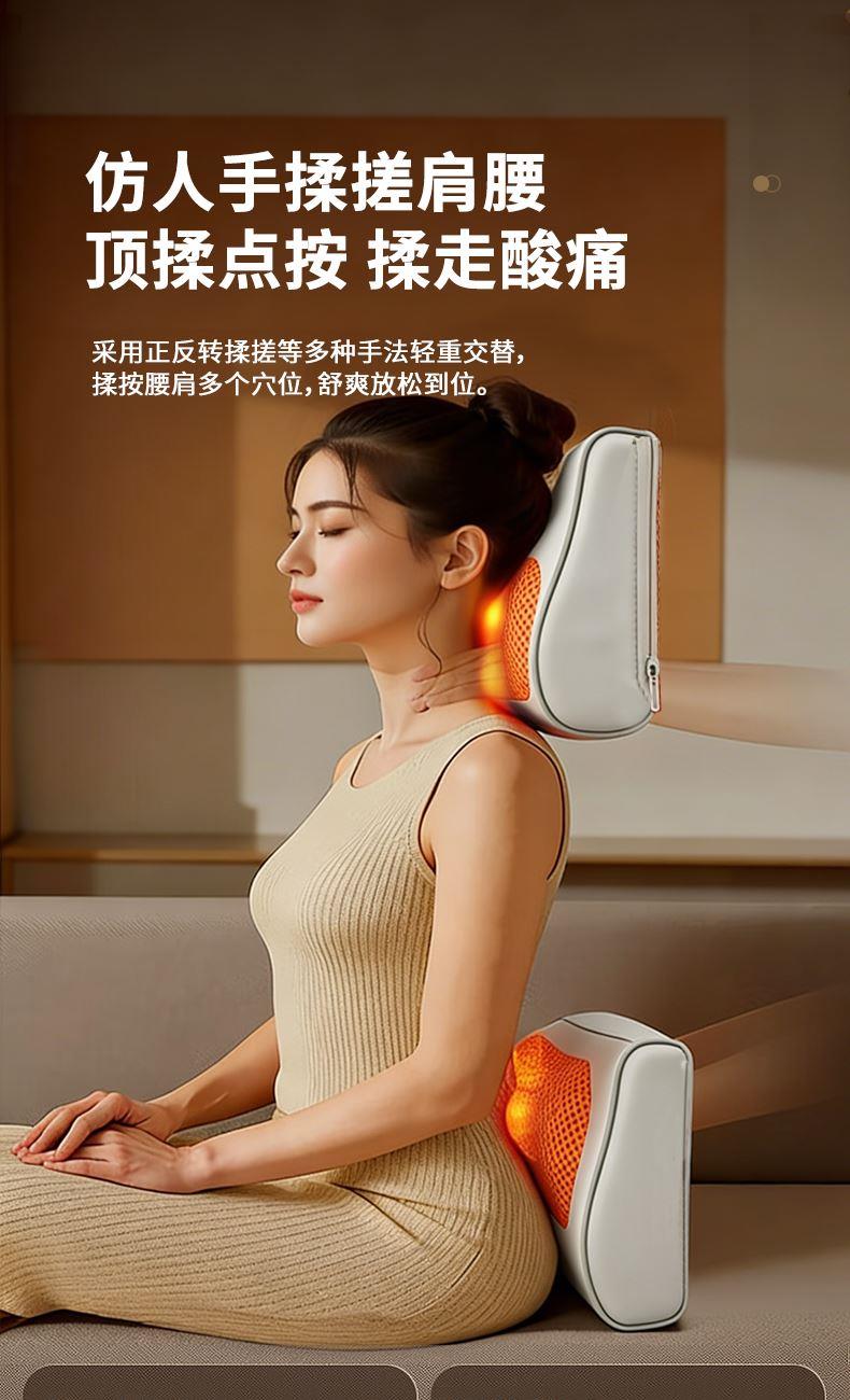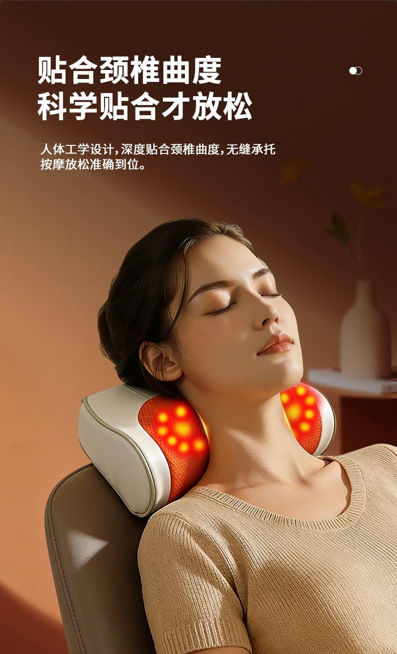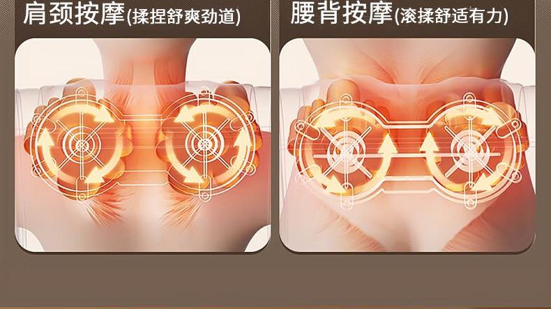 型号:WD-J01 电压:12V 24W 电池容量:1800毫安 产品尺寸:30*9*22cm 重量:1.4kg 外箱尺寸:69*50*34cm 20颗子母大小头 正反转揉捏按摩,缓解酸胀肌肉 42-45°温感热敷 三种模式,三挡力度调节 多部位使用,舒爽放松到位 方寸枕间,揉碎所有肩颈的疲惫与紧绷