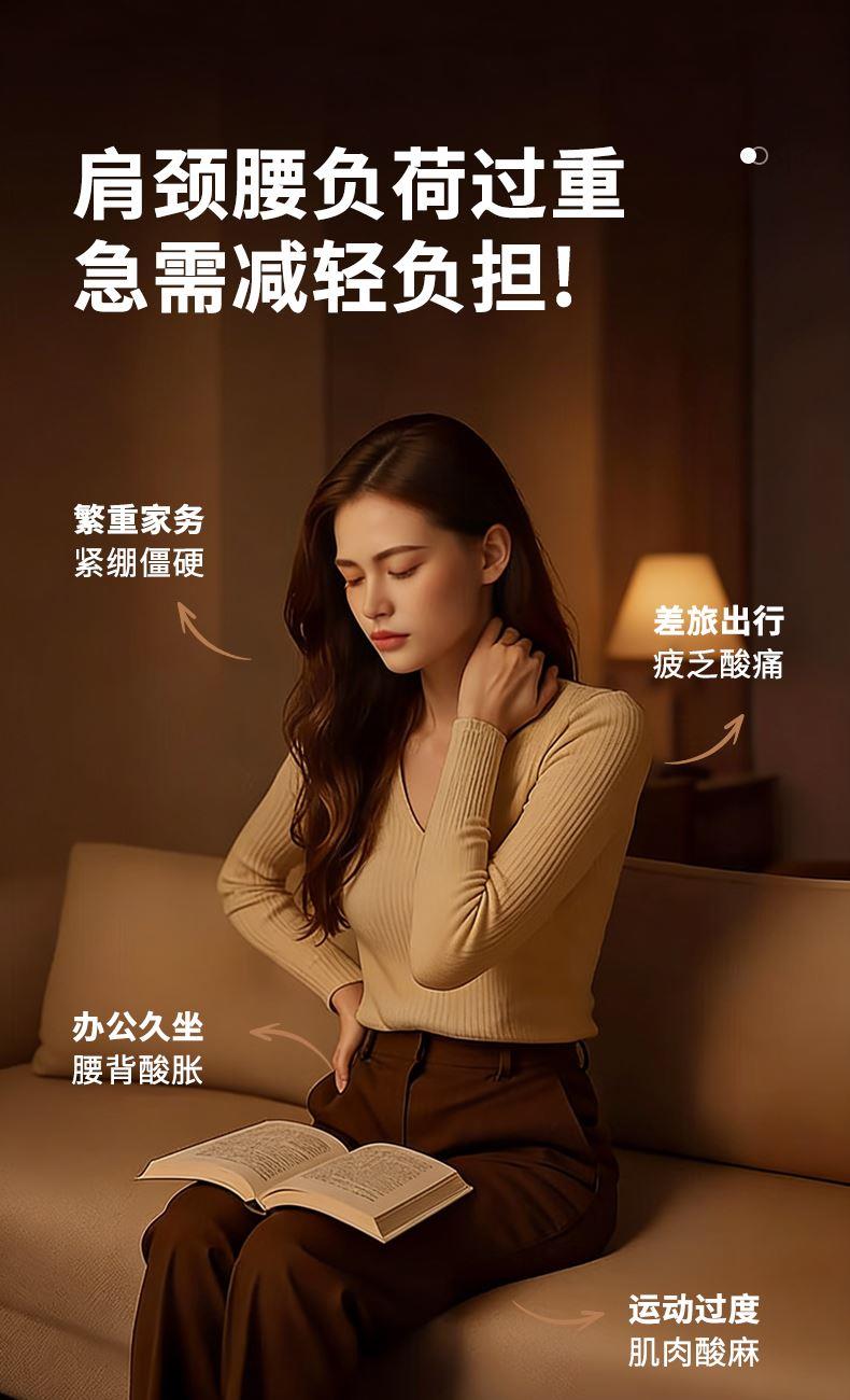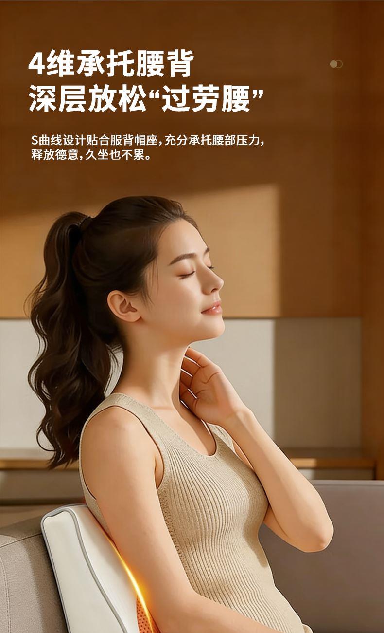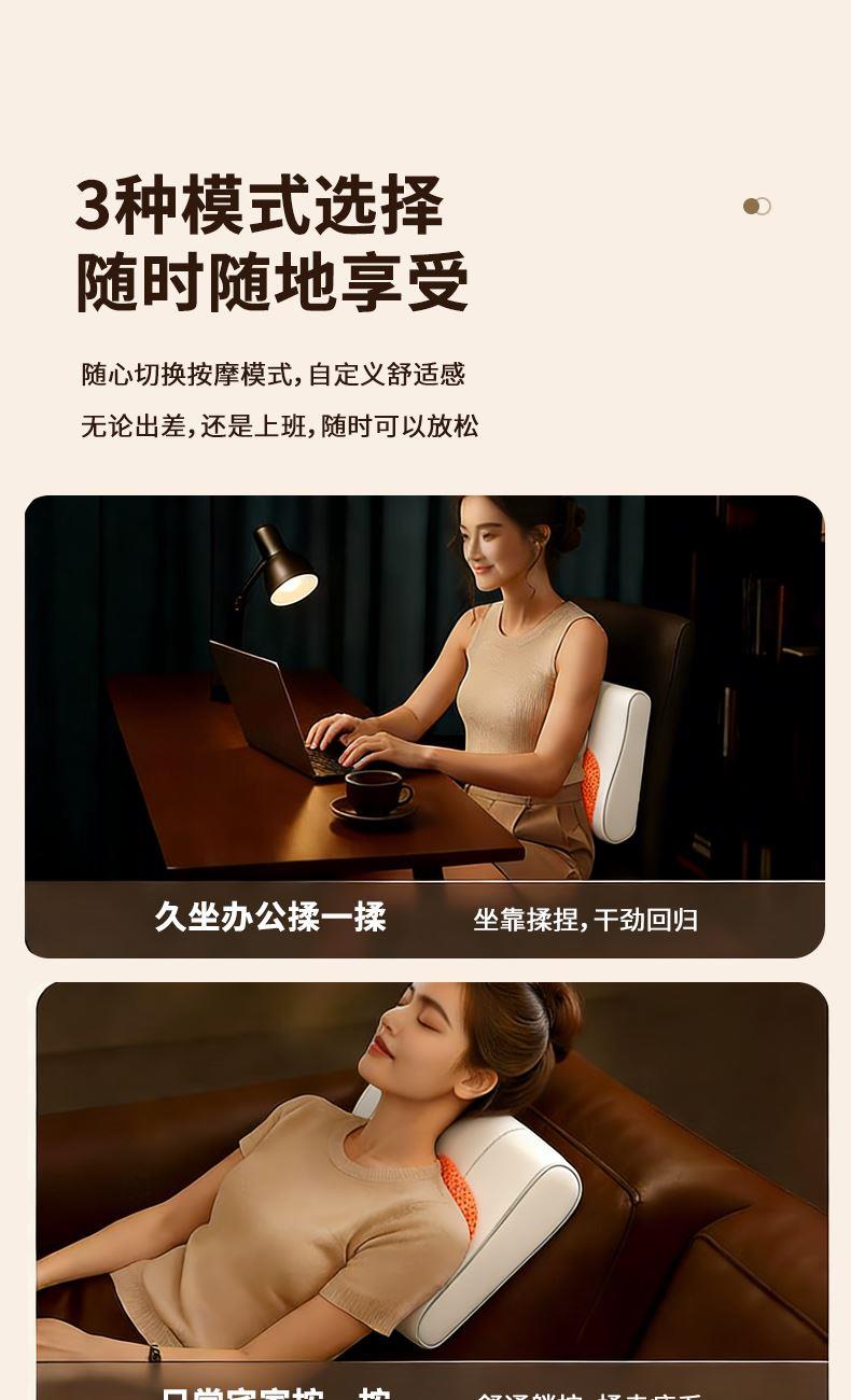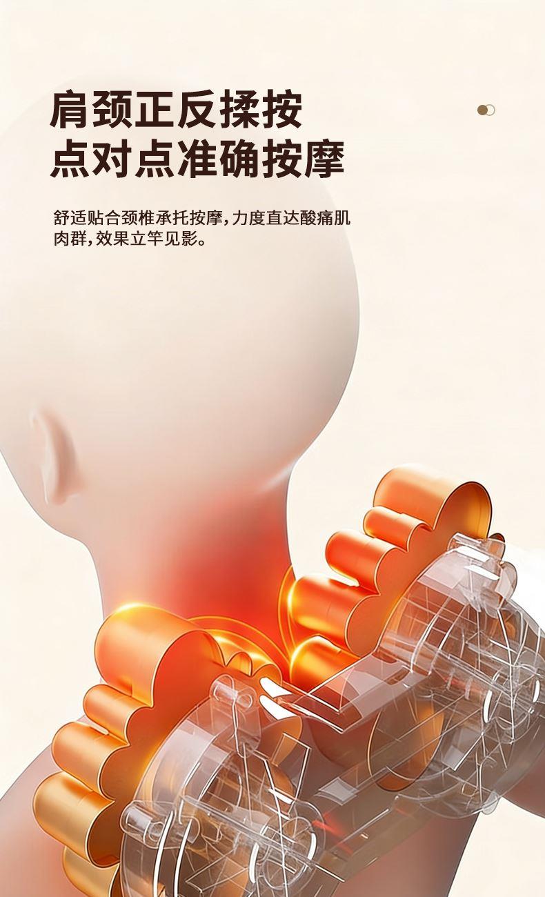 型号:WD-J01 电压:12V 24W 电池容量:1800毫安 产品尺寸:30*9*22cm 重量:1.4kg 外箱尺寸:69*50*34cm 20颗子母大小头 正反转揉捏按摩,缓解酸胀肌肉 42-45°温感热敷 三种模式,三挡力度调节 多部位使用,舒爽放松到位 方寸枕间,揉碎所有肩颈的疲惫与紧绷