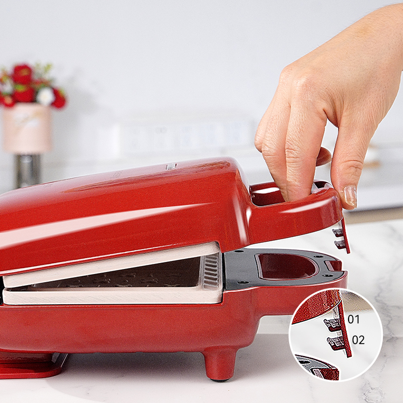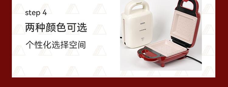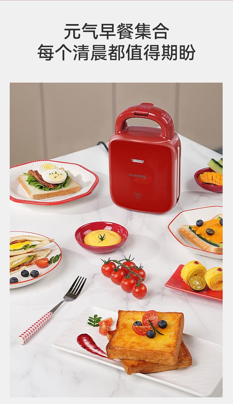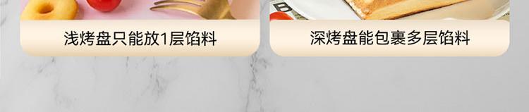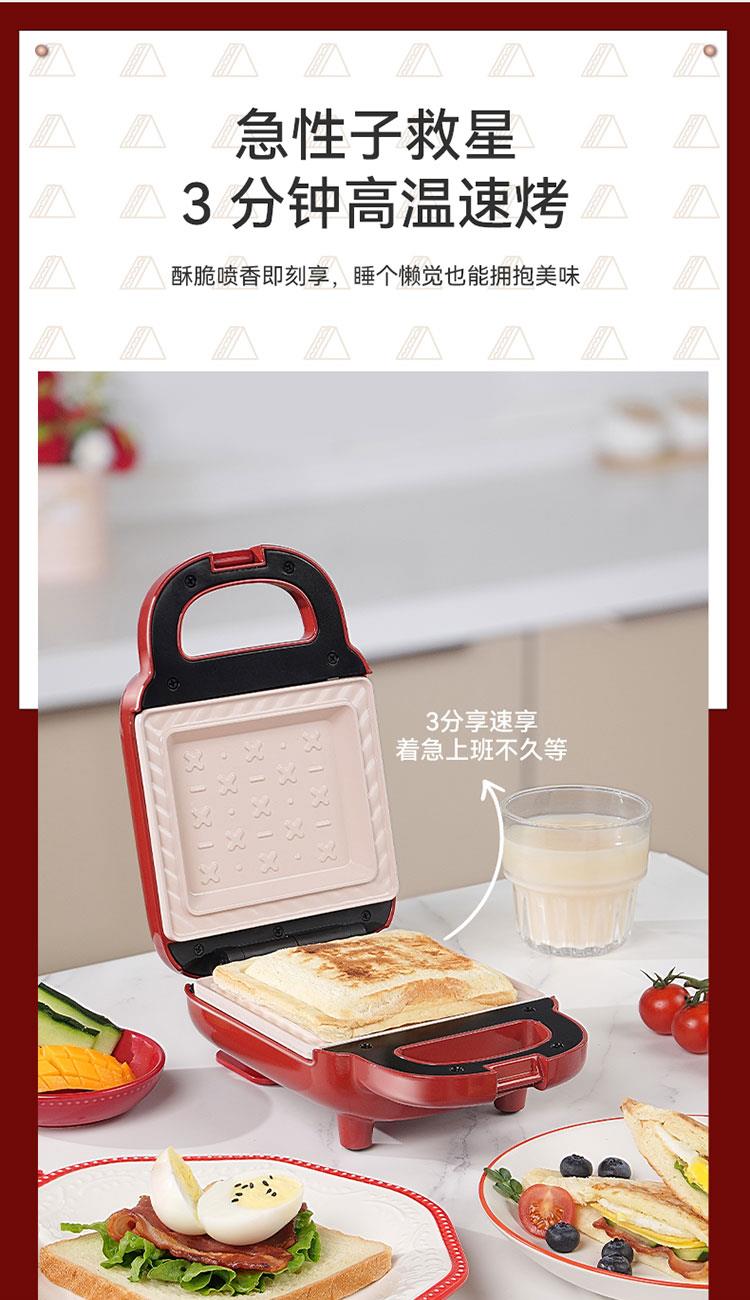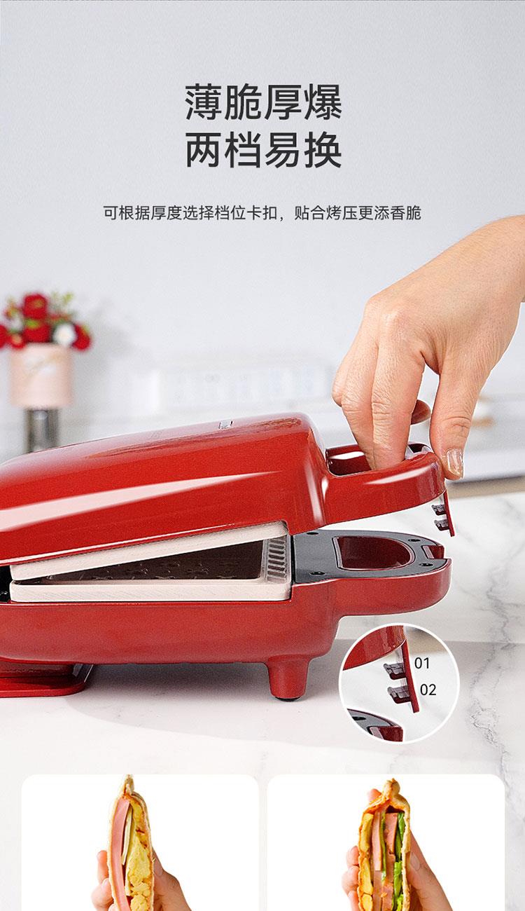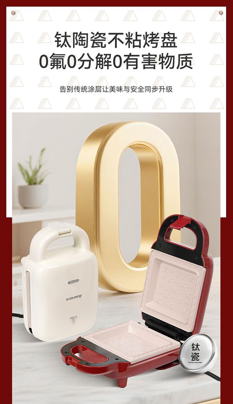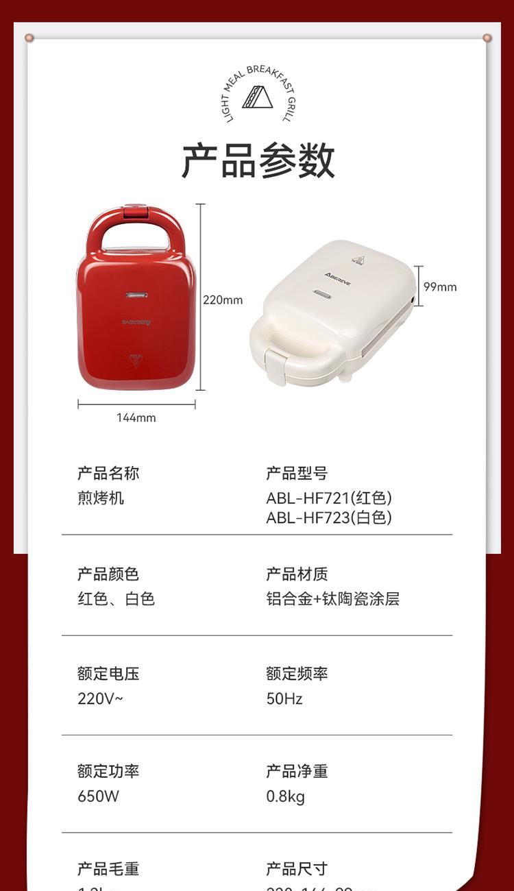 产品颜色:白色 产品材质:铝合金+钛陶瓷 额定电压:220V~ 额定频率:50Hz 额定功率:650W 产品净重:0.9kg 产品毛重:1.2kg 产品尺寸:220*144*99mm 彩盒尺寸:173*124*252mm 外箱尺寸:511*361*520mm 铝合金+钛陶瓷涂层不沾盘,安全稳定耐用易清洗 ◁ 升级加宽自动封边,严丝合缝锁馅料 ◁ 两档可调,上下同步加热,3min高温速烤 ◁ 一机多样,多款美食轻松搞定 ◁ 小巧不占地,各种空间灵活放置