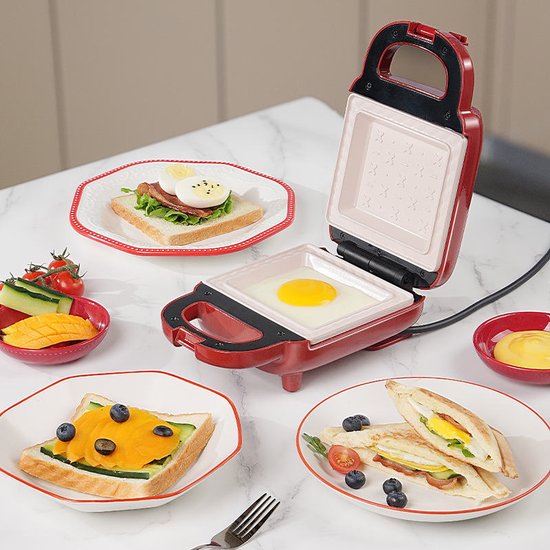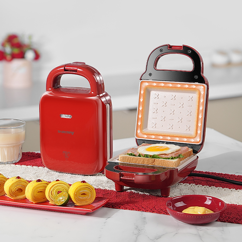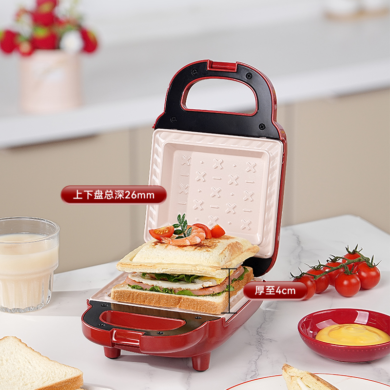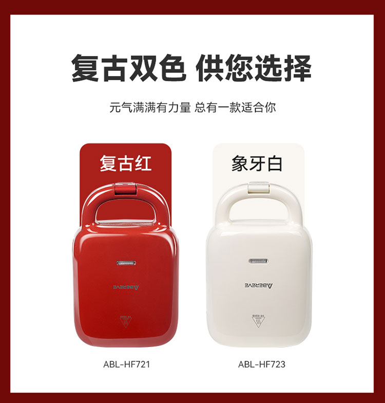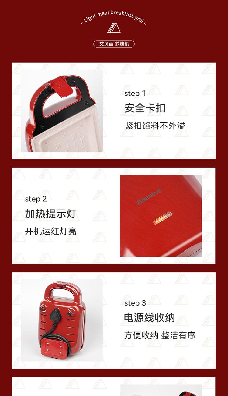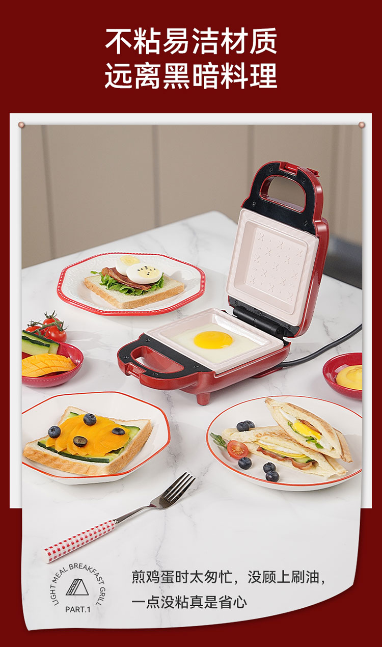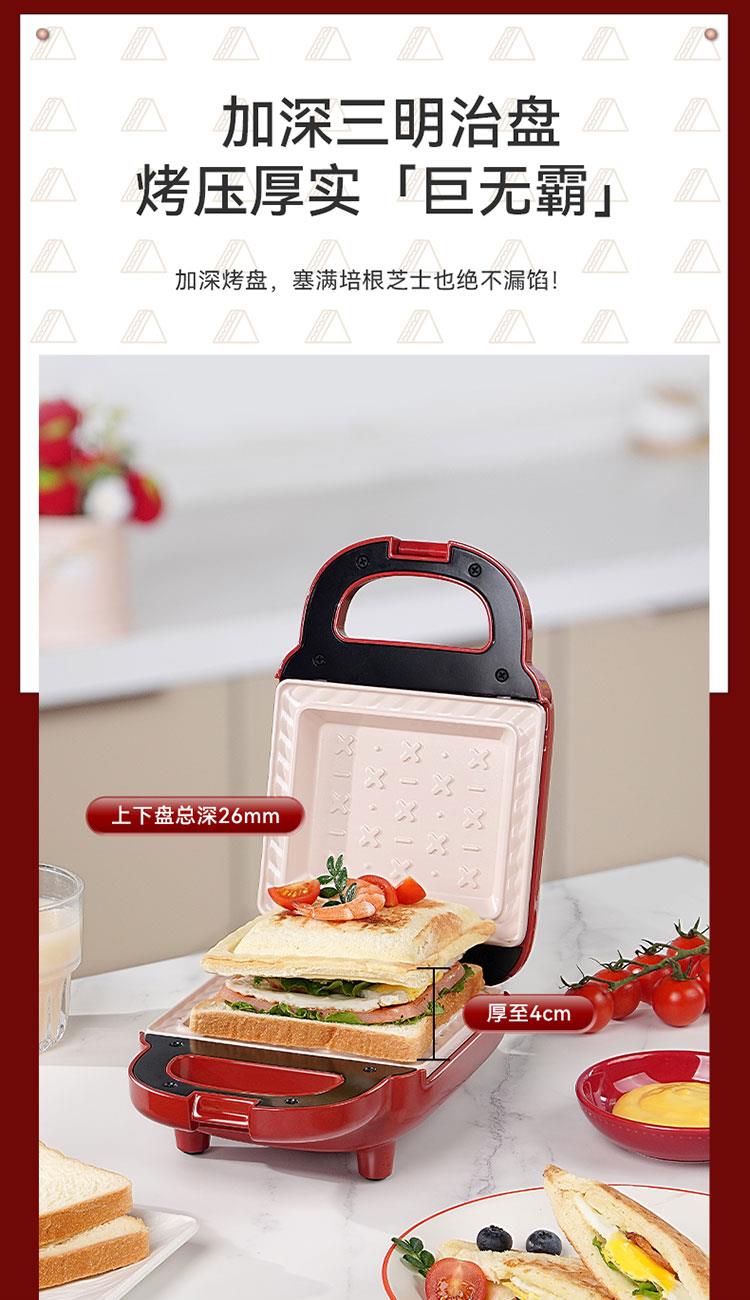产品颜色:白色 产品材质:铝合金+钛陶瓷 额定电压:220V~ 额定频率:50Hz 额定功率:650W 产品净重:0.9kg 产品毛重:1.2kg 产品尺寸:220*144*99mm 彩盒尺寸:173*124*252mm 外箱尺寸:511*361*520mm 铝合金+钛陶瓷涂层不沾盘,安全稳定耐用易清洗 ◁ 升级加宽自动封边,严丝合缝锁馅料 ◁ 两档可调,上下同步加热,3min高温速烤 ◁ 一机多样,多款美食轻松搞定 ◁ 小巧不占地,各种空间灵活放置