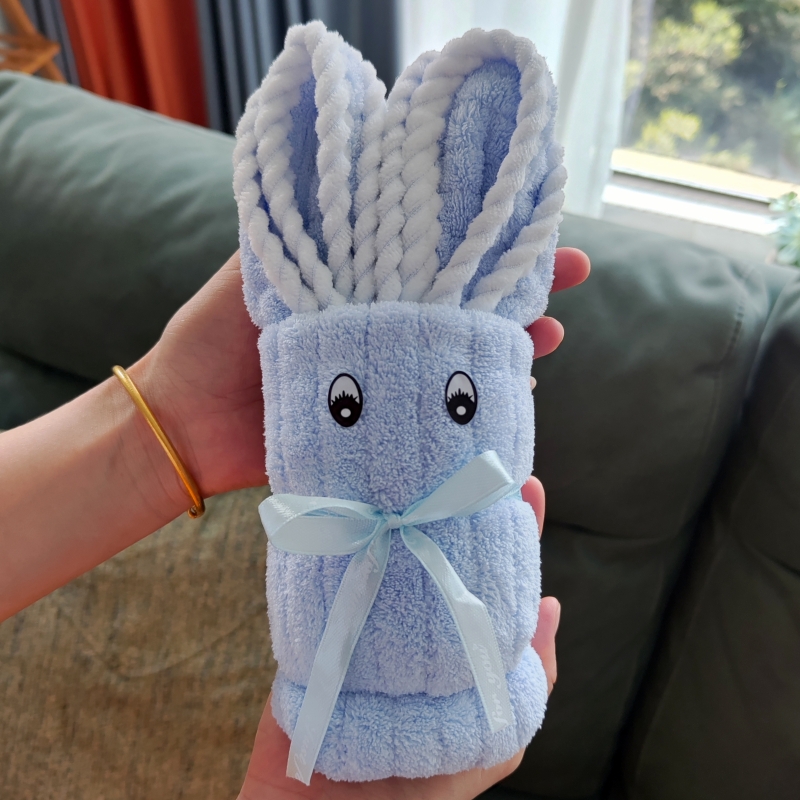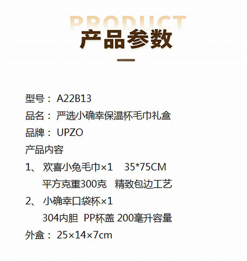 型号: A22B13 产品内容 1、 欢喜小兔毛巾×1 35*75CM 平方克重300克 精致包边工艺 2、 小确幸口袋杯×1 304内胆 PP杯盖 200毫升容量 外盒: 25×14×7cm 欢喜小兔大毛巾 升级精美包边 波浪纹面料 小确幸主题杯 设计融入祝福语 产品撞色搭配 时尚美观