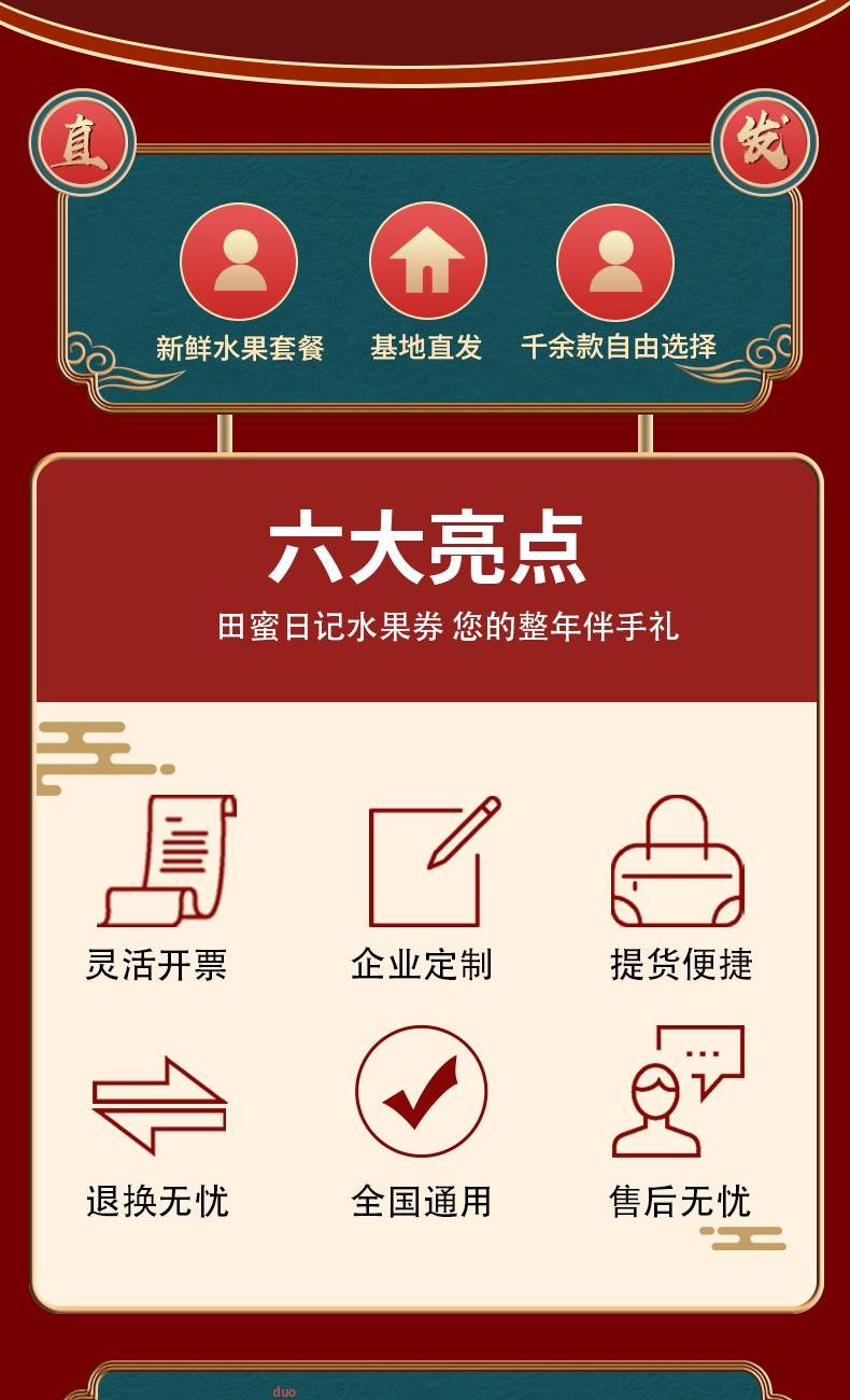 田蜜日记专业给各综合性平台、礼品公司、卡册公司等渠道提供全年水果一件代发及节假日项目集采业务,目前已对接了如:得力、史泰博、齐心等三百多个平台及渠道,整年水果单品丰富,可开专票、可授权、提供京东比价链接、提供主图详情页,同时发行全国通用,全年可自由兑换的田蜜日记水果提货券,全国免费配送到家,长期有效,售后全包