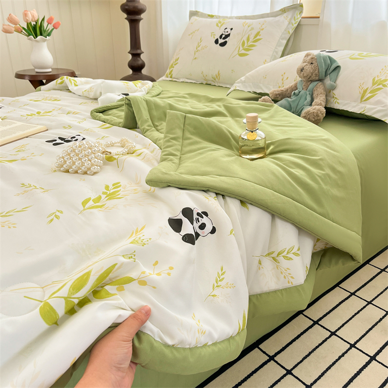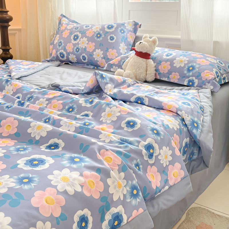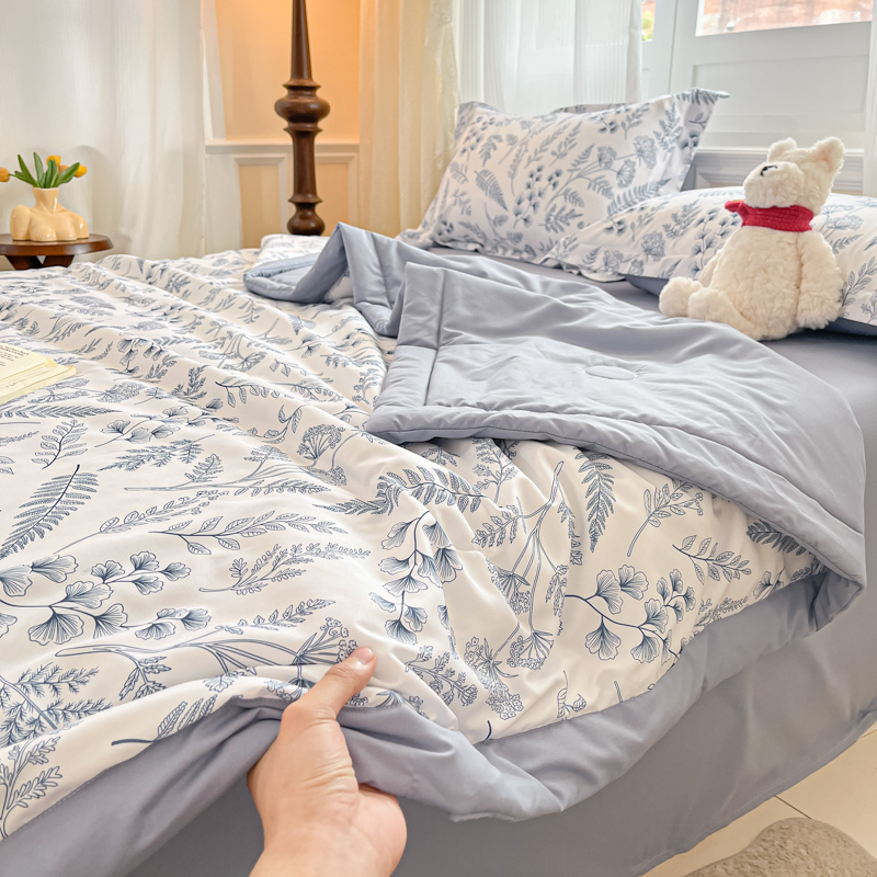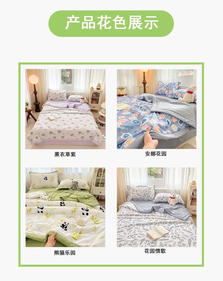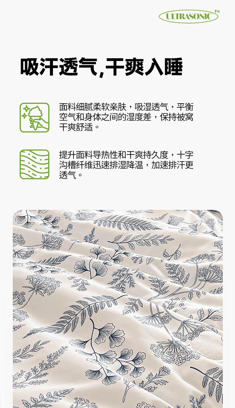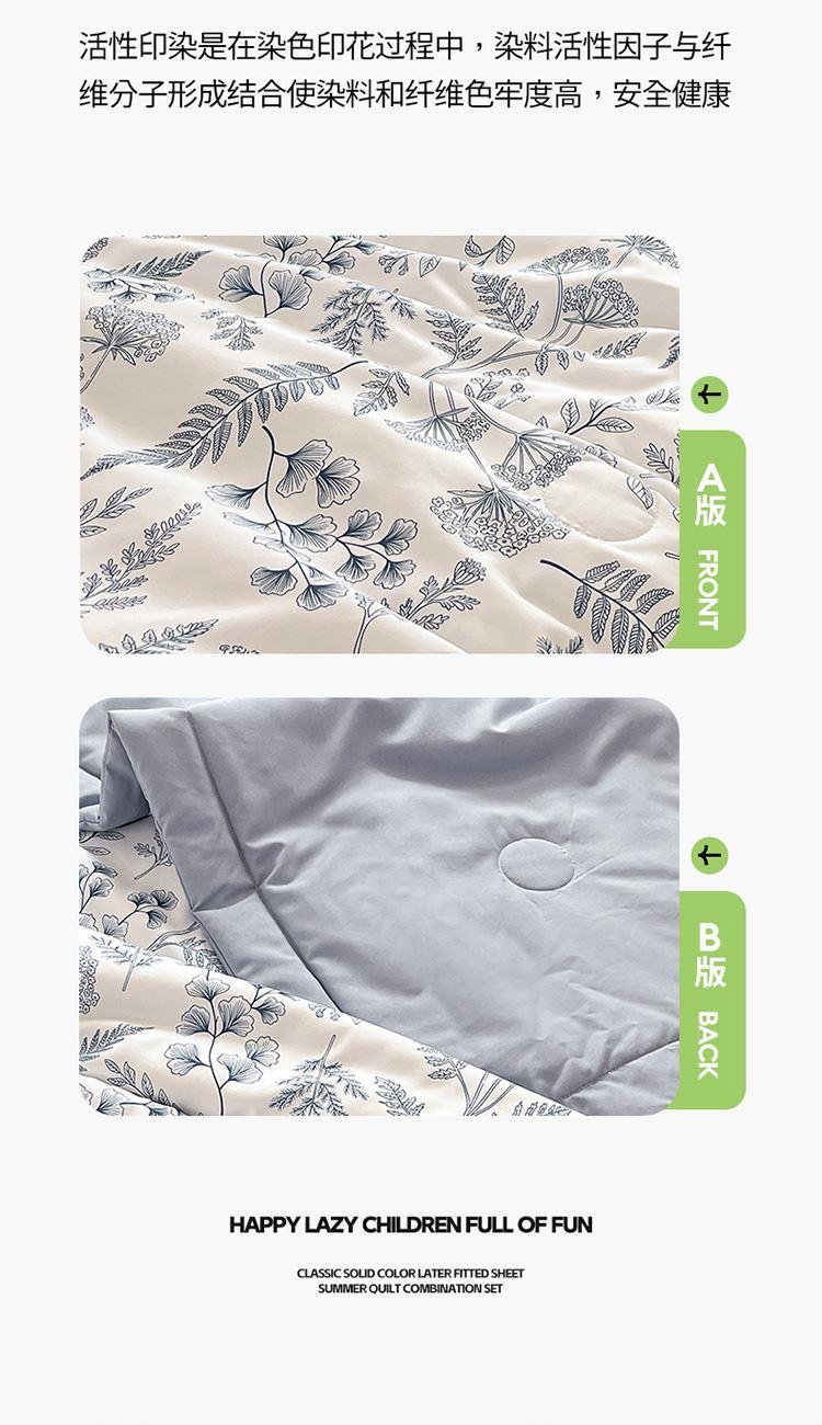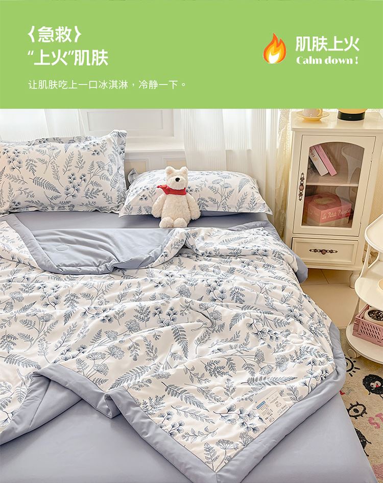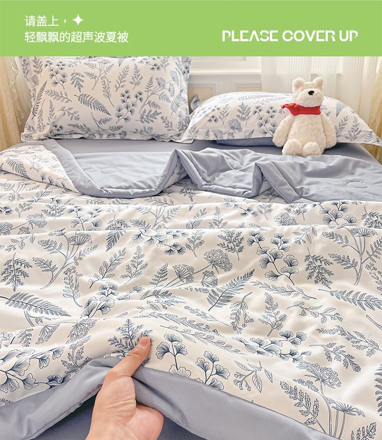 规格:150*200cm 面料:泡泡纱(聚酯纤维) 填充:羽丝棉(聚酯纤维) 重量:0.8kg 卖点: 1、云感柔软,贴身超亲肤,做工扎实,耐用好打理 2、透气不闷汗,夏天好眠,轻薄不压身,空调房必备 3、小清新颜值,卧室更清爽