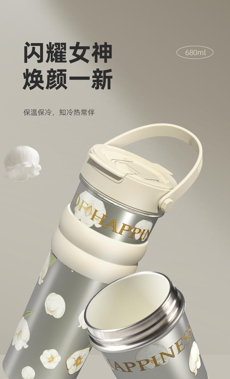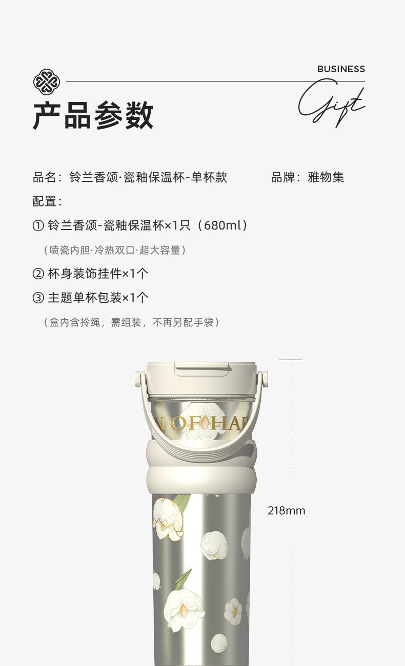 ① 铃兰香颂-瓷釉保温杯×1只(680ml) (喷瓷内胆·冷热双口·超大容量) ② 杯身装饰挂件×1个 ③ 主题单杯包装×1个 (盒内含拎绳,需组装,不再另配手袋) 是懂冷暖的“补水管家” 也是装满铃兰花语的长期好物 让每口饮下都尽显瓷釉温润与职场体面