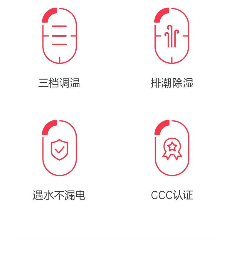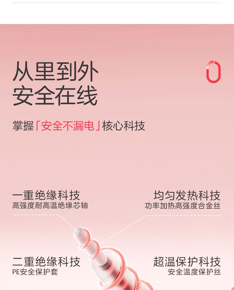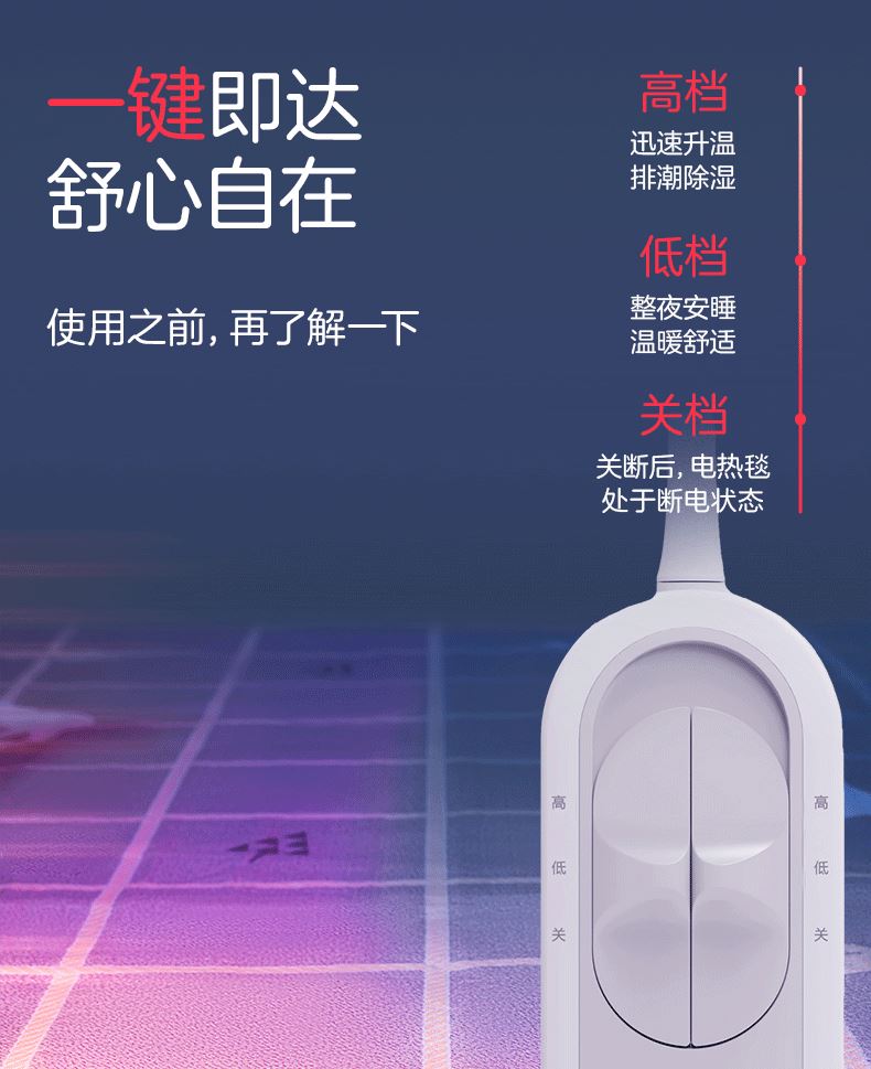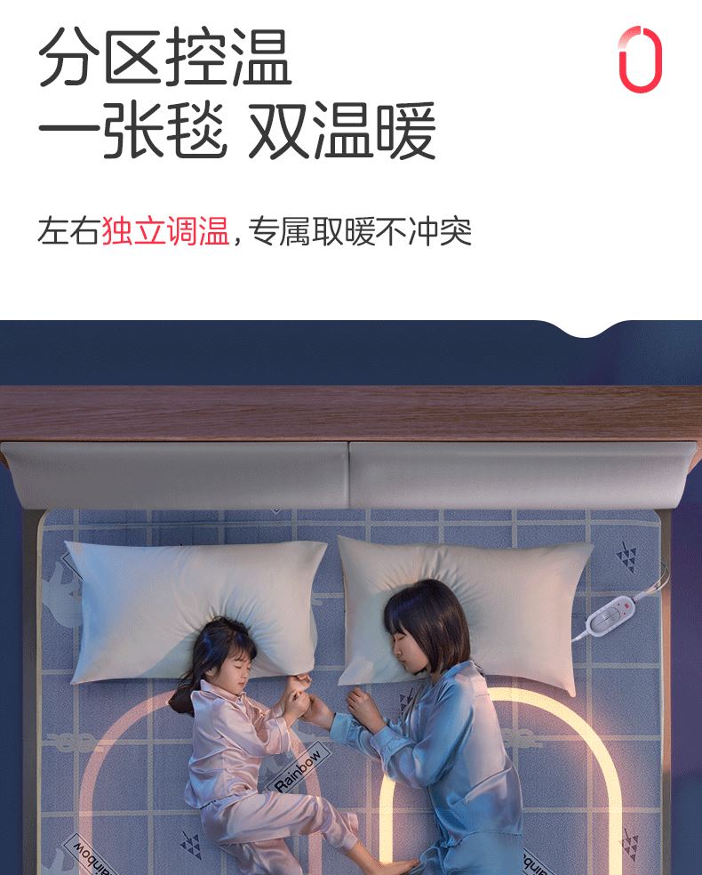 参数: 型号:TT180×150-2X 功率:110W 功能:双控双温,排潮除湿 面料:化纤 包装:无纺布袋 卖点: 1、全线路安全保护双控双温电热毯,左右独立控制,遇水遇尿不漏电 2、采用双层螺旋发热线和特别安全保护控制器,实现高温断电保护 3、低能耗,每晚不到一度电