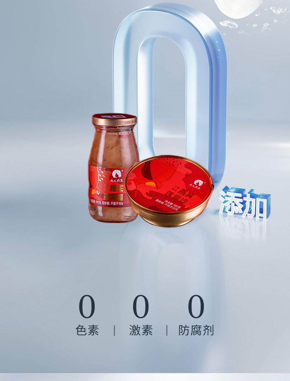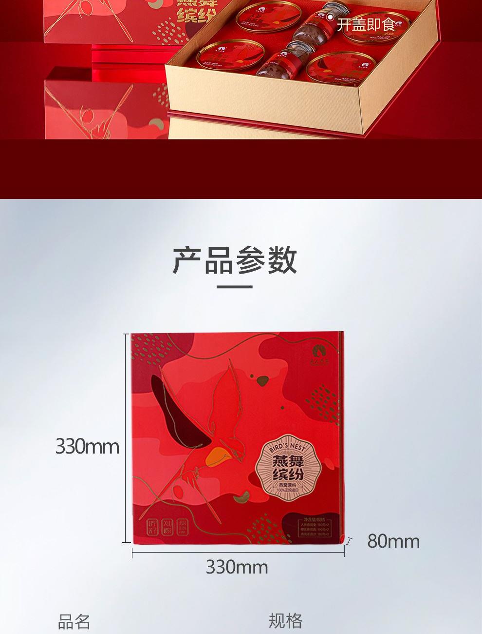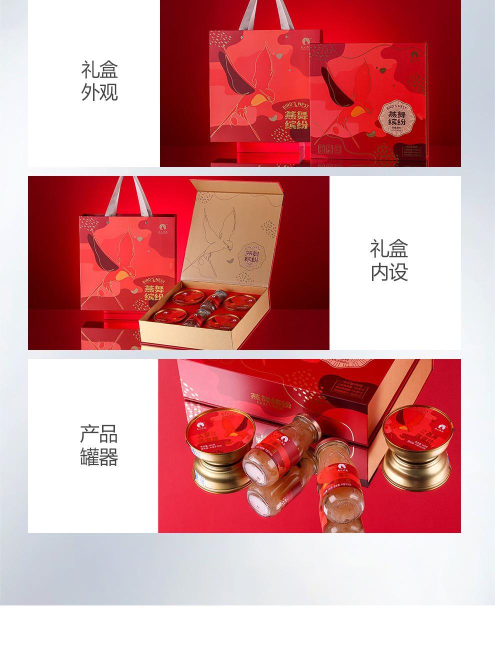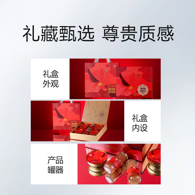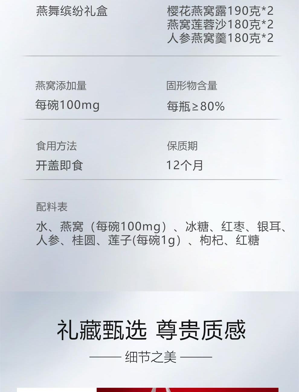 规格:樱花燕窝露190克*2、燕窝莲蓉沙180克*2、人参燕窝羹180克*2 卖点:口感细腻顺滑,燕窝的软糯与樱花的清香相互融合,给人带来清新、甜美的味觉体验。结合了燕窝的滋补与莲蓉的香甜。燕窝的优质蛋白质和莲蓉中的莲子、糖等原料相互搭配,莲子含有丰富的蛋白质、钙、磷、铁等营养成分。 将人参的滋补功效与燕窝的营养成分相结合。