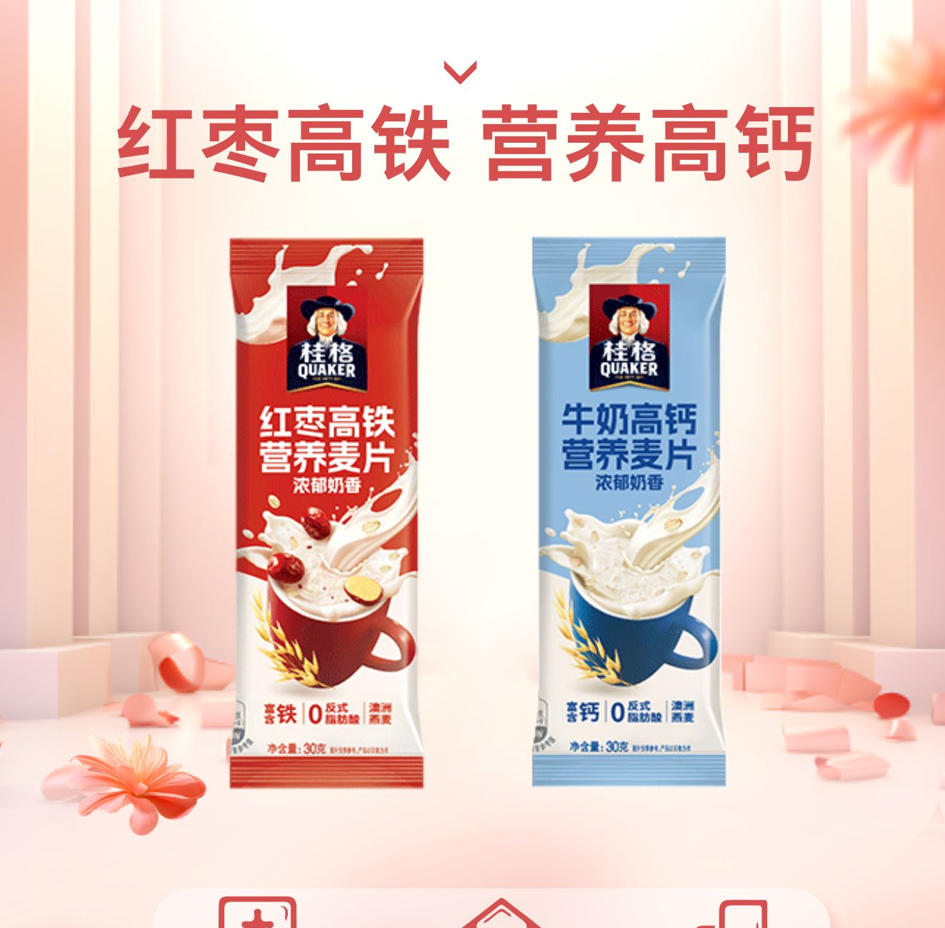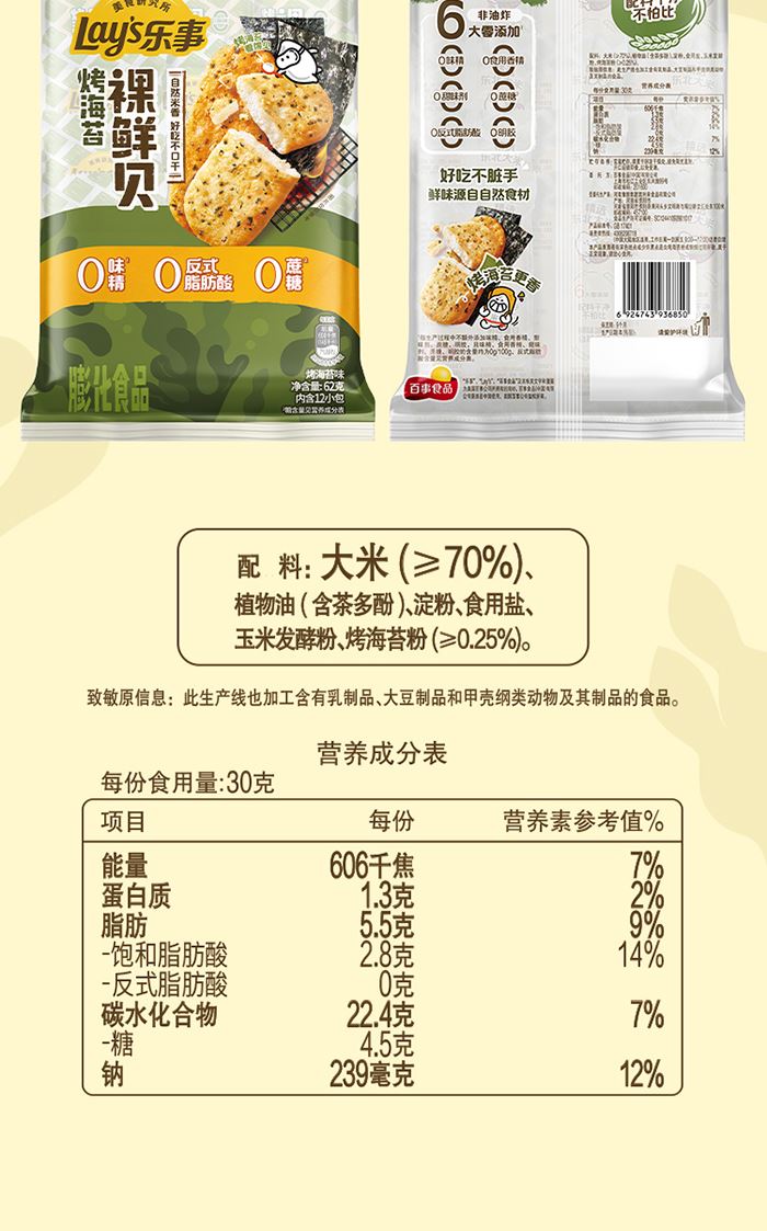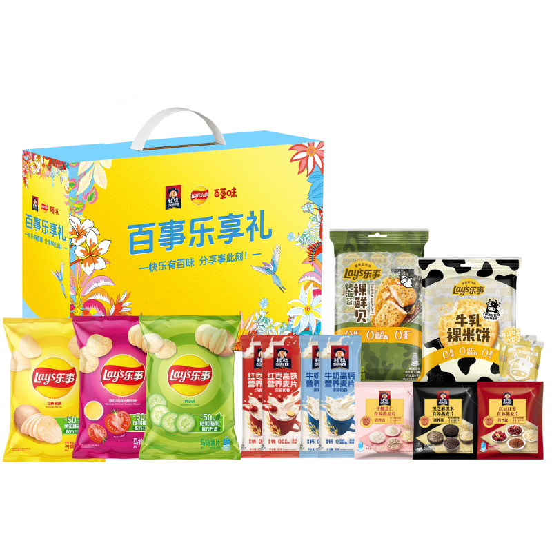 乐事薯片40g*3包(口味随机) 桂格黑芝麻黑米食养燕麦片30g*1 桂格红豆红枣食养燕麦片30g*1 桂格生椰薏仁食养燕麦片30g*1 桂格牛奶高钙燕麦片30g*2 桂格红枣高铁燕麦片30g*2 乐事裸鲜贝62g鲜香原味/海苔味*1包口味随机 乐事牛乳裸米饼 60g *1