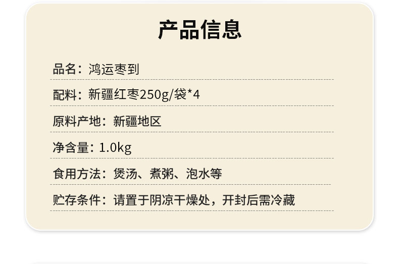 产品配置: 新疆红枣250g*4 净含量:1.0Kg 礼盒尺寸:44*11*27cm