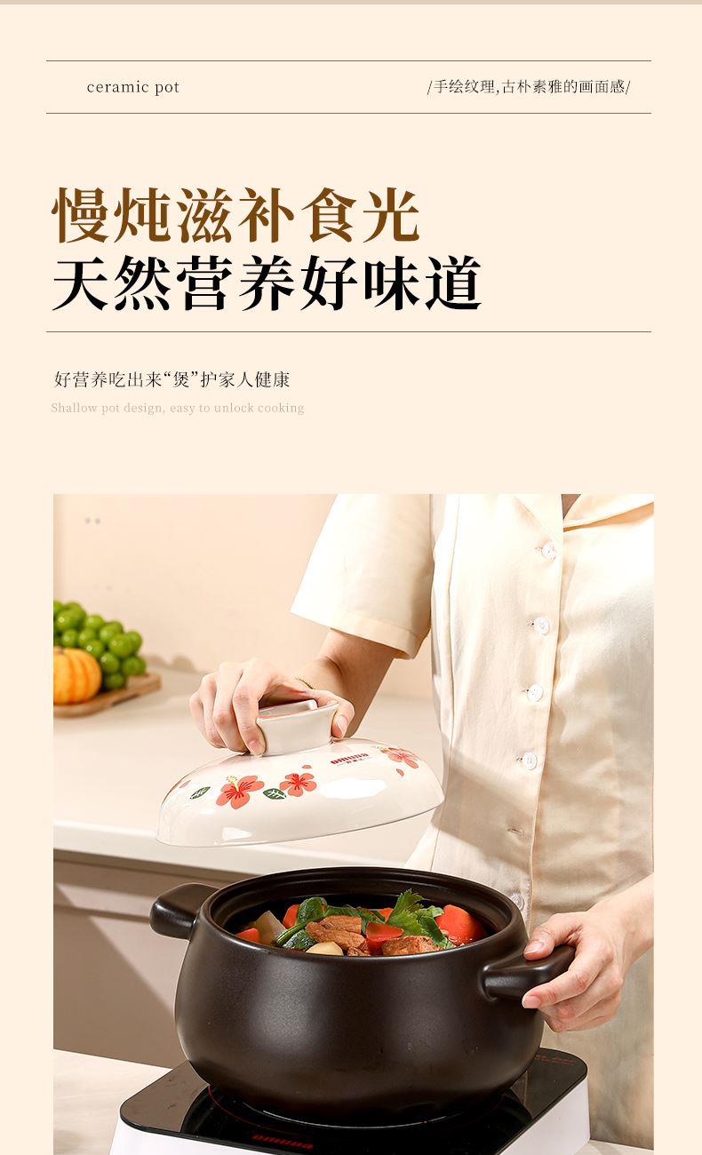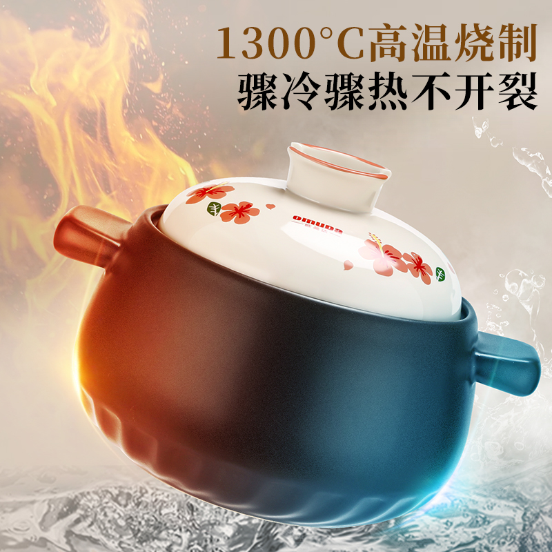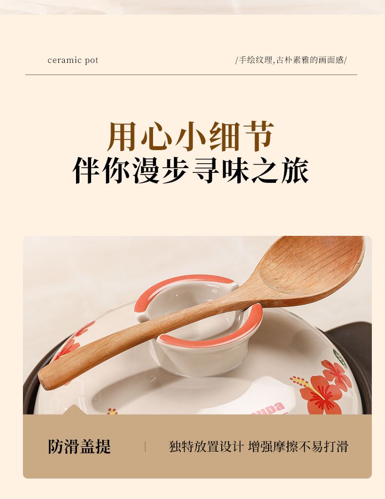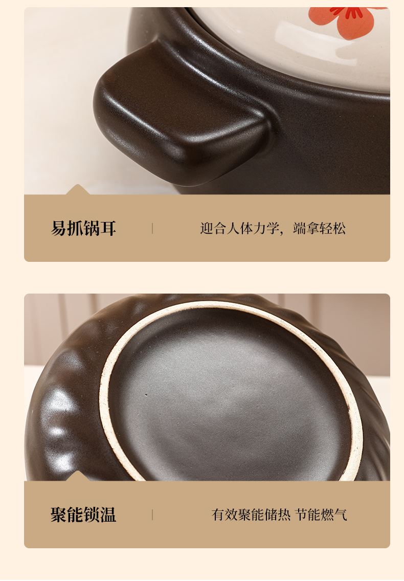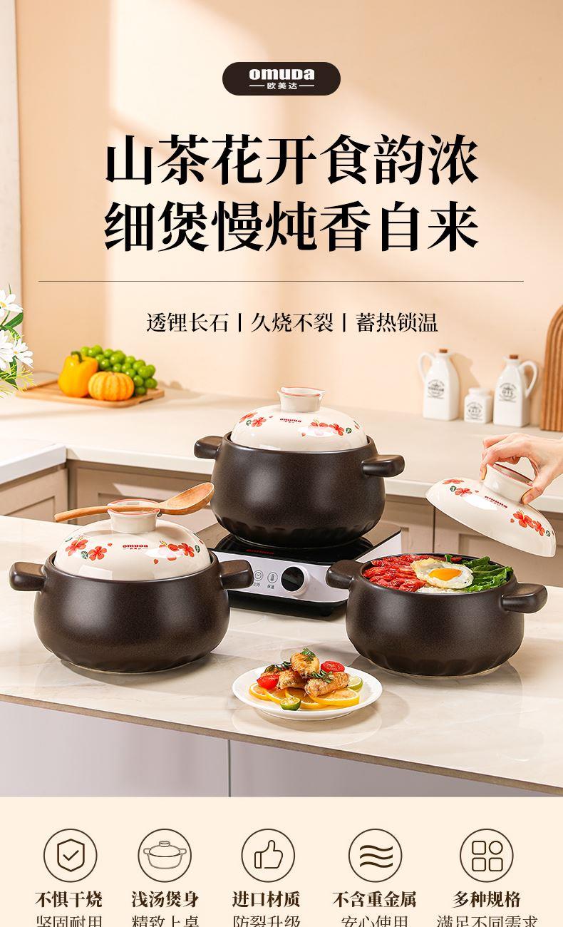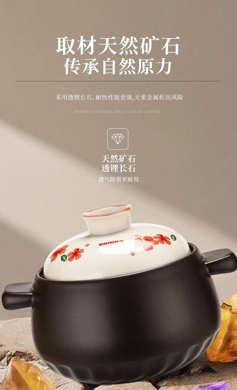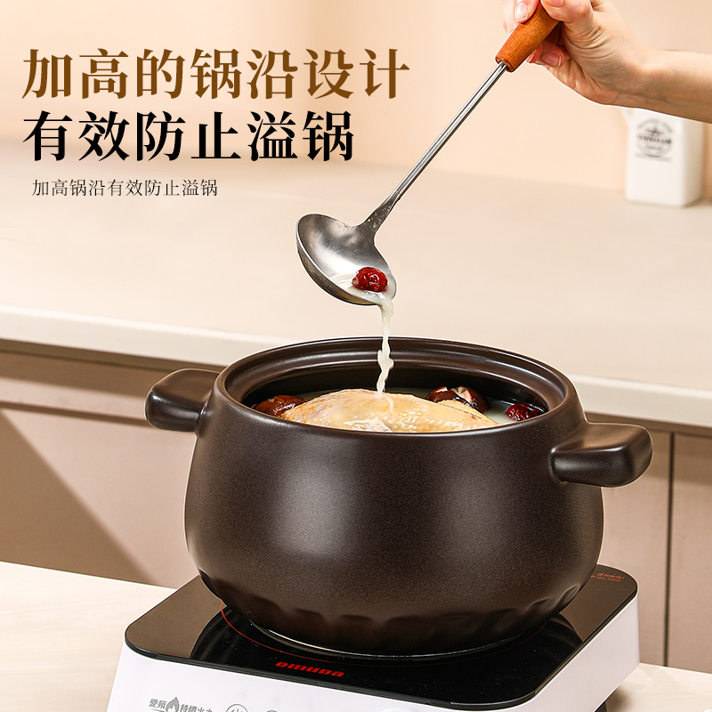 材质:高岭土+透锂长石+耐热陶瓷 功能:① 采用优质进品透锂长石,经高温烧制,锅体质坚硬厚实,能够很好的满足烹饪过程的急冷急热考验 ② 加厚耐热手柄,防滑防烫,符合人体力学设计,易拿易端更人性化 ③ 盖帽采用凹槽设计,可放置汤勺 ④ 采用高强度釉面,不含有害涂层,抗酸碱耐腐蚀,无异味,易清洗,不掉色 ⑤加高锅沿设计,有效防止溅油溢汤,烹饪更加安心,设计优美,器形美观大方