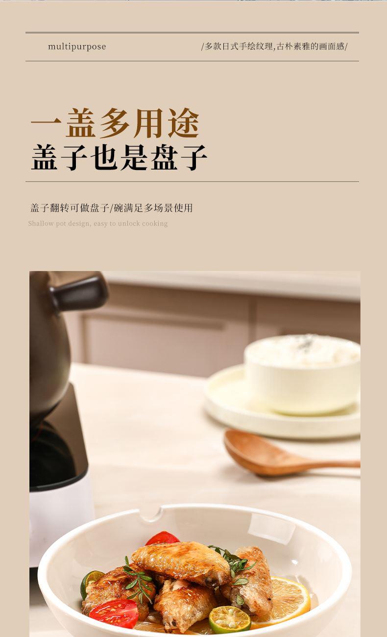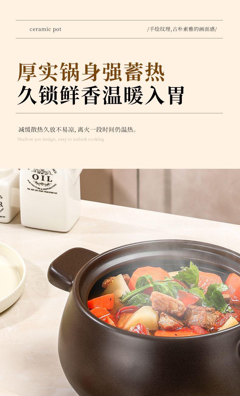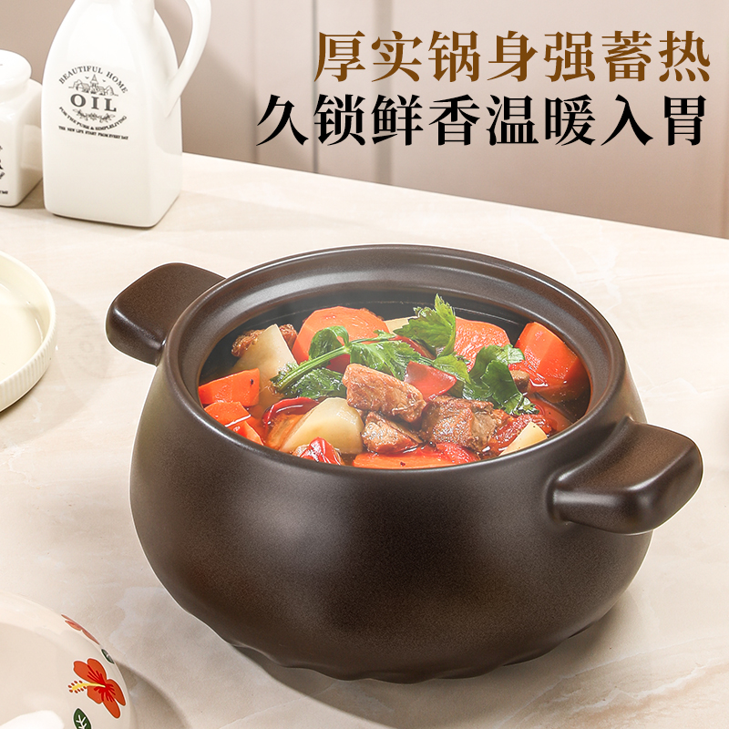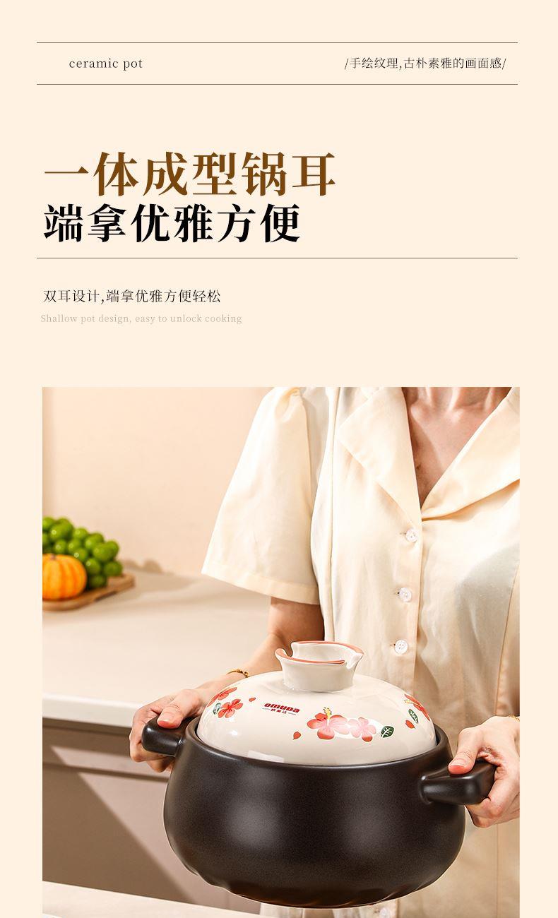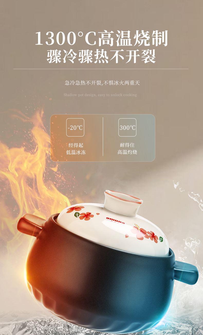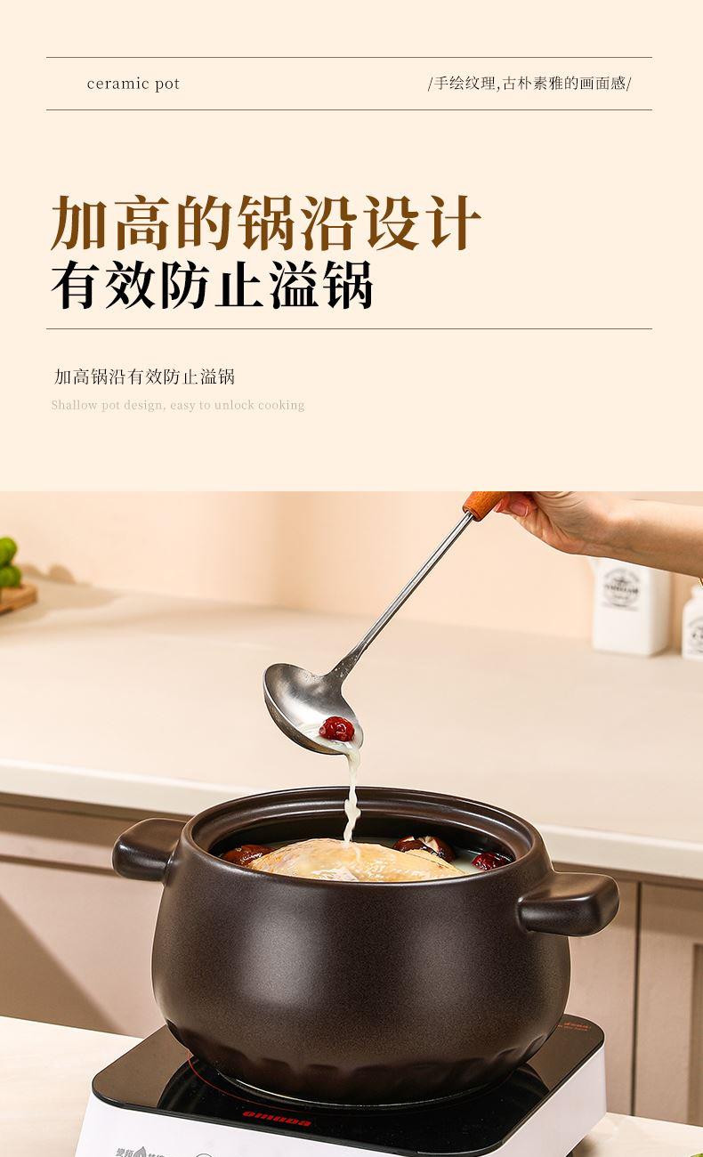 材质:高岭土+透锂长石+耐热陶瓷 功能:① 采用优质进品透锂长石,经高温烧制,锅体质坚硬厚实,能够很好的满足烹饪过程的急冷急热考验 ② 加厚耐热手柄,防滑防烫,符合人体力学设计,易拿易端更人性化 ③ 盖帽采用凹槽设计,可放置汤勺 ④ 采用高强度釉面,不含有害涂层,抗酸碱耐腐蚀,无异味,易清洗,不掉色 ⑤加高锅沿设计,有效防止溅油溢汤,烹饪更加安心,设计优美,器形美观大方
