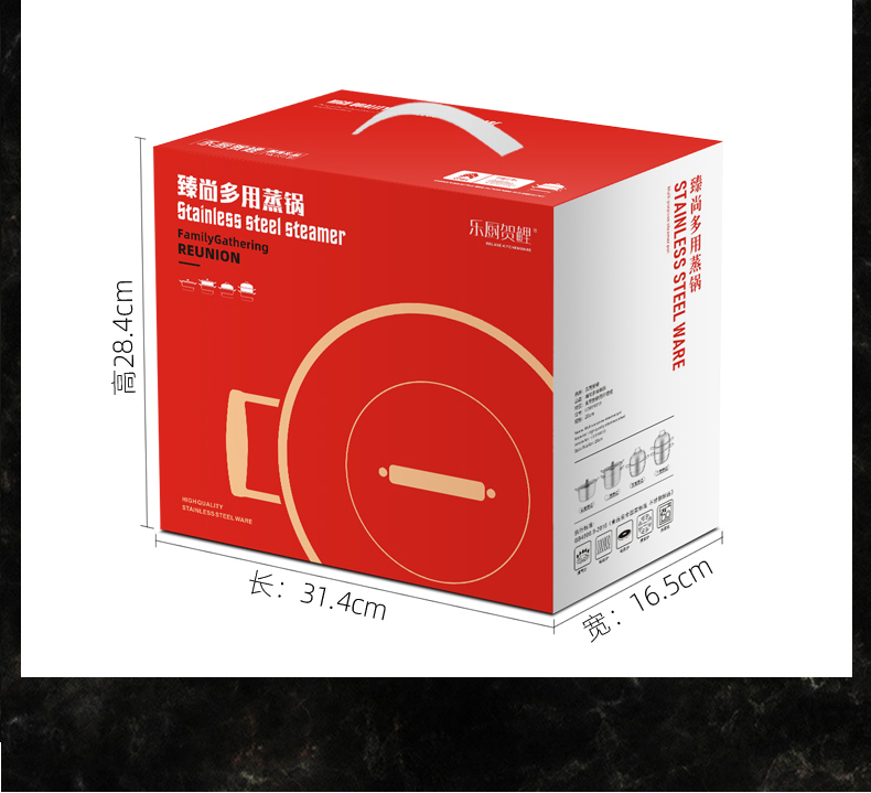 产品规格:28cm 产品材质:410不锈钢 包装方式:opp透明袋+手提彩盒 彩盒尺寸:31.4*16.5*28.4CM 外箱尺寸:72*65*59cm 创造高业绩,送礼心坎里,好产品,助您开门红事半功倍。 加深底锅,容量超大,通体砂光拉丝工艺,外观尊贵。 蒸片自由拆卸,满足家族使用可蒸可煮, 搭配玻璃上盖,掌握烹饪进度, 红礼盒包装,时尚大气,是您引流拓客,宣传必备礼品。
