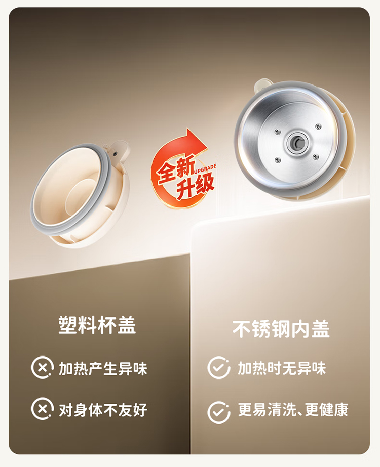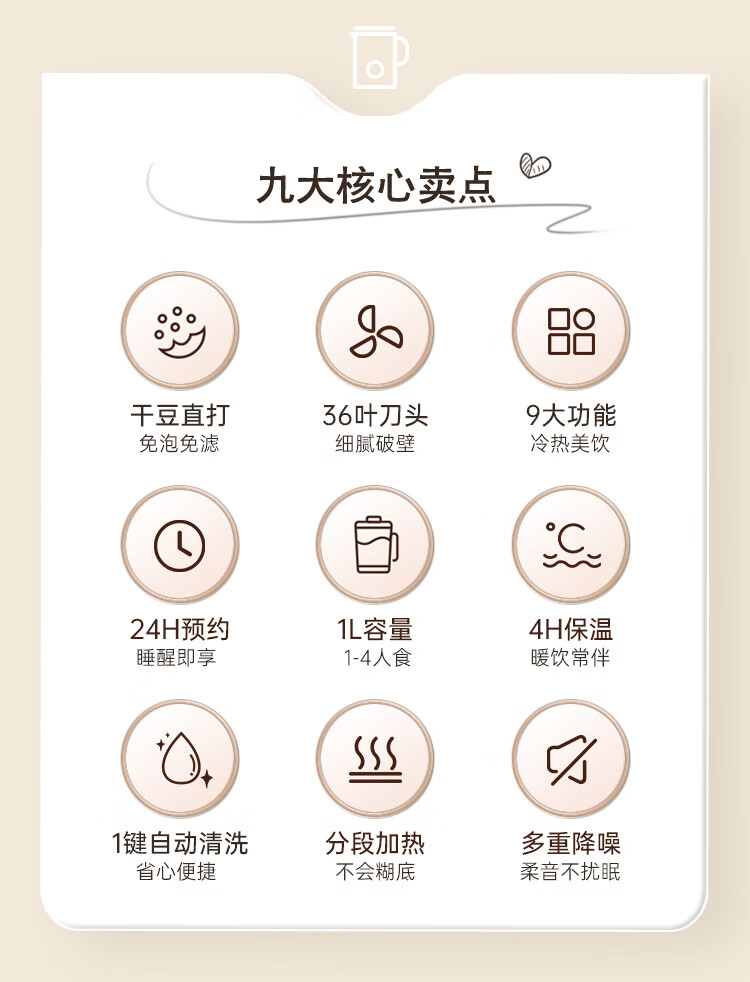 电动功率:210W 加热功率:500W 毛 重:1.7kg 净 重:1.3kg 容 量:1L 大容量,可供1-4人使用。 刀组件:36叶精钢刀组,细腻无渣。 预约功能:24H小时超长智能预约 面板功能 :8大预设智能菜谱,营养美味不重样。 豆浆:干豆直打,免泡免滤,便捷香浓无渣。 电机:5425电机 材质:不锈钢304钢桶,无涂层更安心更健康。 清洗方便:一键清洗,快速便捷。 多重安全保护:开盖保护,避免机器误操作,安全放心使用