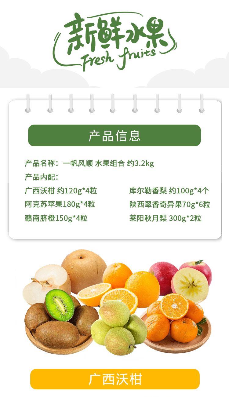 广西沃柑 约120g*4粒 库尔勒香梨 约100g*4个 新疆糖心苹果180g*4粒 陕西翠香奇异果70g*6粒420g 赣南脐橙150g*4粒 莱阳秋月梨 300g*2粒