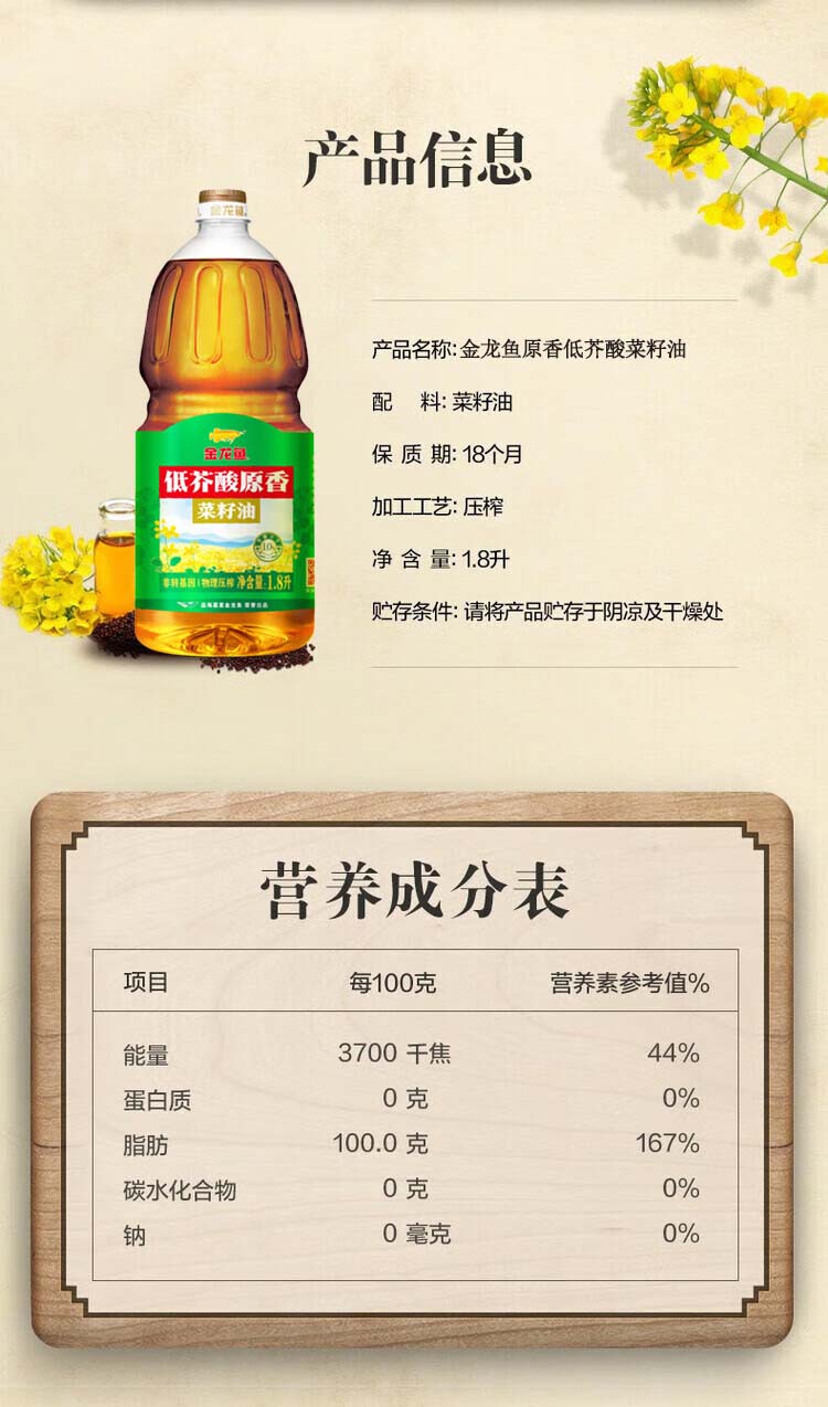 金龙鱼|低芥酸原香菜籽油1.8L